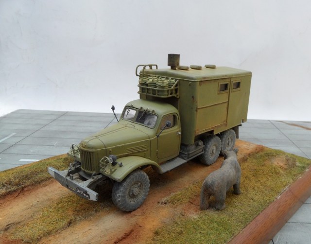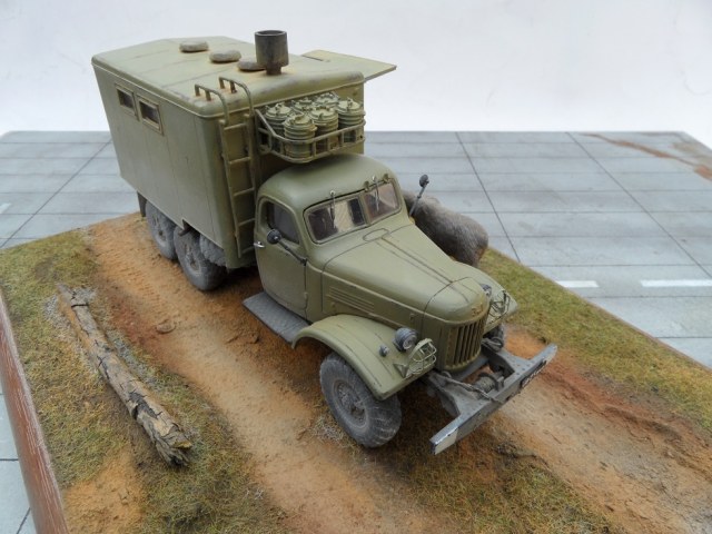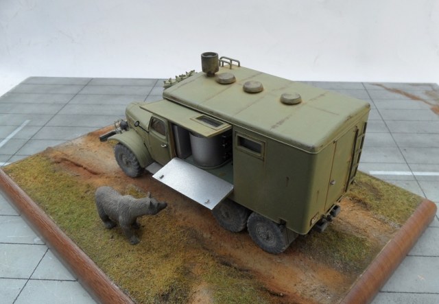 Всем привет! Представляю новинку от AVD Models смоляной серии- ПАК 170 на базе Зил 157. Сама модель выполнена в стандартном исполнении от AVD Models, а кунг из смолы. Модель очень интересная,ведь это не просто пустой кунг, а кунг с интерьером копией настоящей полевой кухни. Внутри разместились столы, полки, котел печь, умывальник с мыльницей и раковина, боковые створки подвижные, вы можете открыть чтоб посмотреть что внутри , а потом закрыть их, очень интересно! Отлито все отлично, облой очищается легко, его не так и много . Из доработок травленые решетки перед фарами,ну и для антуража использовал медведя, который пришел на запах из леса, хозяин тайги разогнал поваров- водителей и собирается поесть в кухне). Окрашена Мотип, пигменты Зип ,Миг. Приятного просмотра!
