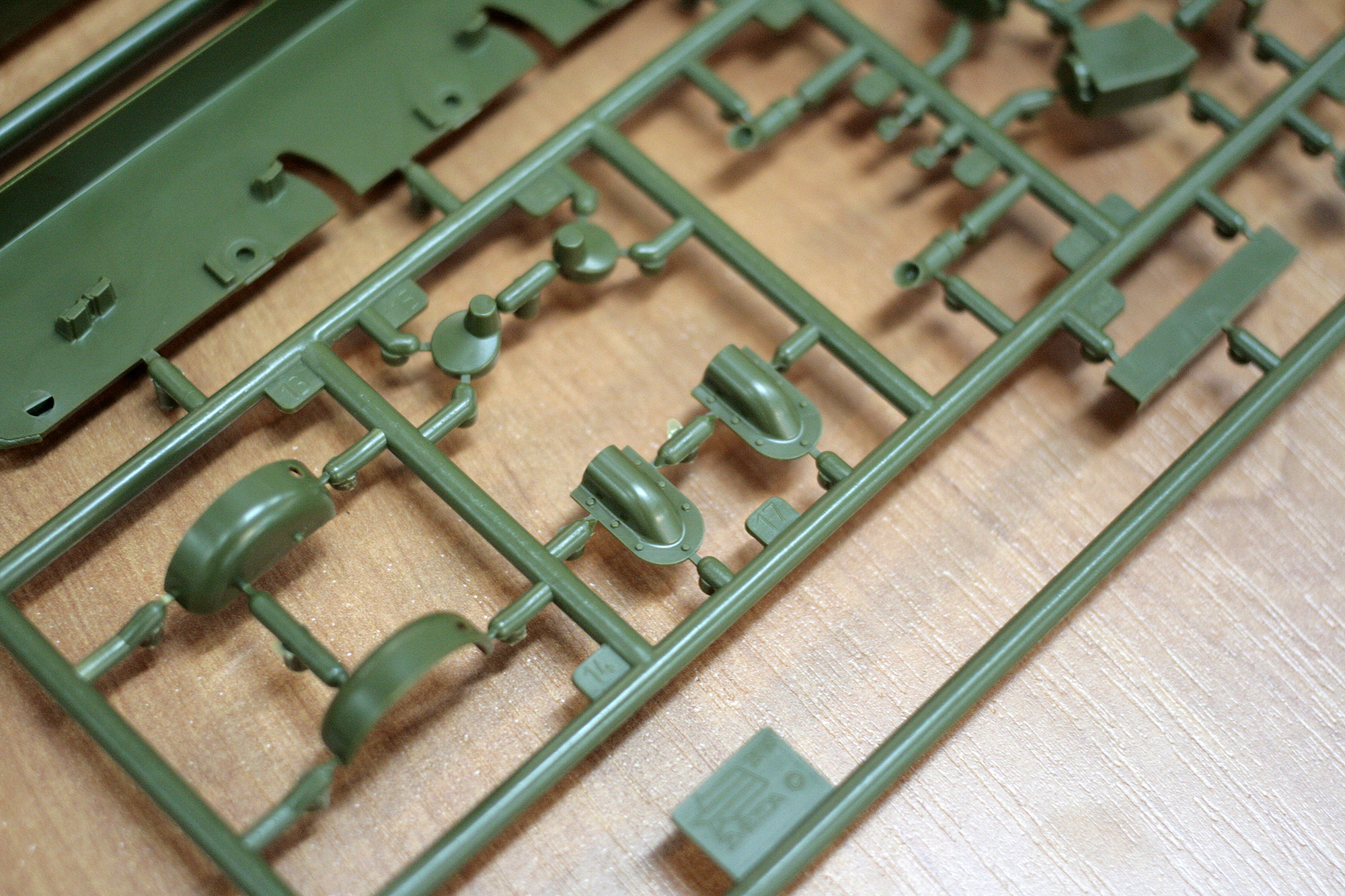 В наборе восемь литников из зеленого полистирола и два - из черного. Не смотря на странное предубеждение - пластик вполне приятный в работе, хорошо клеится и обрабатывается. Довольно мягкий, но это дело вкуса и привычки. Кому нравится, кому-то - нет.