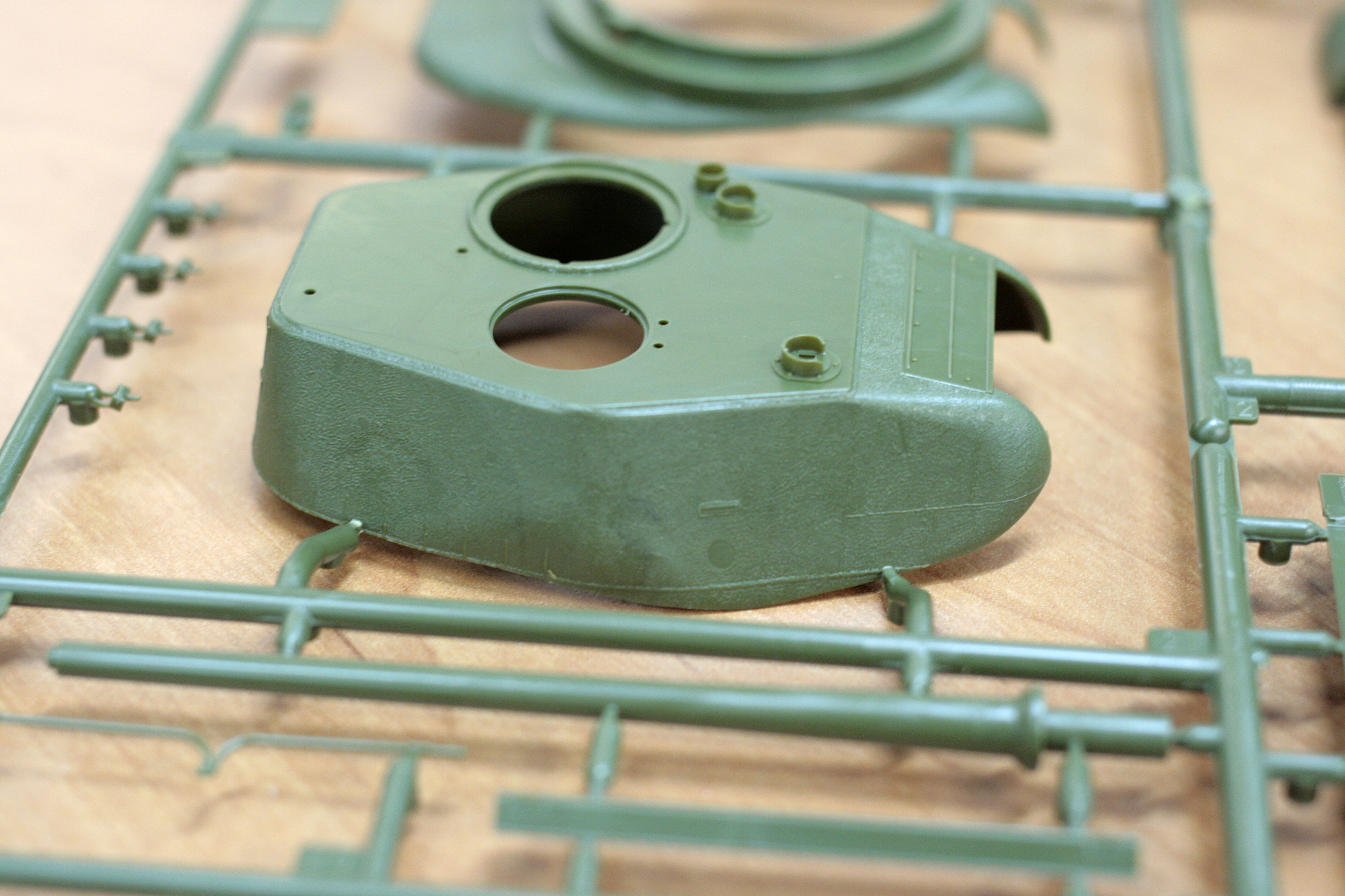 Не самым удобным образом разбита на детали башня. Литьевой шов идет то по стыку деталей, то пересекает его, в лобовой части башни. При зашкуривании стыка шов пострадает и его придется восстанавливать. Как и фактуру литой брони.