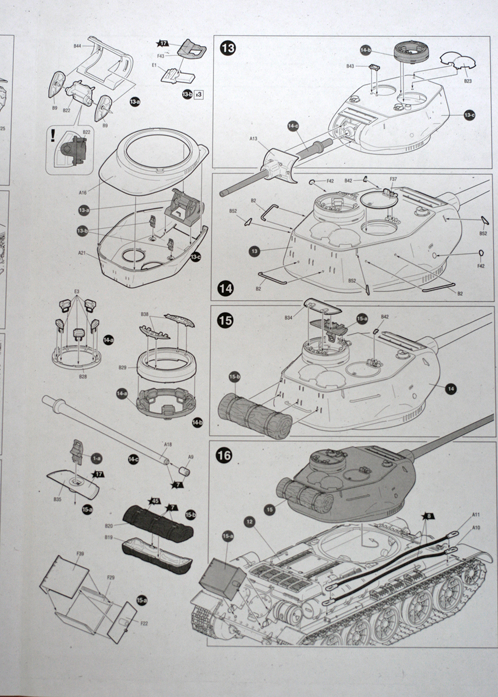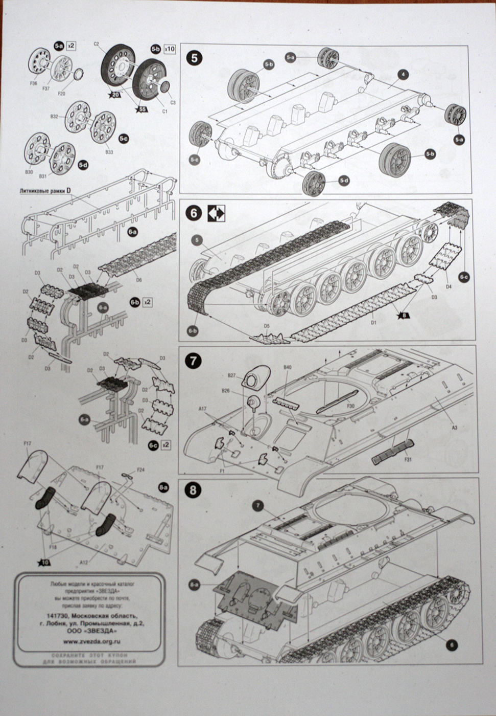 4) Сама компановка деталей дает возможность предполагать, что, возможно, Звезда сделает модель и Т-34-76. Думаю так, потому что верх корпуса выполнен на одном литнике с башней, нижняя часть корпуса - отдельно. Т.е. теоретически возможно сделать новый литник, например, с верхней частью раннего корпуса и, скажем, гайкой или пирожком. Опорные катки сделаны по два (в сборе), как у Драгона или Академии. Тоже вариант: выпустит также по два катки, скажем, с внутренней амортизацией, приложить к тем, что у данной модели, и, тридцатьчетверка-гайка готова! Так же этому мнению способствует наличие двух типов бронировки выхлопных труб. Причем инструкиця не предлагает собрать или-или. Там все четко - одни используем, а про вторые даже не упоминается. Второй тип с утопленными выемками гаек встречается на фотографиях Т-34-76 с гайкой или УЗТМовской штамповкой. Так что будем надеяться на лучшее и ждать новинок от родной Звезды!