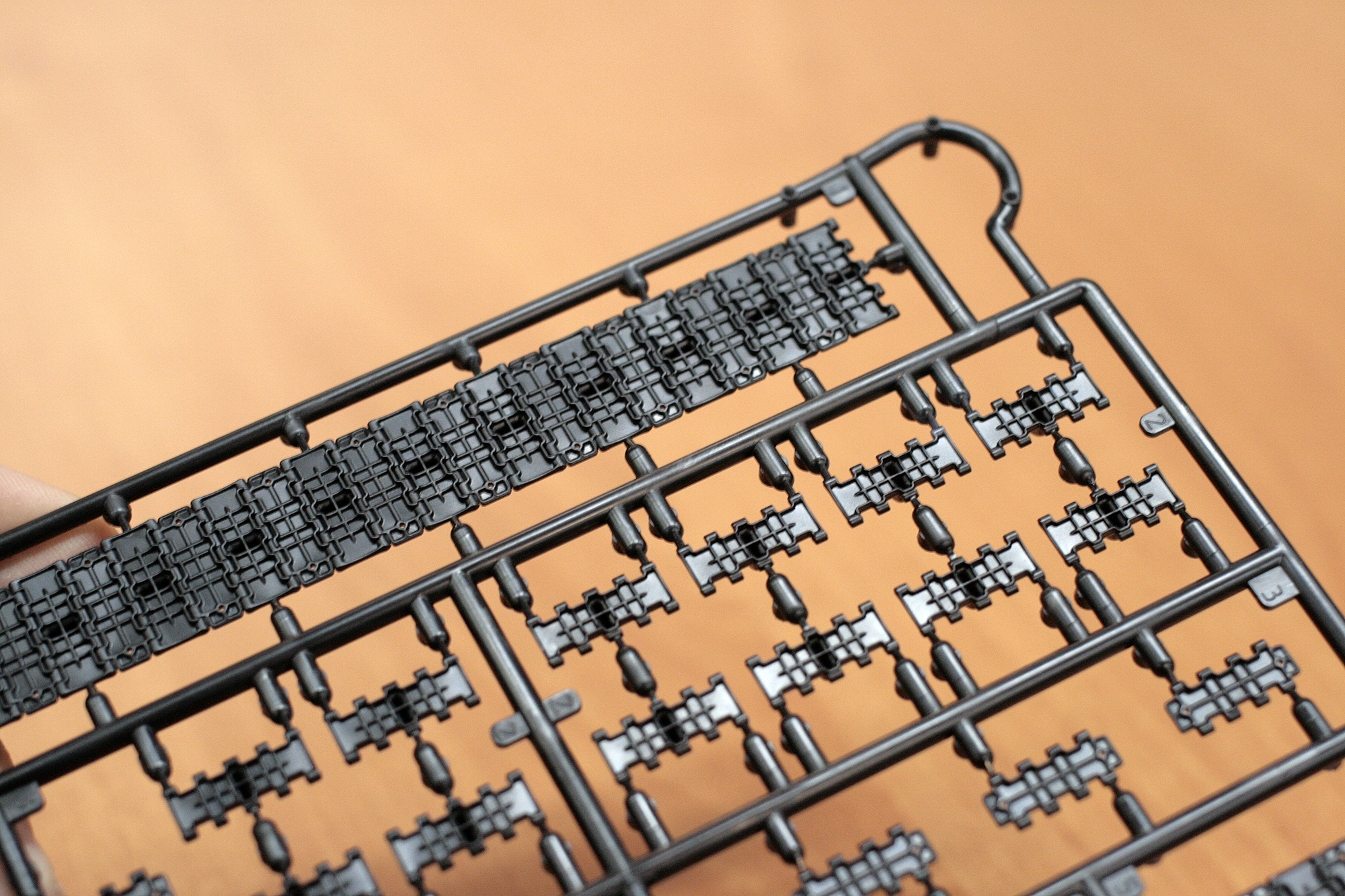 Траки - полунаборные. Отдельных траков не хватит на целые ленты, щедрости как в "Пантере" тут нет. Зато дан шаблон для сборки участков ленты вокруг ленивца и ведущего колеса. Учтите, шаблон только для участков ленты, он короче ходовой части и собрать всю верхнюю часть ленты по нему не получится!