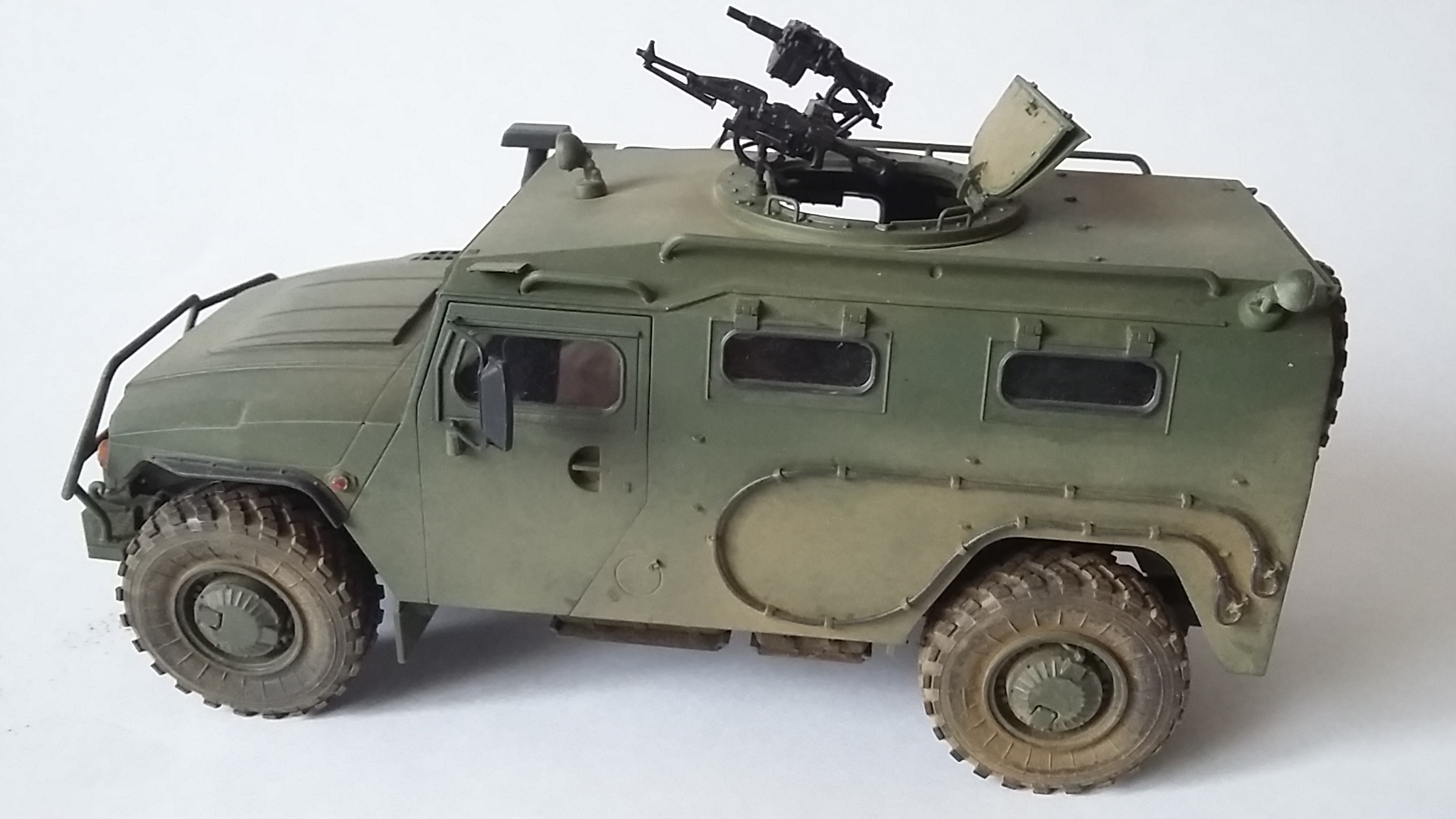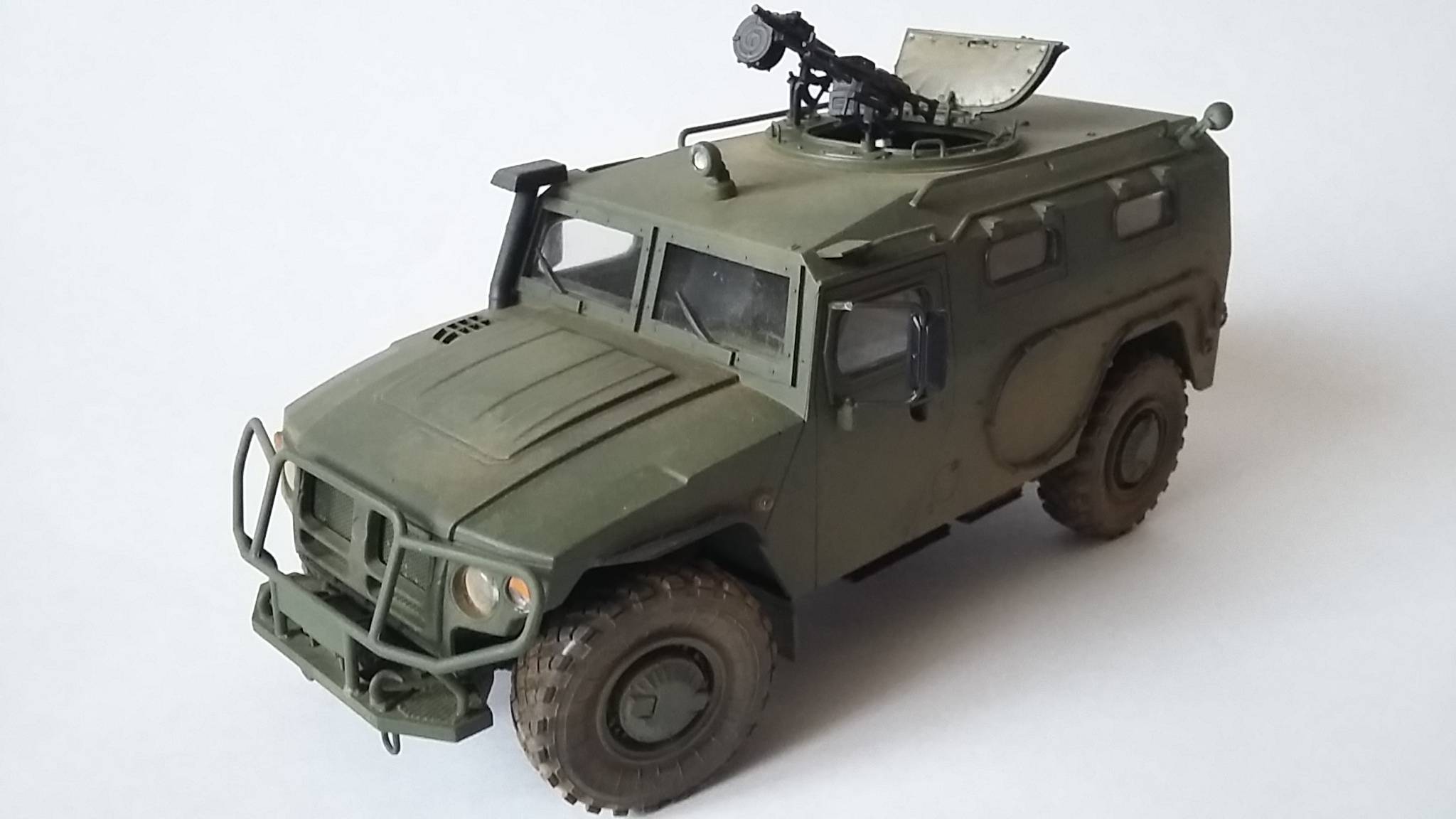 Как относительно начинающий моделист, выставляю на Ваш суд одну из своих первых моделей - ГАЗ "Тигр". Модель из коробки, поэтому по процессу сборки ничего интересного. Грунт, краски и лаки - tamiya. Пизмент - ZIP maket. Время сборки - месяцев пять