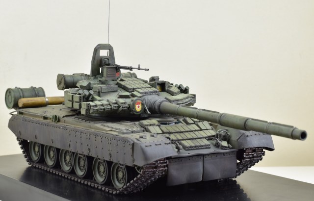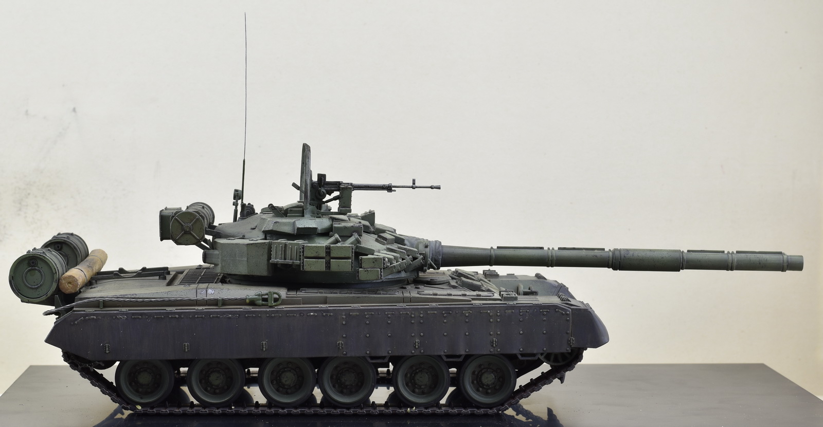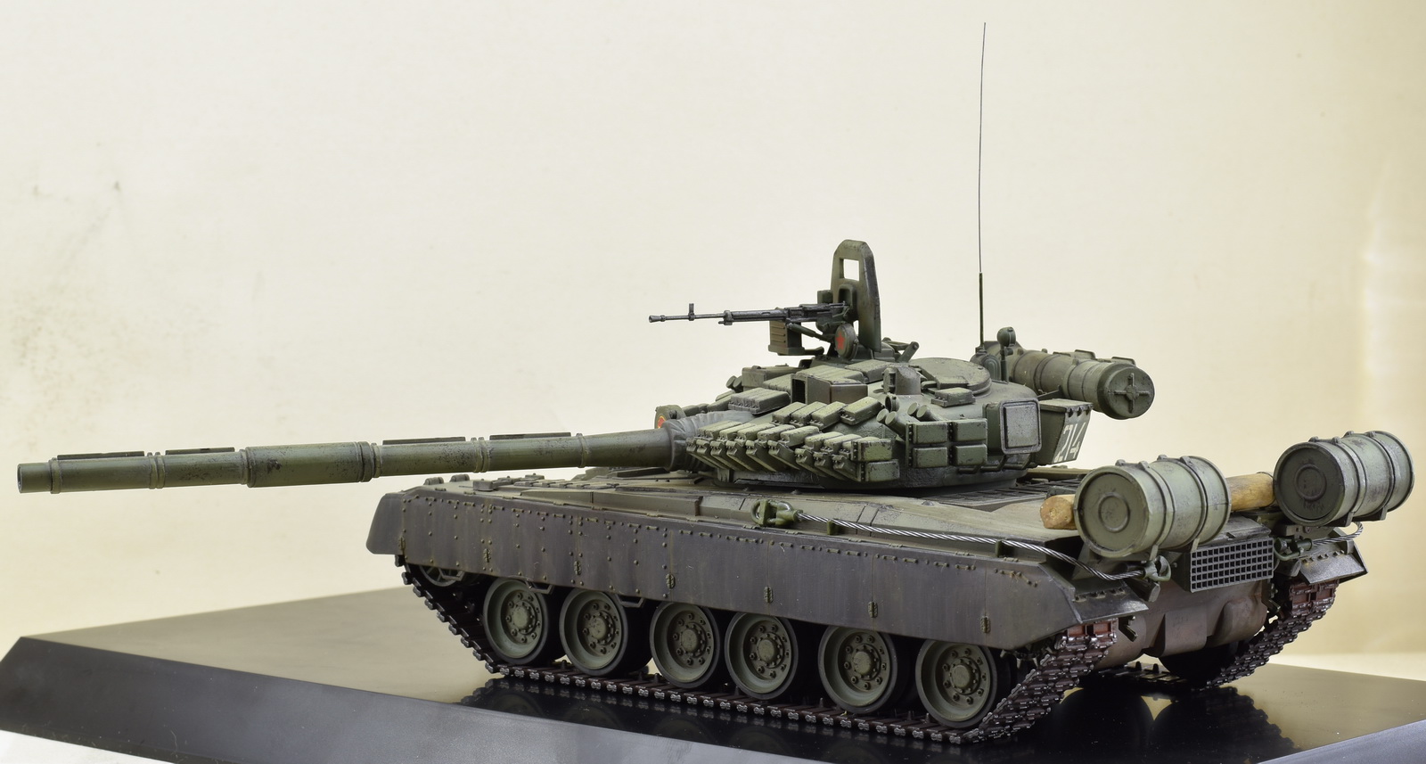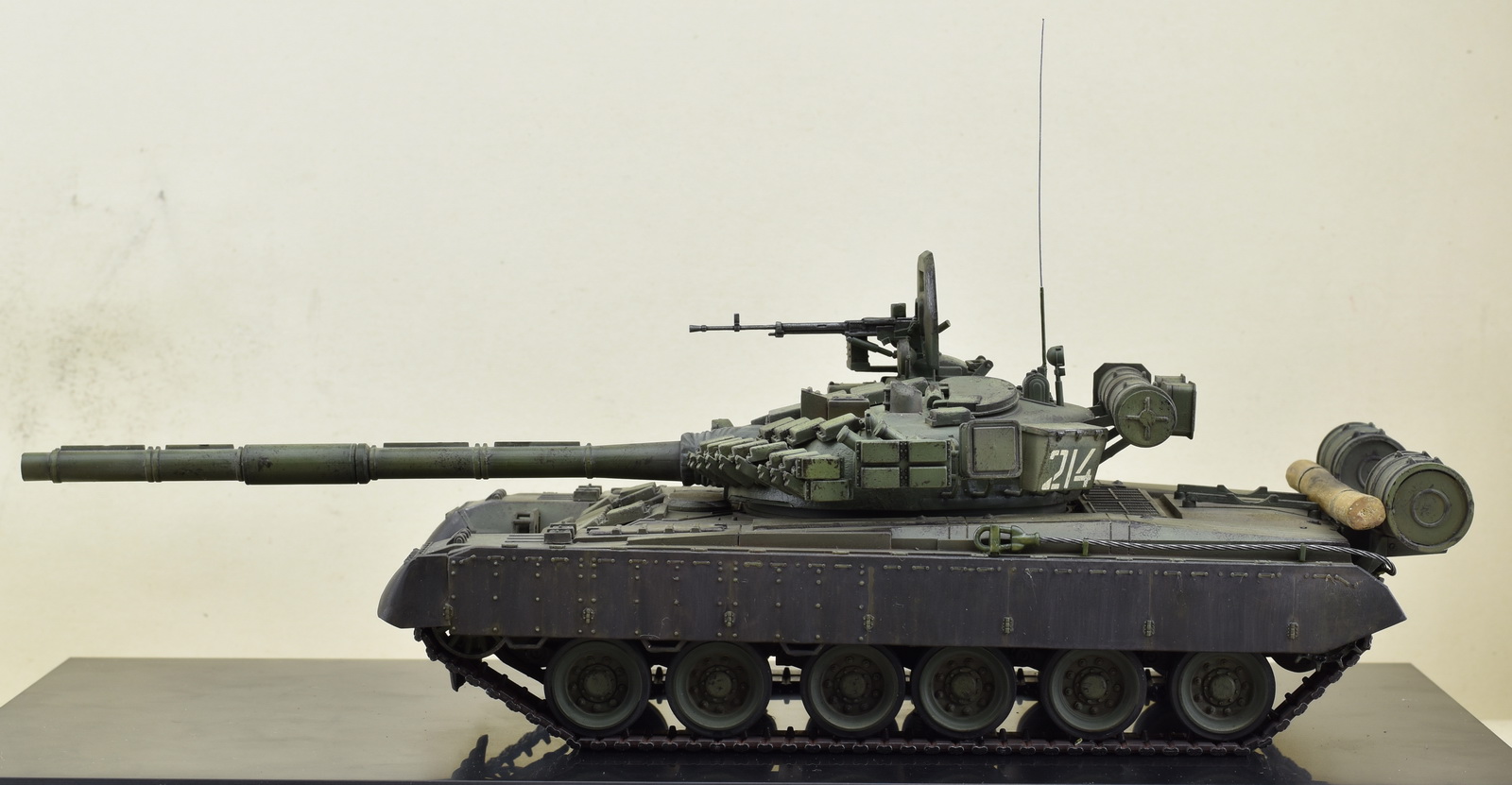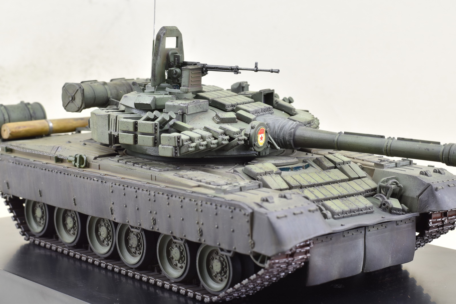 Сборка танка особого труда не составила, если бы не низкое качество деталей, плохой их стыкуемости. Проблемы были практически везде. Активная броня не хотела становится на свои места. Ведущая звездочка оказалась меньше по ширине, чем траки, и была рассчитана на использование металлических траков. Диаметр звездочки оказался большой и мешала установки бревна, пришлось его положить на корпус. Пластмассовый трос заменил на стальной, диаметром 1 мм. Металлические траки ставить не стал, решил их использовать на другой технике. Особых доработок не делал, так как нужно было собрать танк быстро. Фотографировал на скорую руку, поэтому с фоном проблема. Использовал краски тамия, пигменты ZIP.
