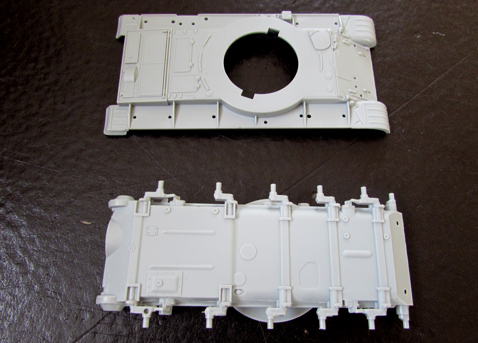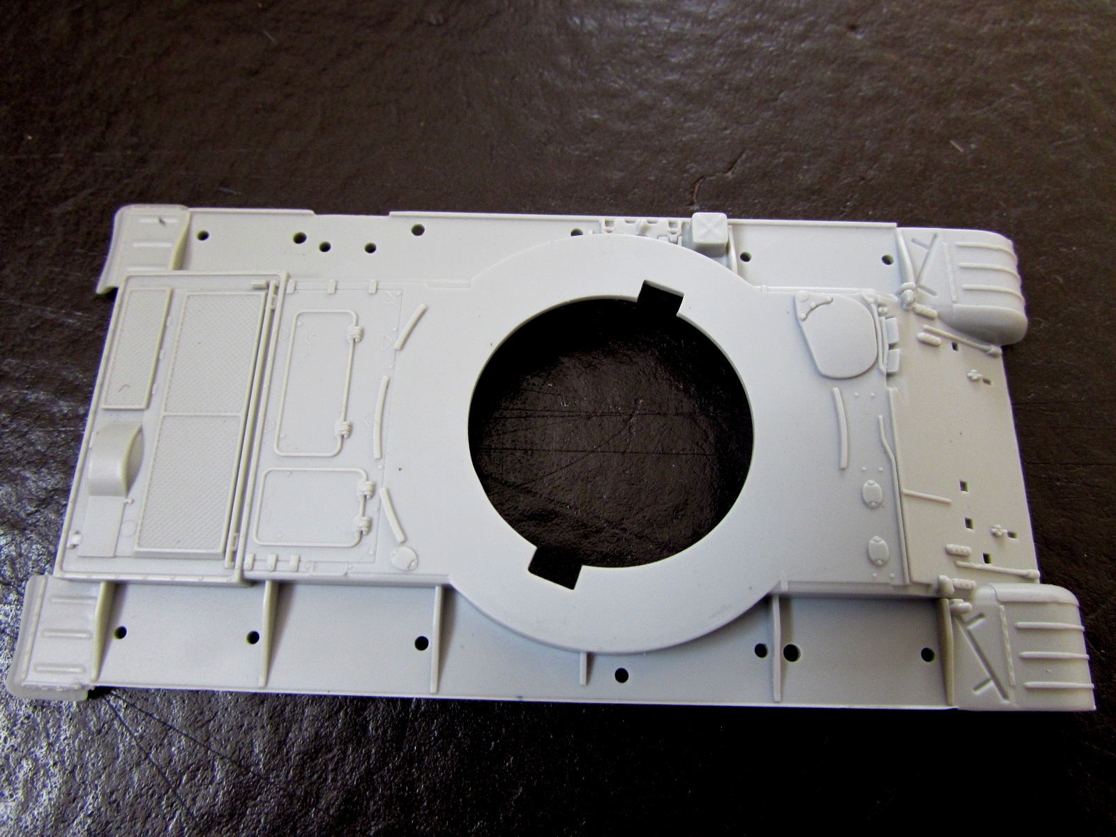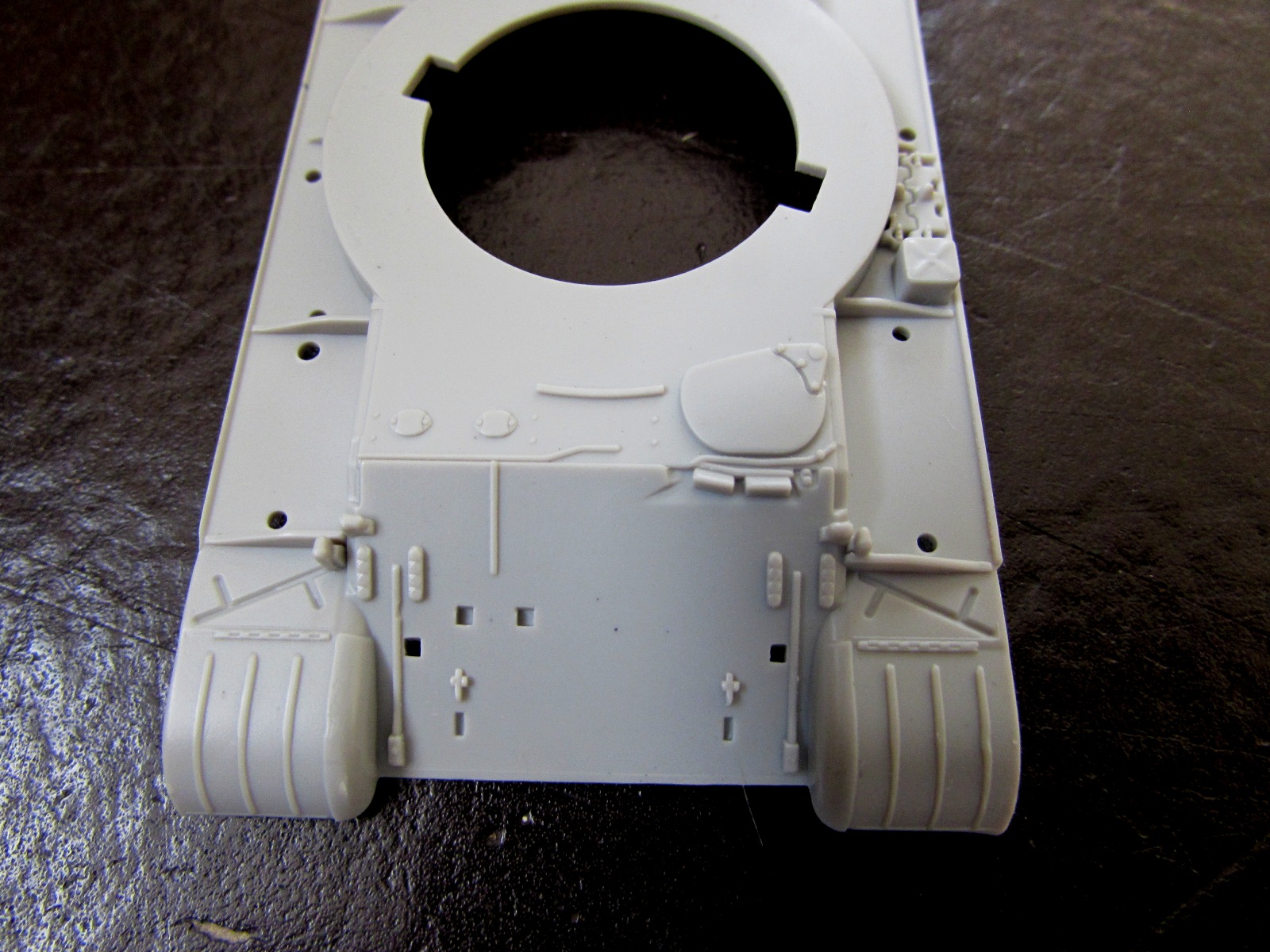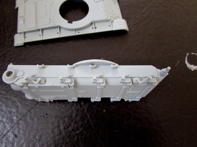- подбашенные утолщения корпуса. Вот как можно было сделать их вот так? Даже на древней, как отходы жизнедеятельности мамонта модели от Esci/Italeri этот момент был в разы лучше сделан! Мало того, запасные траки на надгусеничной полке отлиты так, что "вплавляются" в эту деталь!