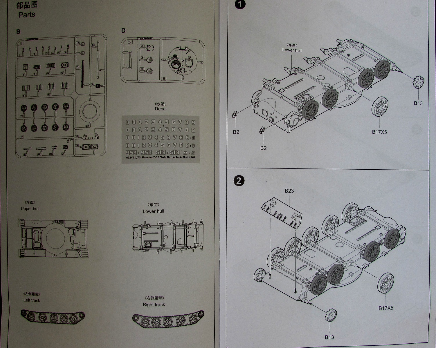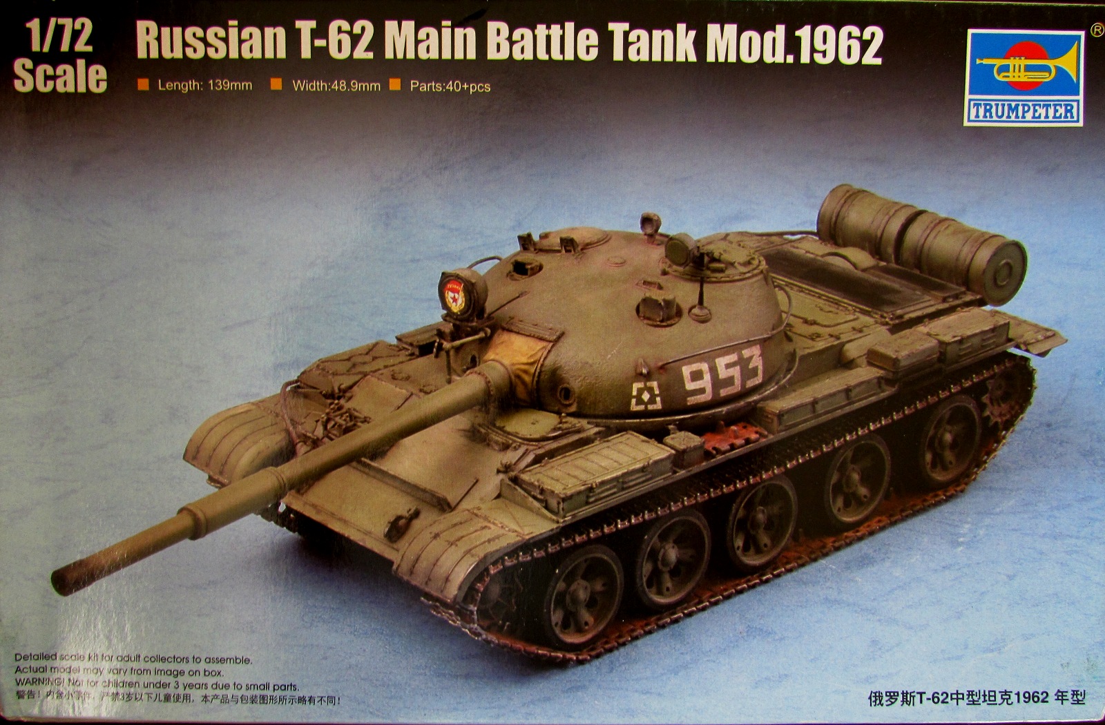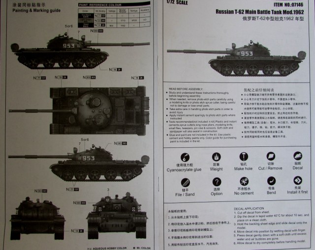 Т-62 до недавнего времени почти не был представлен в "правильном" масштабе. Детализированная, но УЖАСНО отлитая модель от АСЕ уже давно исчезла не то что с прилавков - с рук моделистов-"коробочников"; модель от Italeri/Esci ВООБЩЕ не Т-62, а фантазия на тему Т-62 времен Холодной войны. И вот, наконец, данной моделью (а в будущем - еще и практически ВСЕМИ массово выпускавшимися вариациями) наc порадовали Китайские товарищи.
