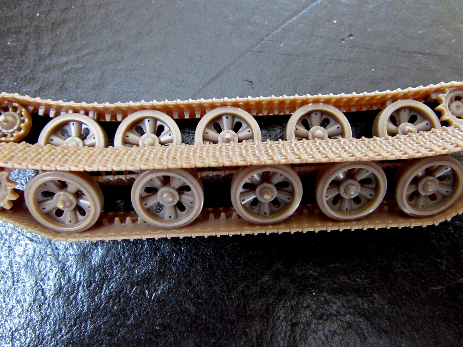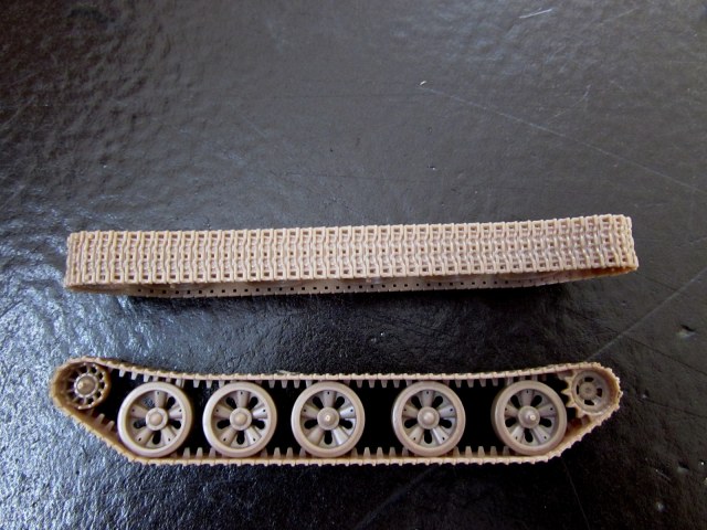 Вот тут просто засада. В отличие от всех прочих моделей "новой линейки" где ходовая была чуть ли не лучшей частью модели, здесь ходовая - позор и окончательный приговор модели! Снаружи гусеница просто какая-то замыленная, внутри - без рисунка траков, причем его отсутствие очень хорошо видно на свободных от катков участках! Тут либо гадить ходовую пигментом, либо менять целиком, если по-хорошему.