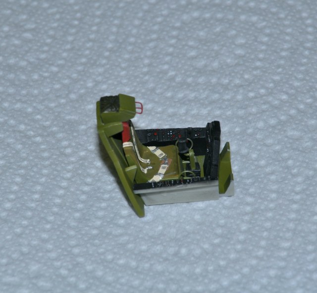 Далее поправил на килях расшивку рулей направления. Производитель немного ошибся с поворотной частью РН – уменьшил ее до соответствия фото и сделал из остатков травления приводы РН. На стойки шасси сделал шланги гидравлики из проволоки 0,3 мм и 0,2 мм, а также швартовные серьги для фиксации самолета на полетной палубе авианосца. Работу с кабиной пилота начал с переделки РУС. Переделал по фото прототипа «палку» от крепления в полу до рукоятки, сделав ее из пластикового прутка и проволоки 0,5 мм. На левом пульте кабины пилота изготовил из проволоки и пластикового прутка имитацию РУД, а также немного доработал кресло пилота: