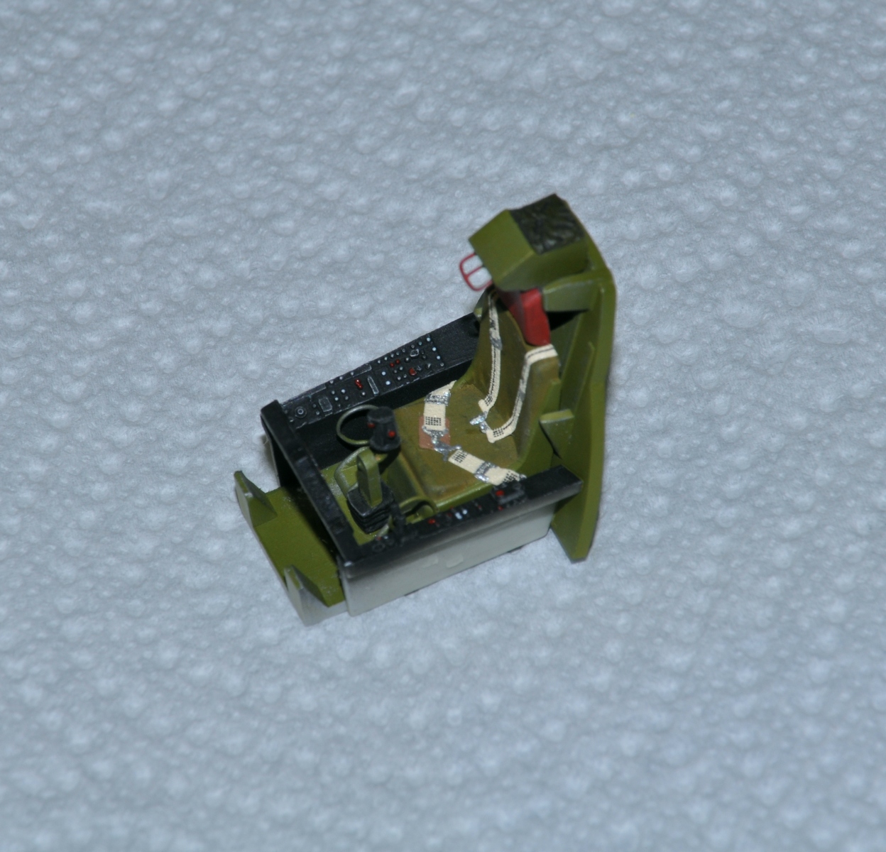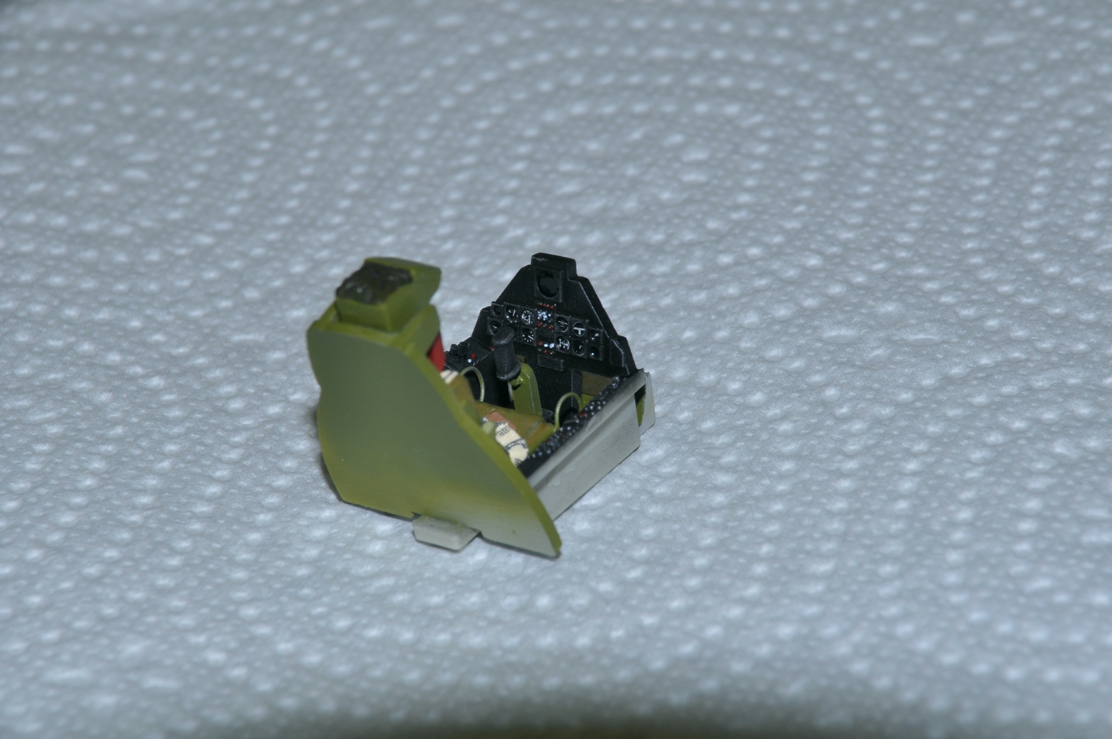 После монтажа «ванны» кабины пилота и склейки половин носовой части фюзеляжа, выяснилось, что козырек приборной панели слишком высоко возвышается над приборной панелью. Таким образом, образуется непонятная пустота над приборкой и перекрывается «обзор» пилоту вперед. Спилил этот козырек вровень с верхом приборной панели и изготовил верх их пластика 0,5 мм.