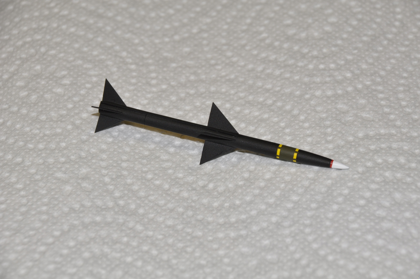 Работу начал с ракет AIM-7A. У изкоробочных ракет срезал стабилизаторы, зашпаклевал недоливы, утяжины. Затем восстановил стабилизаторы из листового пластика 0,3 мм и добавил на корпус ракет короба из прутка 0,5 мм.