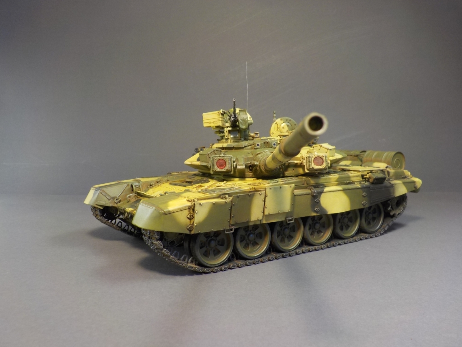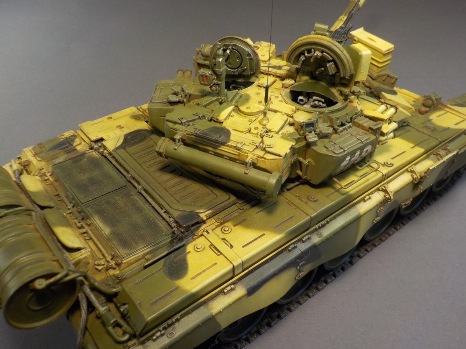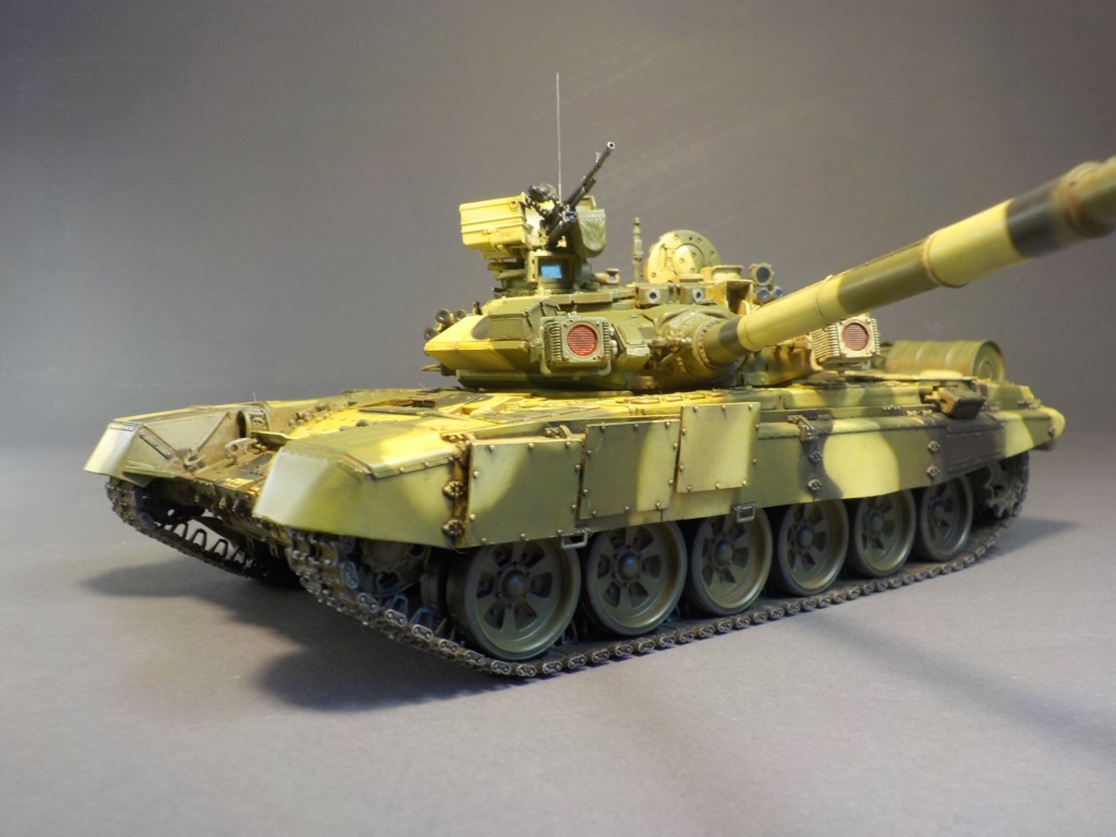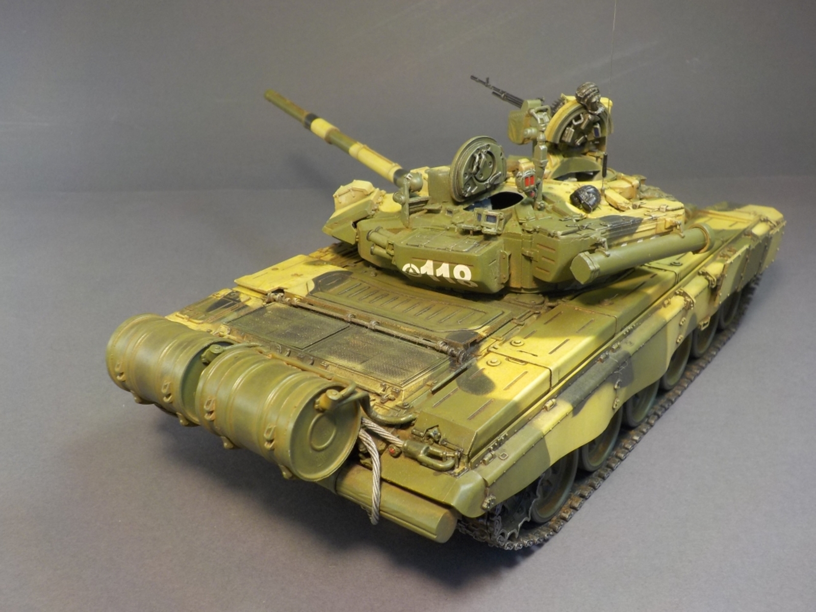 Доброго времени Уважаемые коллеги по творчеству! Представляю Вашему вниманию модель танка Т-90А от фирмы MENG. Набор очень понравился стыкуемость деталей отличная, дана рабочая подвеска,рабочие гусеницы,моторный отсек с двигателем.Модель выполнена из коробки от себя добавил тросы собственного производства и антенну из гитарной струны.Красил модель аэрографом красками от фирмы MR.HOBBY № 2,3,26,137,303,47,46,181. Смывка TAMIYA,фильтры масляные краски,пигменты ZIP maket. Пачкать и грязнить сильно не стал нравятся чистые машины.Приятного просмотра удачи.