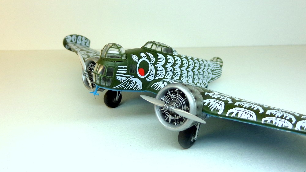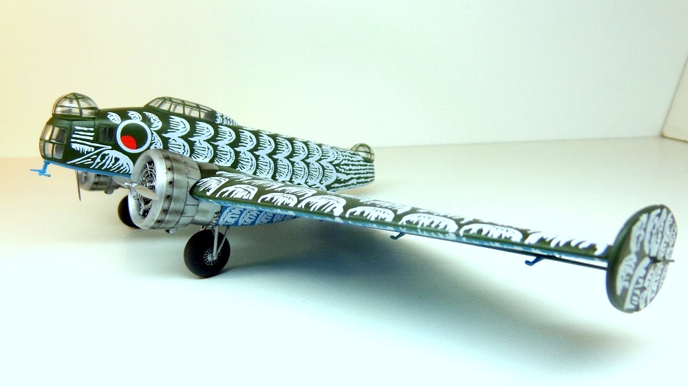 Постройка модели была прокомментирована мной здесь http://karopka.ru/forum/forum189/topic26982/ Также предварительно я сделал обзор http://karopka.ru/community/user/16054/?MODEL=504900 К огромному моему огорчению, пытаясь рассказать об ошибках и просчетах производителя модели, я сам допустил крайне обидную оплошность при нанесении декалей на нижние поверхности, положившись в этом деле на инструкцию Микро-Мира. В результате рисунок "перьев" оказался перевернут. Ну а так как запасного набора декалей у меня не было, а рисовать их вручную (и перекрашивать модель заново) я не решился, то пришлось оставить деки в таком виде. Резюме - если берешь модель Микро-Мира в руки, то делай всё наоборот, а не в соответствии прилагаемой инструкции и "тебе будет счастье". Так же я не исправил ещё два "косяка" - не изменил неправильное вращение пропеллеров и не переделал переплеты остекления пулеметных башен. Довольно удачным считаю своё решение "повесить" громозкие элероны на скрепки, штатные тонюсенькие пластиковые деталюшки их бы не удержали, а так получилось вполне надежно.