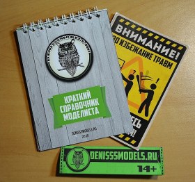 «Краткий справочник моделиста». Блокнот, формат карманный. 20 страниц (3 страницы для самостоятельных записей-заметок). Печать полноцветная, односторонняя, бумага глянцевая. Брошюровка вертикальная, перекидная, на спирали. К «Справочнику» прилагается бонус – забавная наклейка-пугалка (Ахтунинг). Улыбнувшись над наклейкой, мне стало понятным, почему изделие имеет возрастной ценз «14+». На картинке в схематичной, пиктограммной форме изображен акт насильственных действий и нанесения тяжких увечий одного хомо сапиенса другому. Видимо тот, другой хомо сапиенс не совсем сапиенс (не очень разумный) и совершил недопустимый проступок вызвавший приступ гнева и как следствие – сложные черепно-мозговые травмы. J