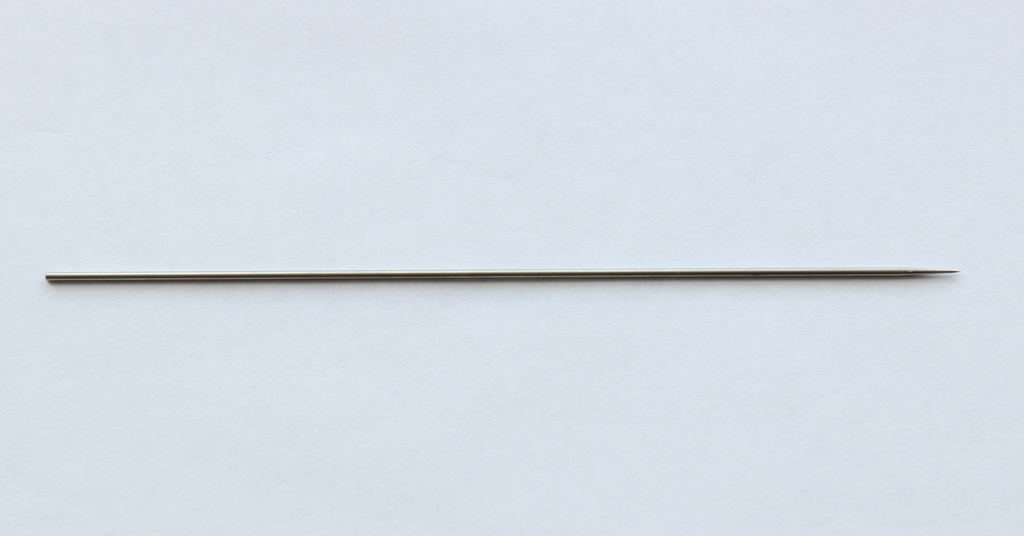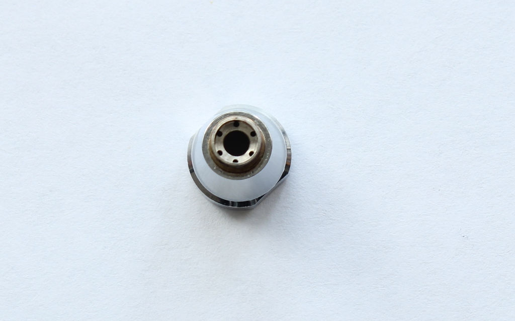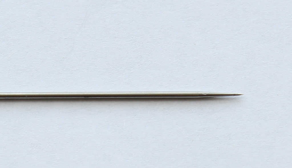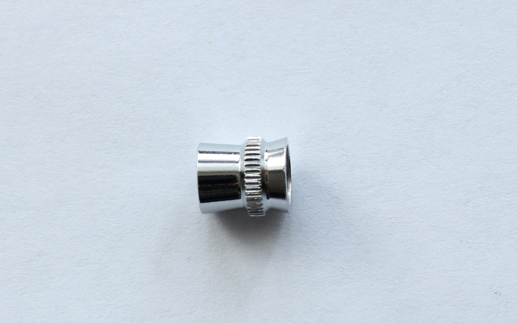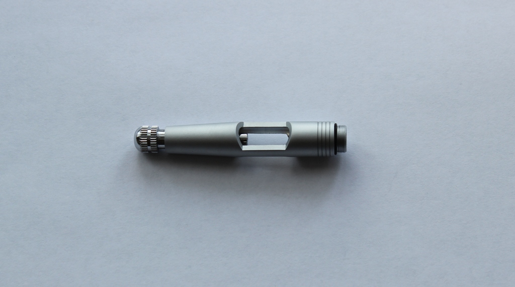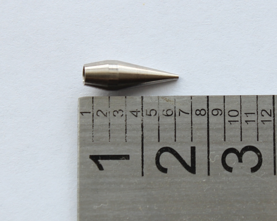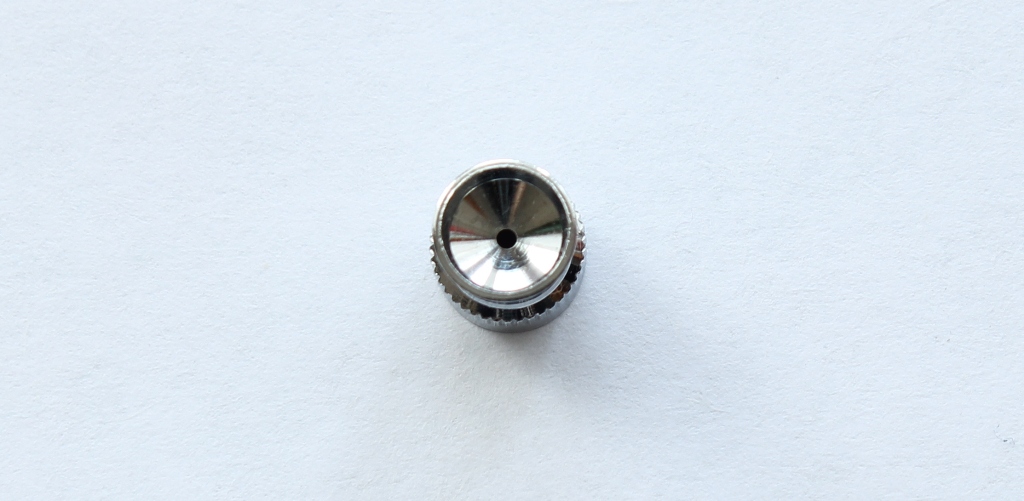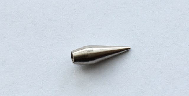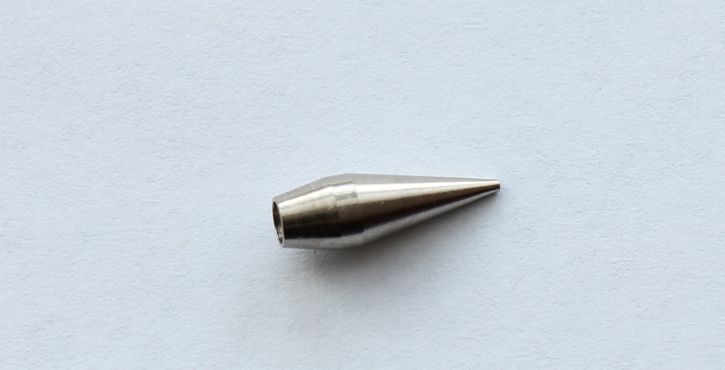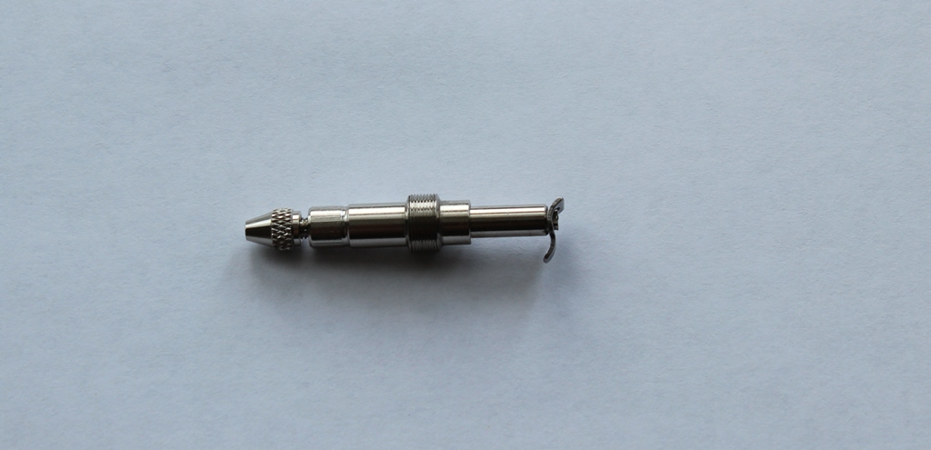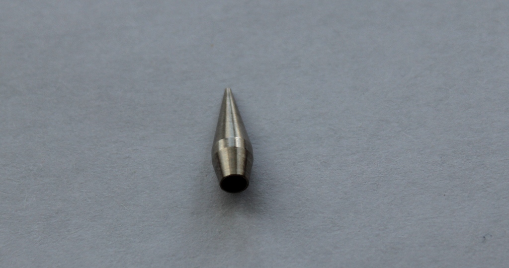 Переходим к механизму сопла. Между корпусом и воздушным соплом уплотнительная прокладка. У одного из коллег на форуме эта прокладка вызывает вопросы по долговечности и качеству .В моем случае она просто идеальна, при затягивании она ни куда не выпирает и не попадает под резьбу. Хочу поделится опытом хранения аэрографов:всегда храню аэрографы в несколько отпущенном состоянии(т.е все узлы не затягиваю до конца).Воздушное сопло очень жестко и герметично фиксирует материальное сопло. На нем стоит остановиться . На фото видны его размеры .Выполнено оно токарным способом, неровностей, шероховатостей, зазубрин я не заметил. Особенностью конструкции сопла является отсутствие резьбы, что исключает возможность поломки. Что касаемо поломок сопел, мое личное мнение- при аккуратной съемке/установке они исключены.Ну не знаю я сколько нужно приложить усилий и чем нужно думать, когда с упорством орудуешь ключом? На диффузоре останавливаться не стоит- нет в нем ни чего особенного. Остановимся на пипетке,которая входит в набор:изготовлена из грубого ,толстостенного полиэтилена,крайне дубоватого качества .Попробовал набрать в нее 1.0 мл растворителя,но не получилось-пипетка из за своей грубости и твердости засасывает жидкость по максимуму.Нужно еще отметить ,что на аэрографе имеется некоторое количество силиконовой смазки, которая прекрасно удаляется.