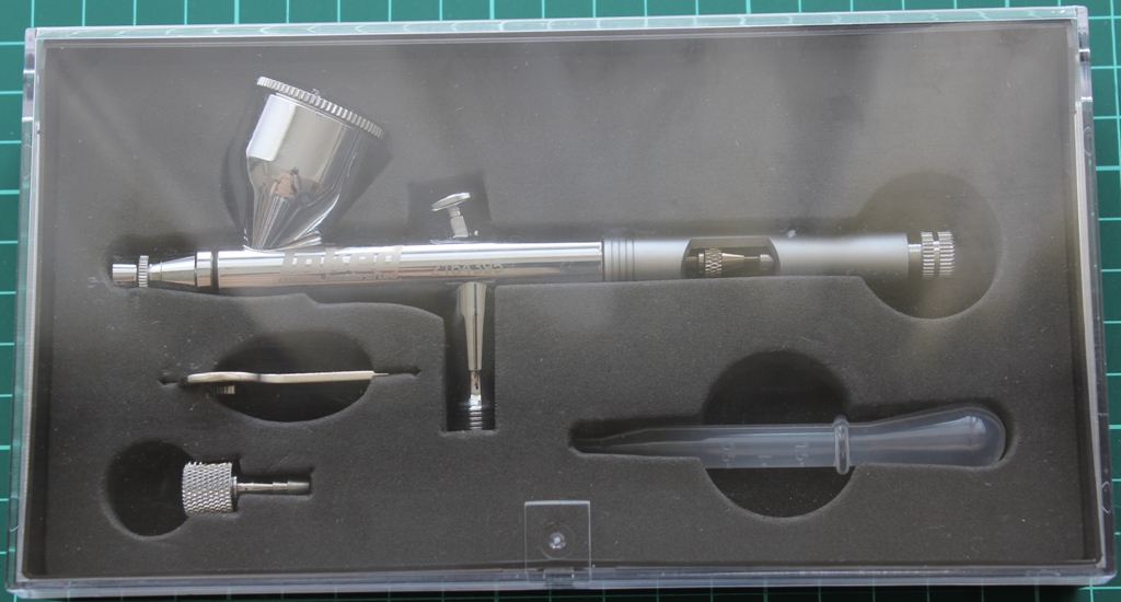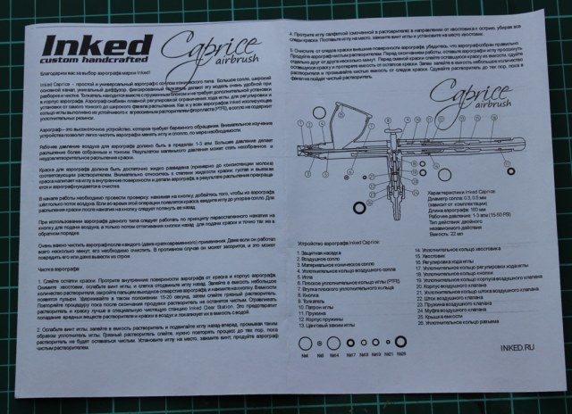 Бокс- арт из глянцевого картона с боковой загрузкой Внутри пластиковая коробочка ,в которую и упакован сам аэрограф .Если кто знаком с продукцией фирмы Inked –то упаковка выполнена в лучших традициях. Внутри в поролоноподобном материале, довольно таки жестко уложен сам аэрограф,ключ , переходник под быстросъемный разъем шланга и пипетка. Ни чего не болтается, достается из коробочки несколько туговато.