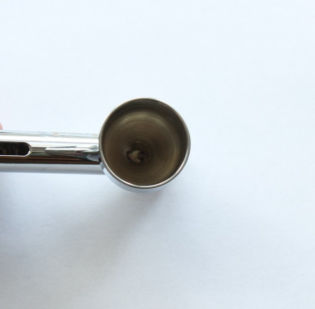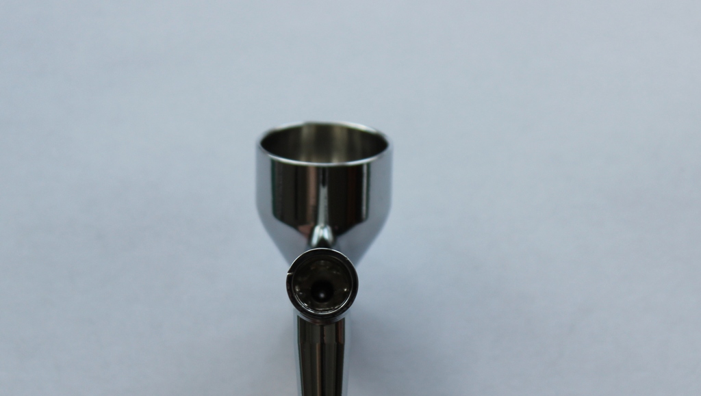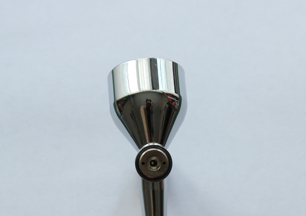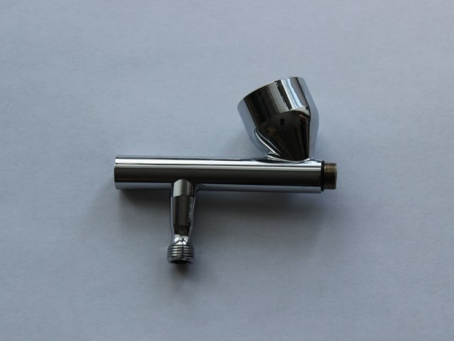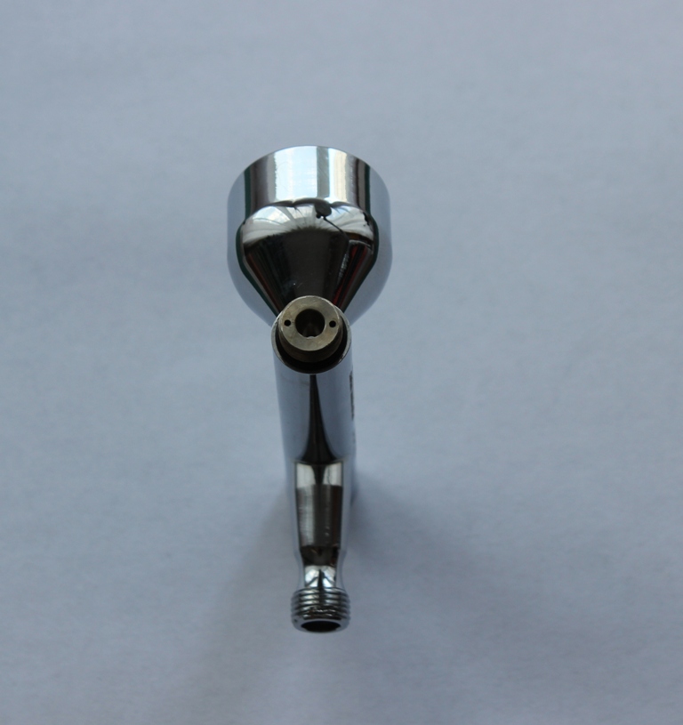 Сам аэрограф несколько тяжеловат, по сравнению со своими собратьями ;крайне комфортно лежит в руке. Сам корпус и бачек выполнен из хромированного металла, хвостовик имеет приятный матовый цвет. Люфтов, шатаний не выявляется. Регулировка хода иглы –плавная.