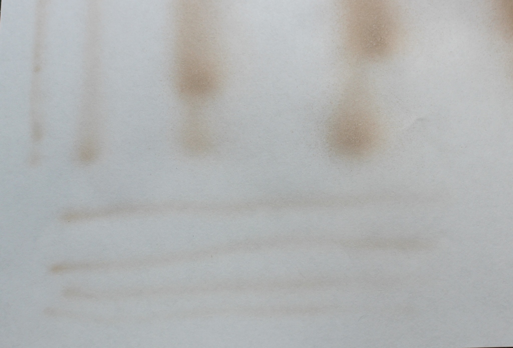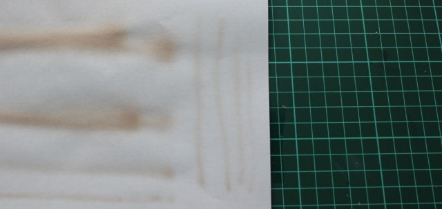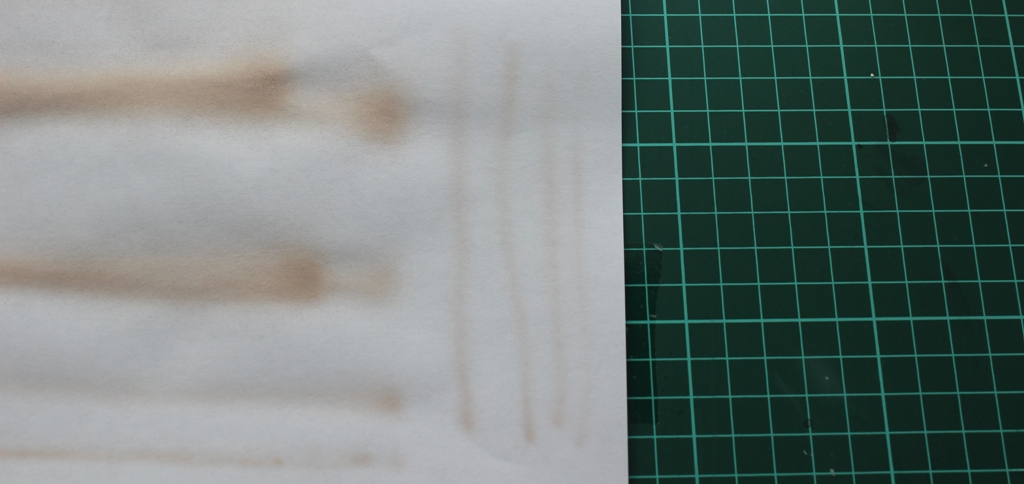Теперь другая: разбавил H416 от Mr.Hobby тамиевским Х-20А 1:1, открываю минимальную подачу 1,5psi и аэрограф выдаёт такие брызги вокруг линии. Разбирал и чистил сопло с иглой.