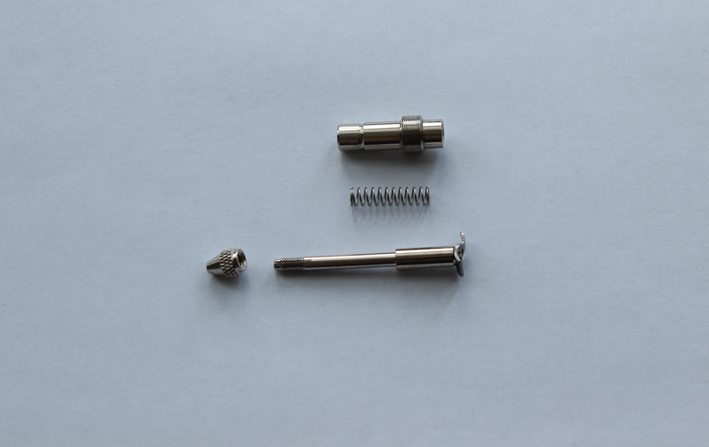 Переходим к разборке. Снимаем хвостовик .Что не понятно, так это назначение уплотнительного кольца-ну ни какого функционала оно не несет вообще. Далее цанговый зажим иглы-иглу он держит плотно, при последующей установке не требуется применение пассатижей, как это бывает в JAS-ах. Игла выходит свободно. Выкручиваем корпус пружины и вынимаем толкатель. Надо отметить, что толкатель прикреплен к патрону иглы -это значительно упрощает сборку/разборку аэрографа. Например у Ниндзи, толкатель идет отдельной деталью и вызывает неудобства при его установке. Далее- сама кнопка. Читал на других сайтах отзывы об Inked Caprice. Так вот ,коллеги жалуются ,что при работе эта кнопка несколько туговата. Лично мое мнение -она и должна быть тугой .Нужно не забывать то, что сопло 0.5 мм рассчитано на грубые и большие по площади работы, а не на прорисовку тонкого камуфляжа и пост- и перешейдинга.
