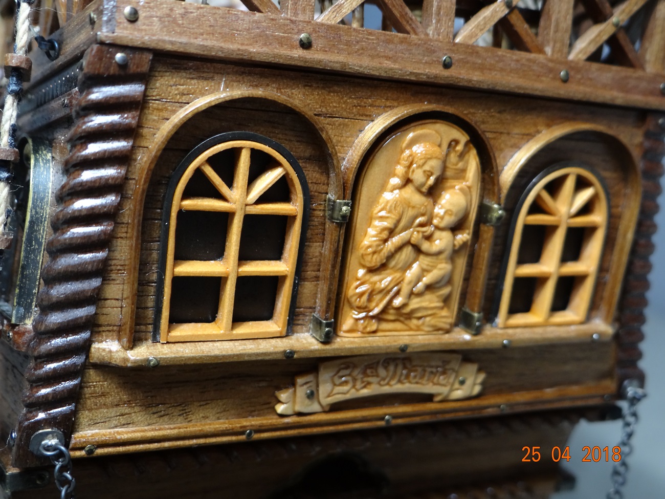 использованные материалы: орех, груша, тиковое и тунговое масла, а также продукция (клей, нитки, проволока, материал парусов, отдельные элементы и проч.) с витрин магазина «Верфь на столе», а кормовой декор «Санта Марии» приобретался в Беларуси;