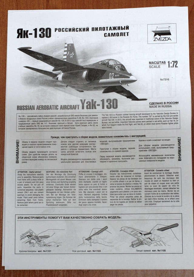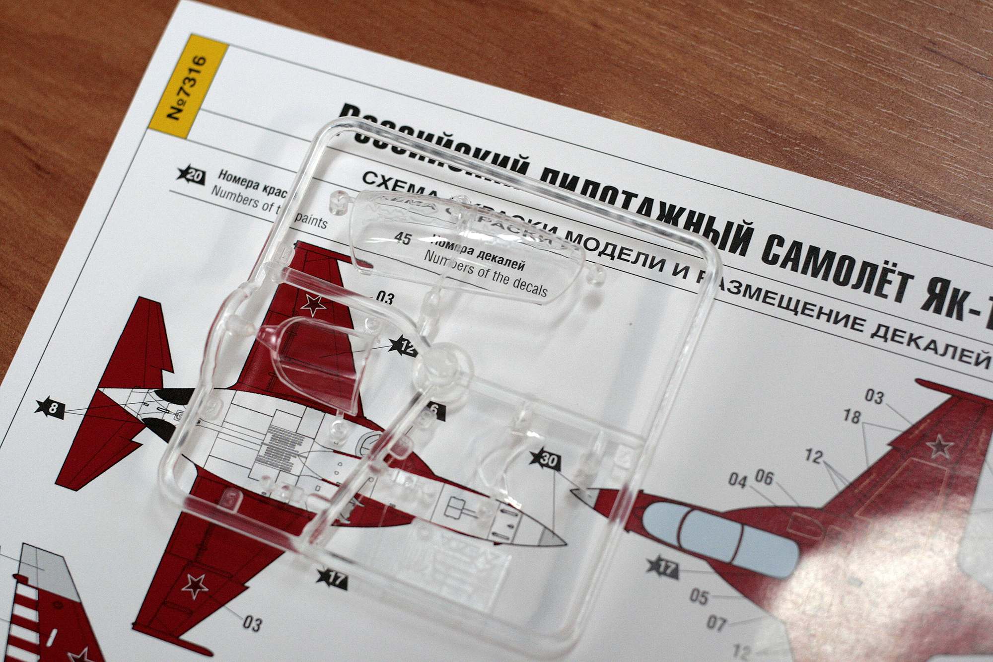 Пара слов о самом наборе: он представляет из себя переработанный набор строевого Як-130, но в данном наборе отливки выполнены из красного пластика, что позволит начинающим собрать модель без полной окраски. Кроме этого набор лишился литниковых рамок с вооружением, из-за чего его цена ниже, чем у обычного Яка.