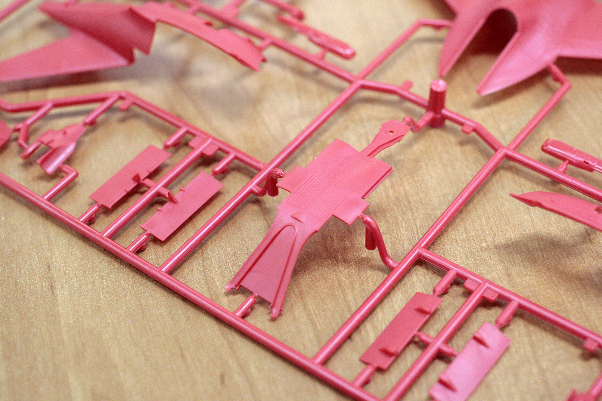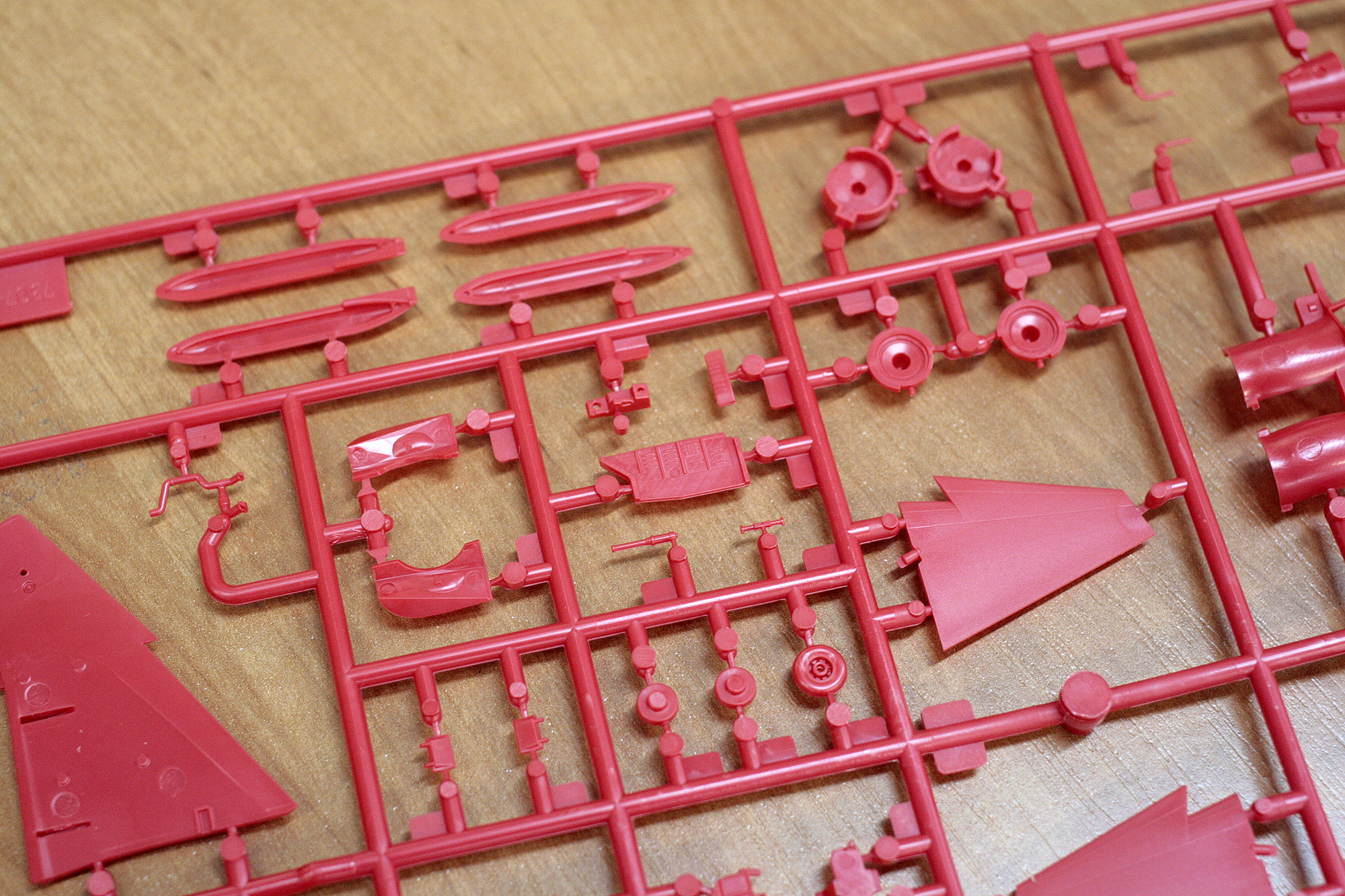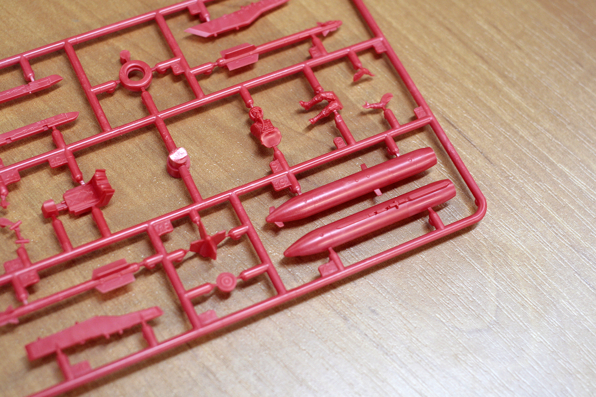 Вот мы и добрались до самого пластика. Главное отличие от раннего набора - цвет. К счастью по механическим свойствам этот пластик не отличается от типичного серого, разве что легко растворяется от супер-текучего клея и норовит оставить цветные следы на кисточке. Такой пластик у Звезды встречается на моделях серии Disney и на детском самолете и танке.