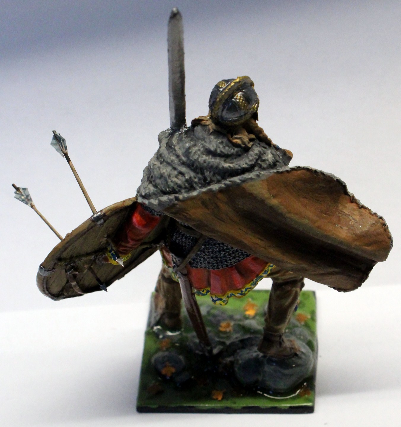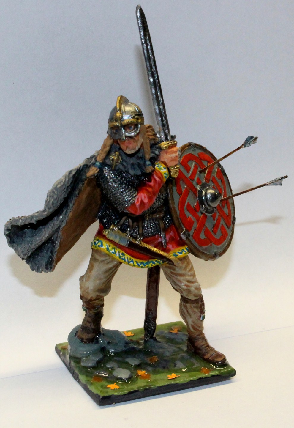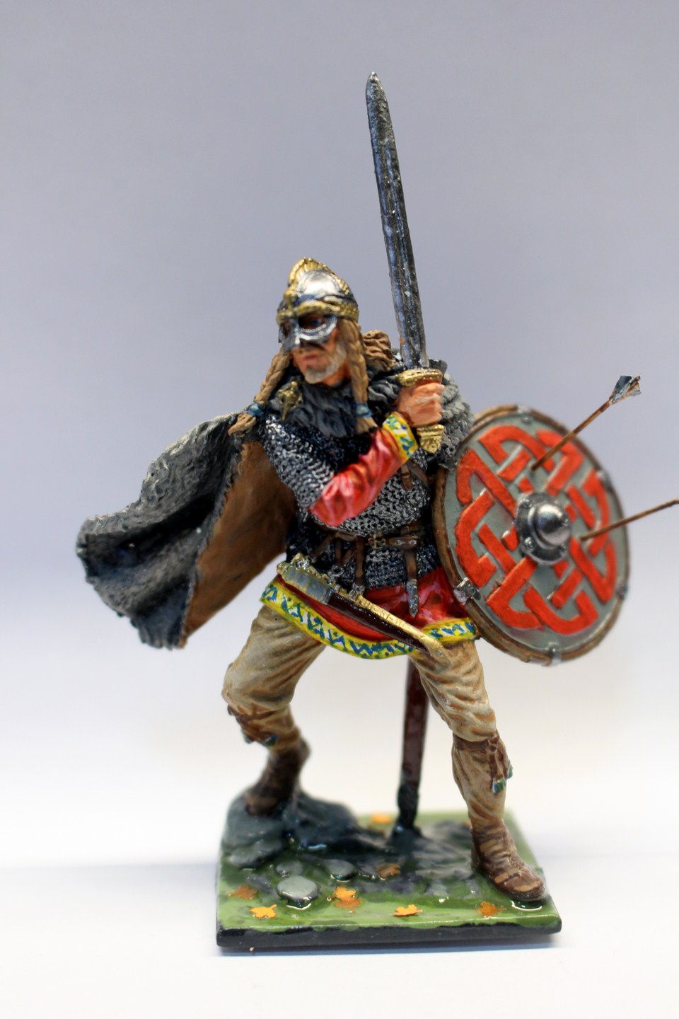 Красил всем что было под рукой, немного дополнил подставку и добавил стрелы застрявшие в щите. При множестве слоев похоронил рельеф каймы на рубахе, Нарисовал свой орнамент, который конечно хуже оригинала. Кроме этого понимаю, что надо было еще клинок меча заменить на что то более подходящее.