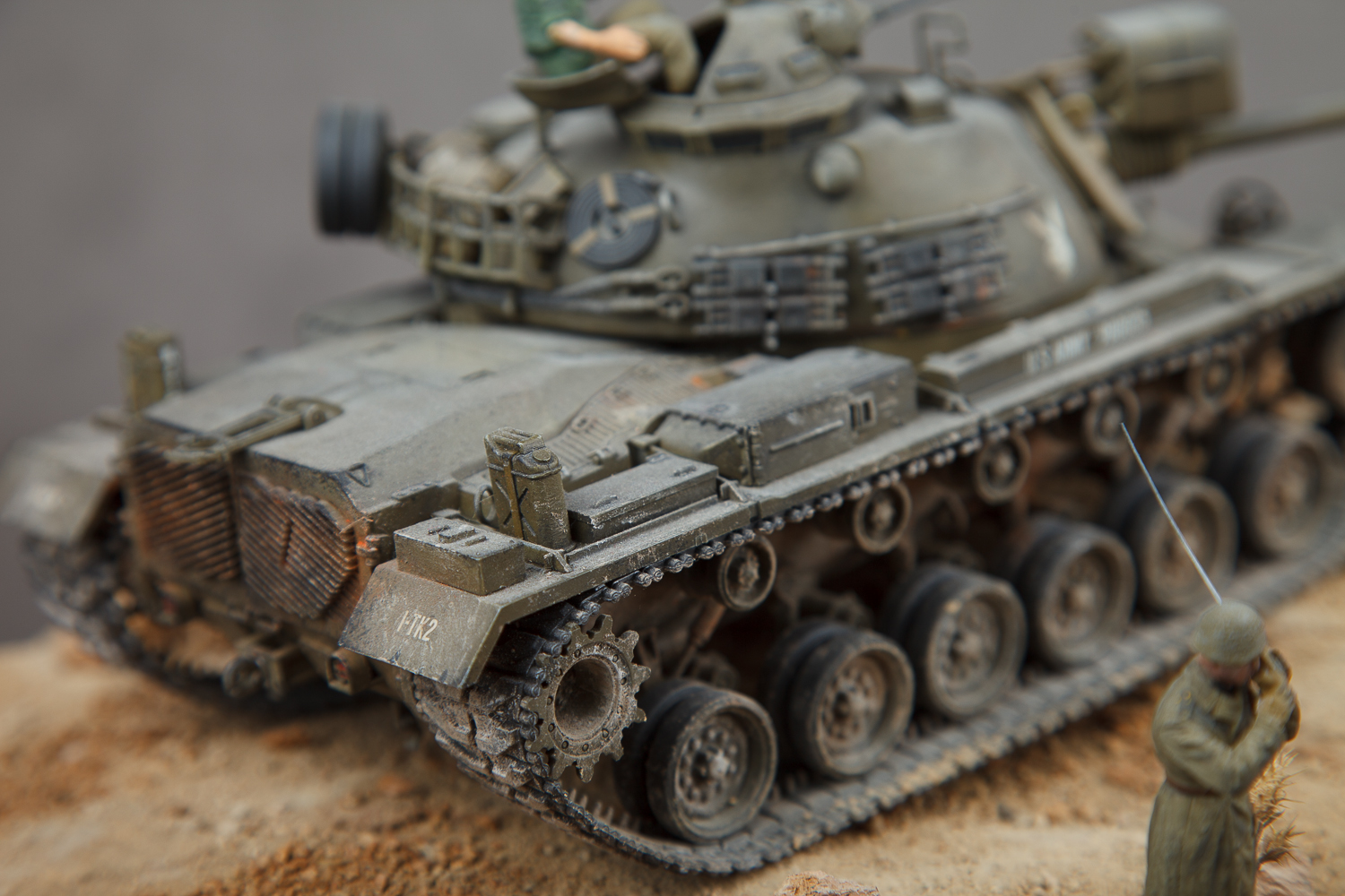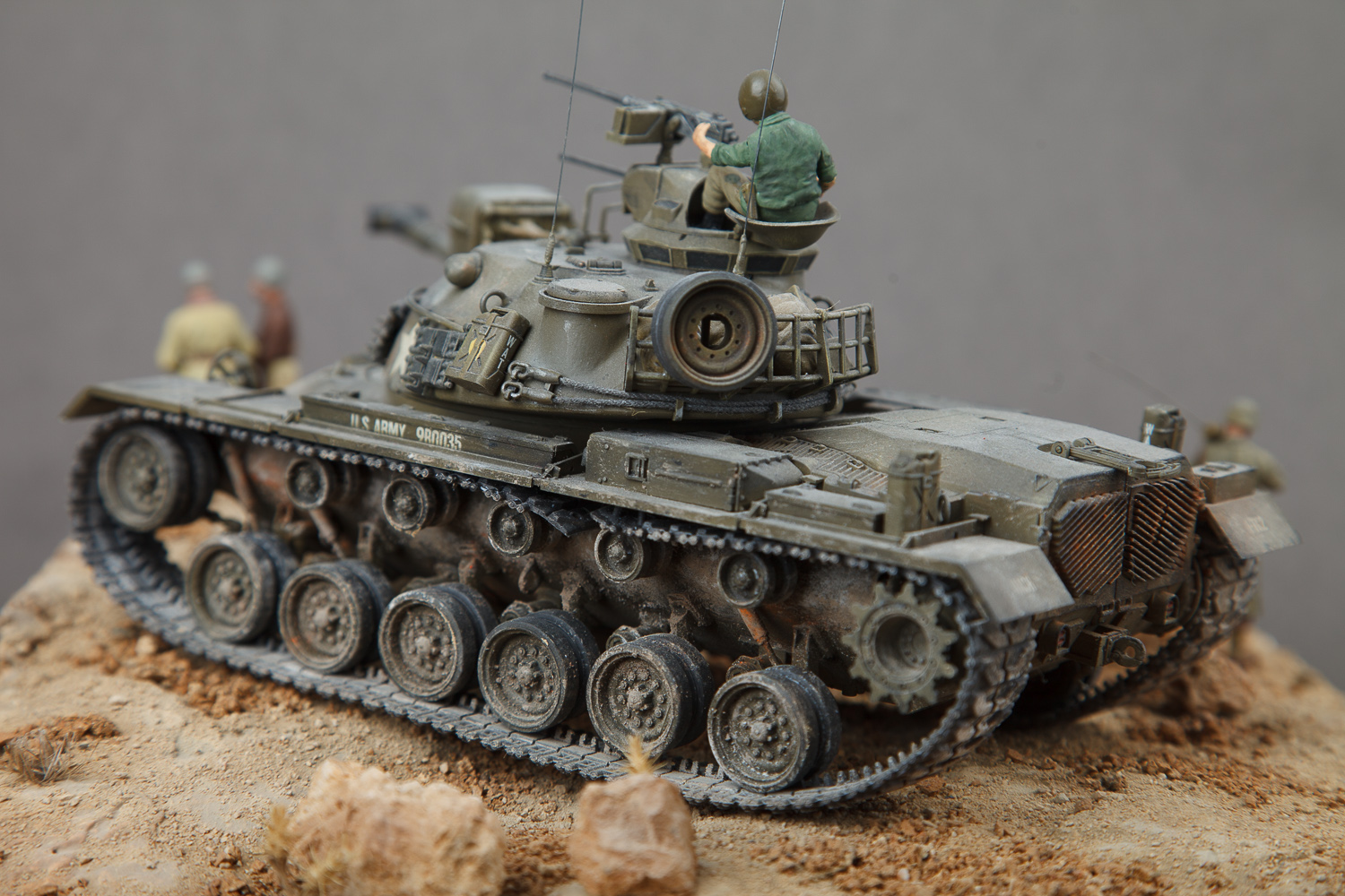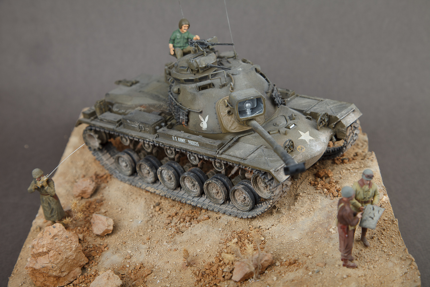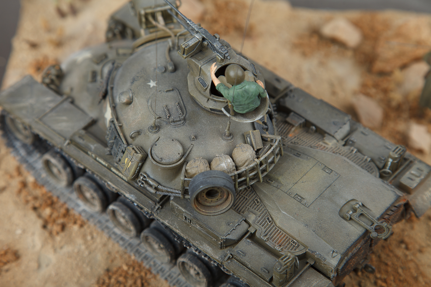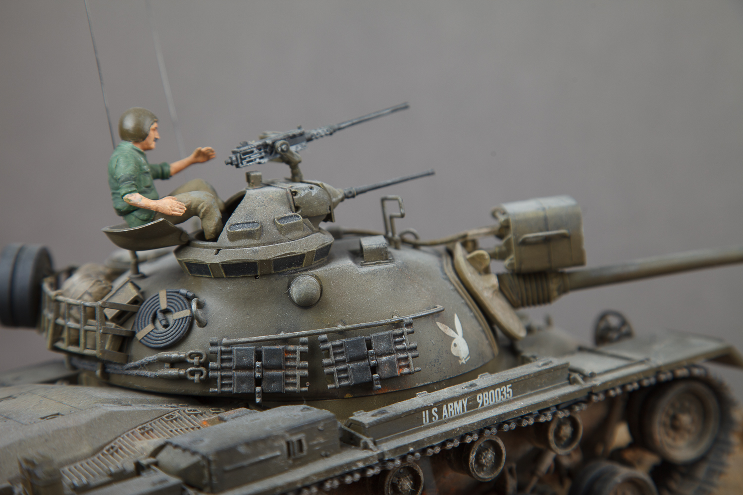 "Смешались в кучу кони, люди...", танк и танкисты из разных эпох... Я понимаю, первый раз и всё такое. Но можно же хотя бы подсыпать земли под гусеницы, чтоб они не висели в воздухе? Крепление дополнительных траков к поручням башни изобразить, а то сейчас они как магнитики на холодильнике. Добавить рукоятки к нештатному пулемёту на командирской башенке и убрать из неё штатный(поскольку, обычно это был один и тот же пулемёт, который во Вьетнаме предпочитали снимать со штатного места и устанавливать на самодельном шкворне снаружи). Антенны из проволоки/струны это, наверное, ошибка всех начинающих. Сам когда то с ними маялся. "Убил" немало антенных входов. Гораздо проще и реалистичнее делать антенны из тянутого литника. Вот, какие то такие впечатления. Окраска танка на общем фоне смотрится неплохо.