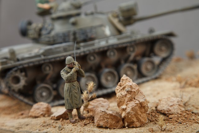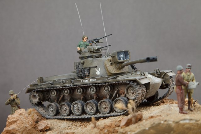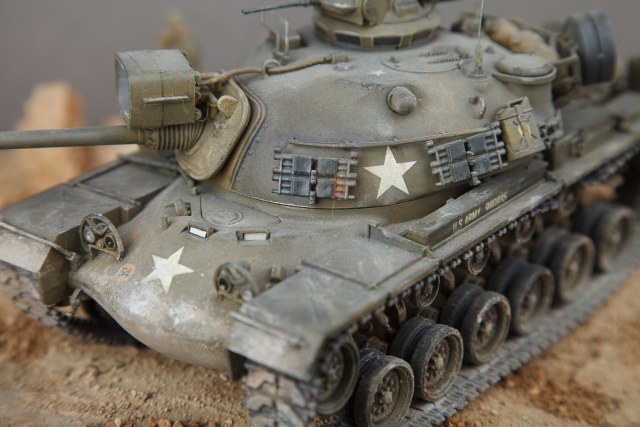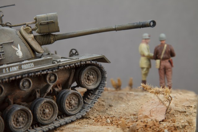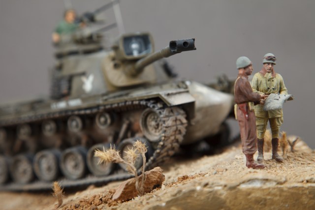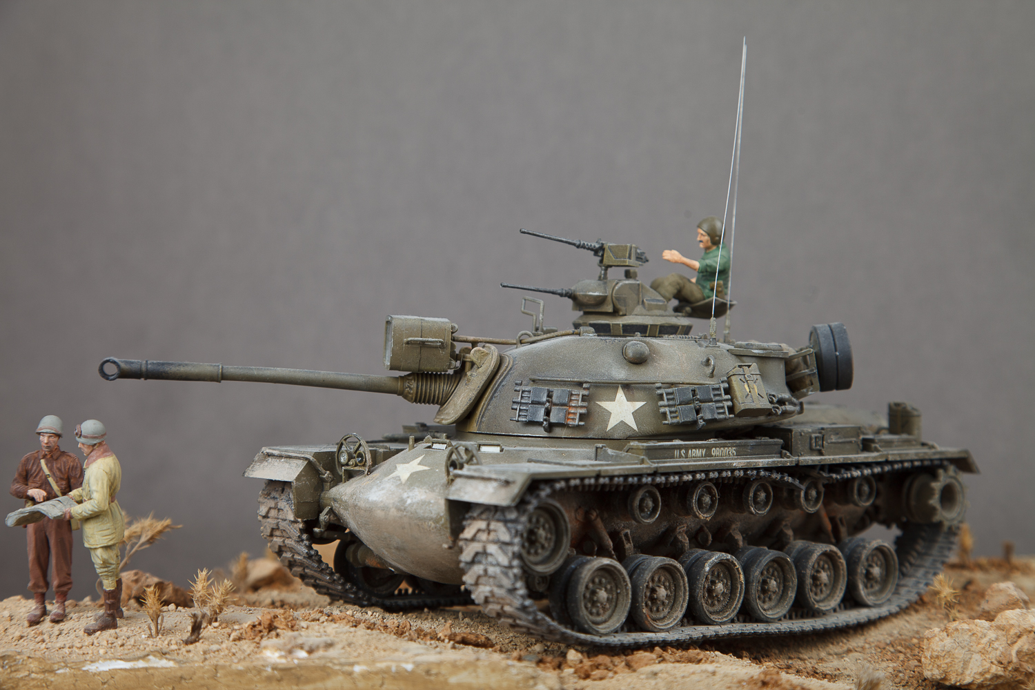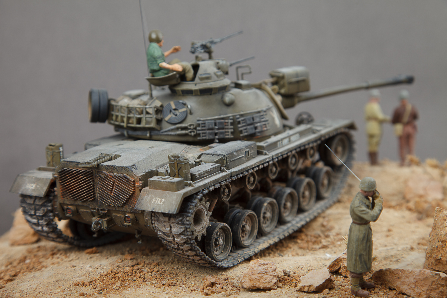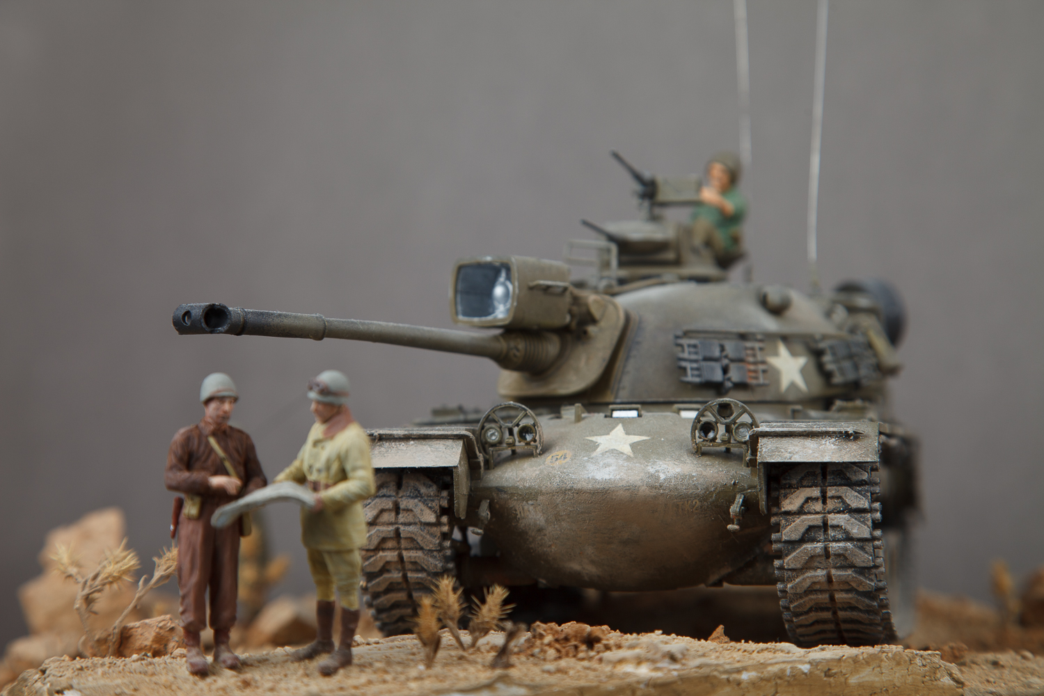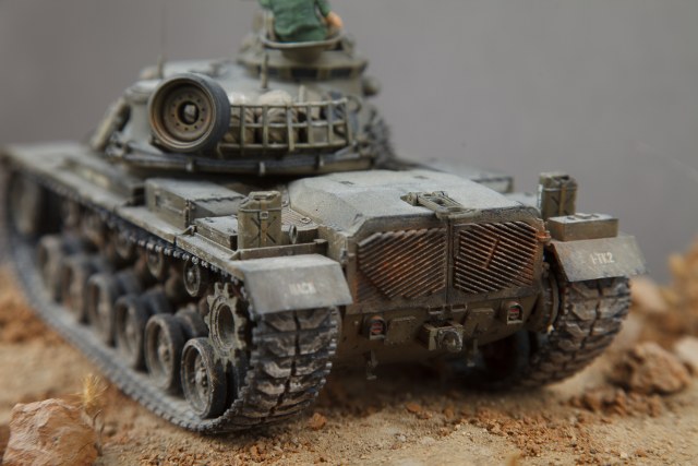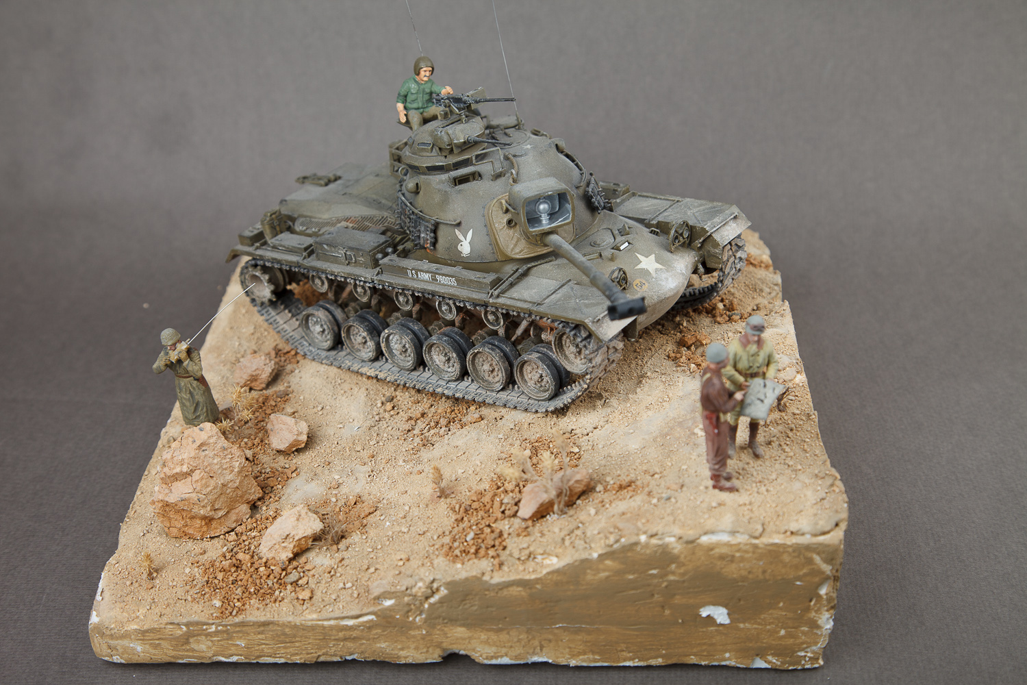 "Смешались в кучу кони, люди...", танк и танкисты из разных эпох... Я понимаю, первый раз и всё такое. Но можно же хотя бы подсыпать земли под гусеницы, чтоб они не висели в воздухе? Крепление дополнительных траков к поручням башни изобразить, а то сейчас они как магнитики на холодильнике. Добавить рукоятки к нештатному пулемёту на командирской башенке и убрать из неё штатный(поскольку, обычно это был один и тот же пулемёт, который во Вьетнаме предпочитали снимать со штатного места и устанавливать на самодельном шкворне снаружи). Антенны из проволоки/струны это, наверное, ошибка всех начинающих. Сам когда то с ними маялся. "Убил" немало антенных входов. Гораздо проще и реалистичнее делать антенны из тянутого литника. Вот, какие то такие впечатления. Окраска танка на общем фоне смотрится неплохо.