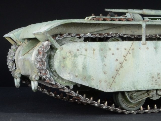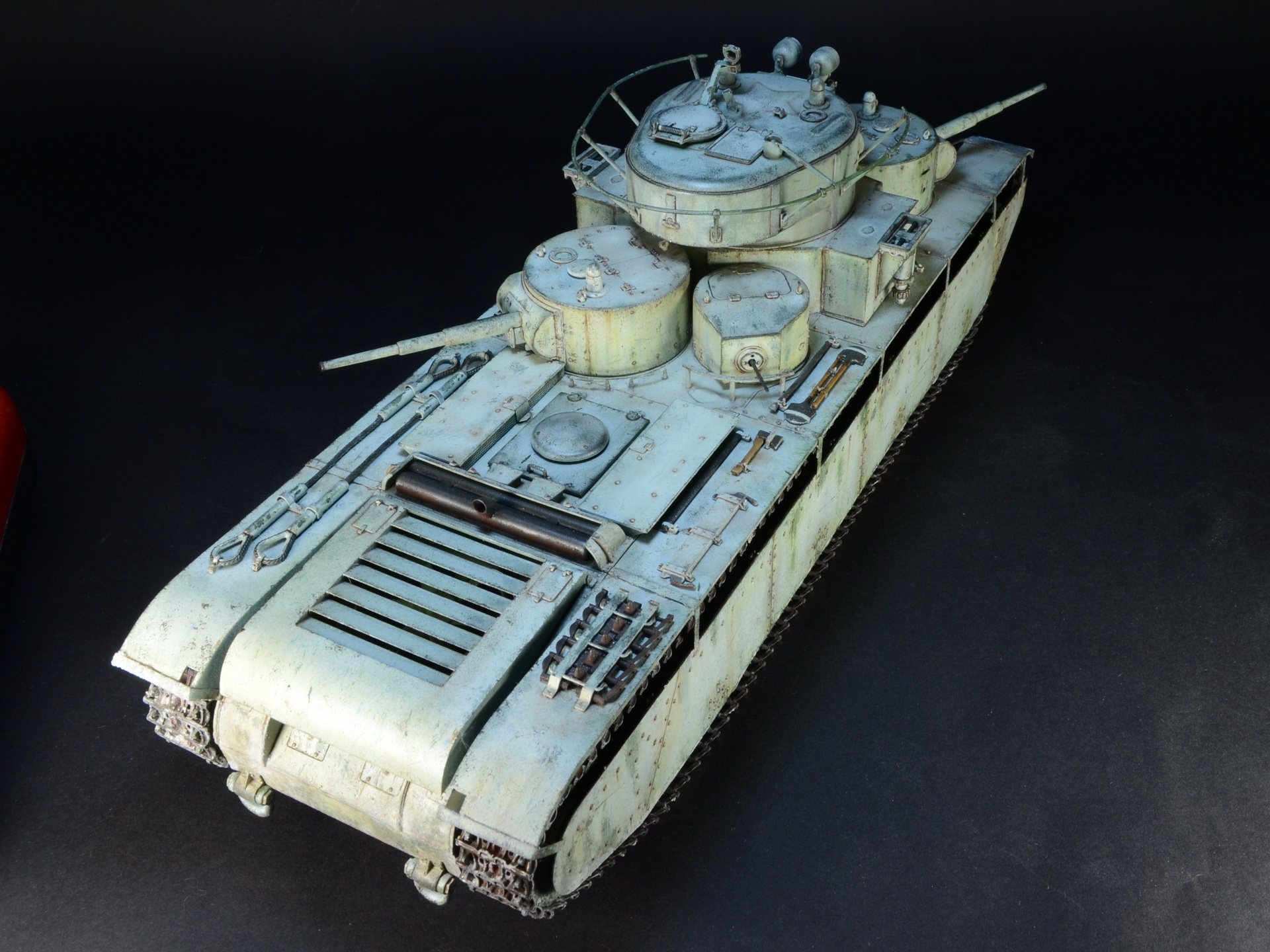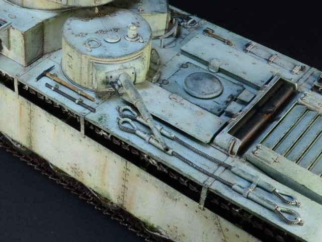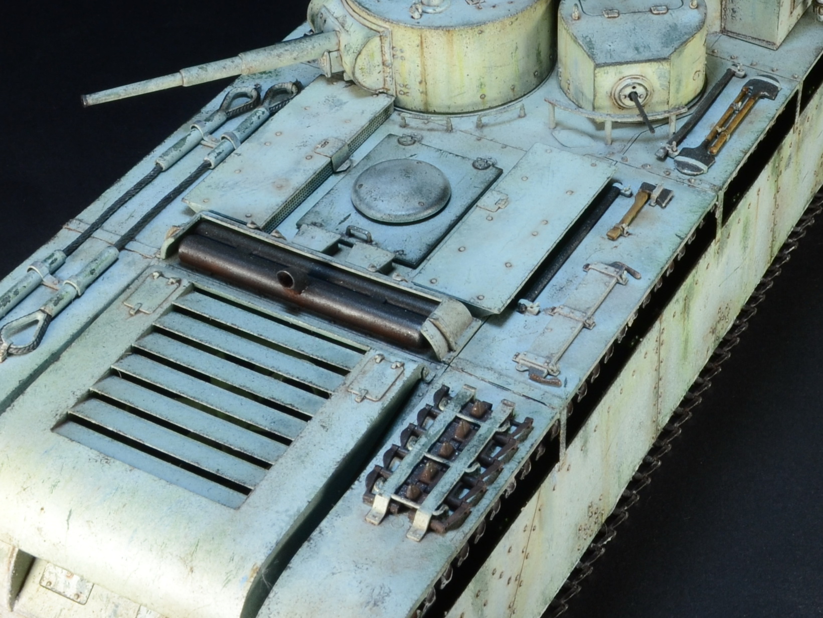 Исходником послужил набор № 83842, оставивший очень приятные впечатления от сборки. Не без придиризмов конечно: не понравилось крепление в шип с корпусом надгусеничных полок – пластик у набора довольно мягкий, а входные гнезда креплений расположены очень близко к верхним деталям корпуса. При малейшем перекосе или надавливании на полку (а полки довольно длинные), пластик в месте крепления заметно деформируется. Крепление бортовых экранов к переборкам в этом наборе абсолютно не копийно (если надумается собрать т-35 с сорванными или демонтированными экранами), при этом очень удачно выполнены тележки с опорными катками. Необходима значительная обрезка (подгонка) травленых полос крепления бортовых экранов с двух сторон надгусеничных полок (очень переразмерены).