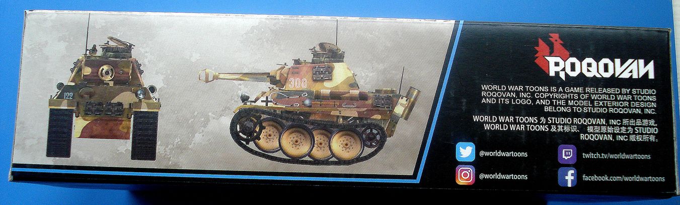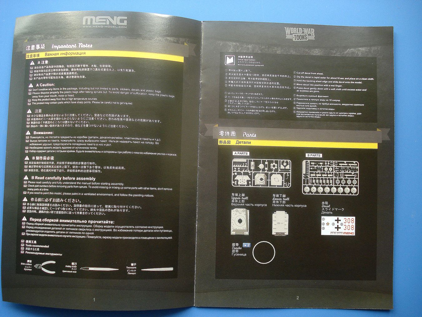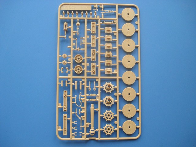 В стандартной для данной серии небольшой коробочке с боковой загрузкой имеем два литника с деталями,верх и низ ванны корпуса даны отдельными деталями,виниловые гусеницы,небольшая декаль.