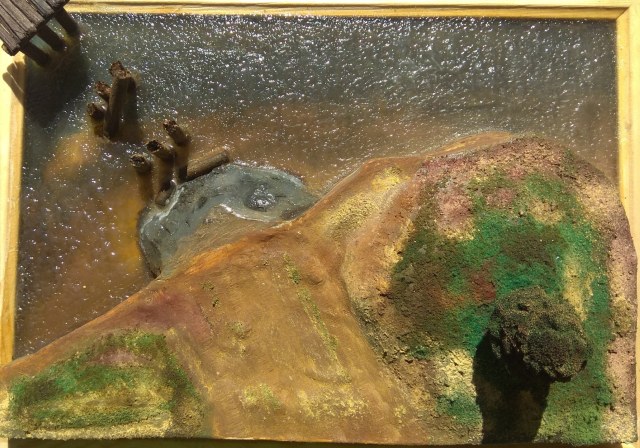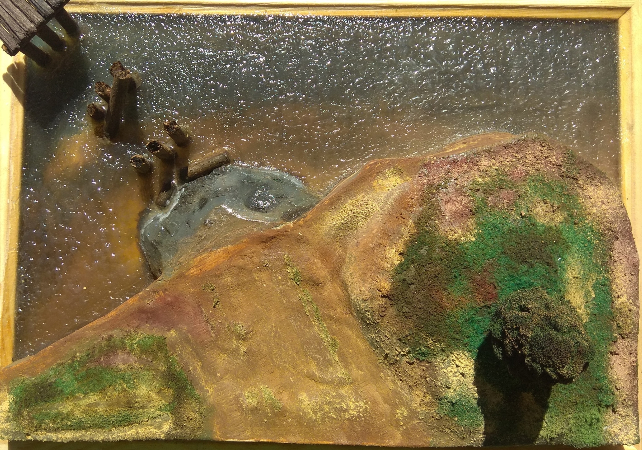 Основание из рамки для фото, берег - гипс, вода эпоксидный клей и герметик, дерево - губка, травяной покров - флок, мост из строительных чепиков.