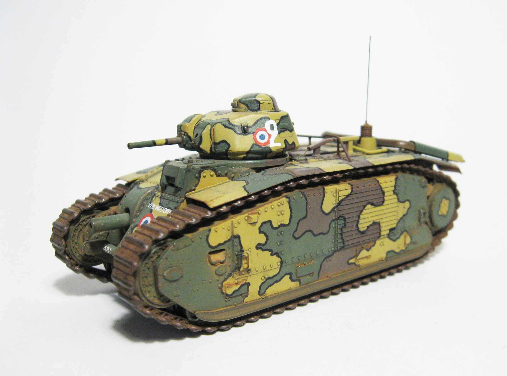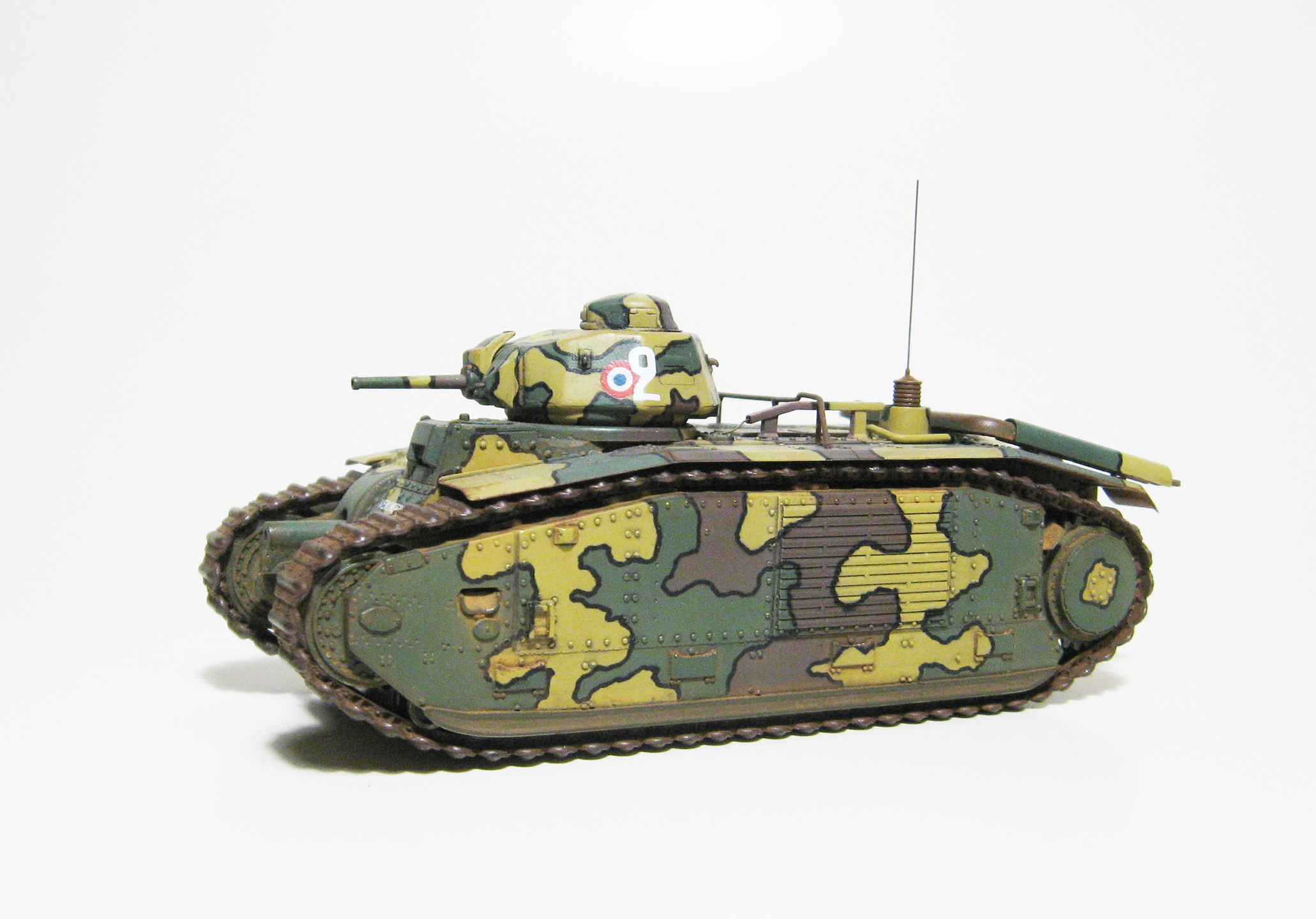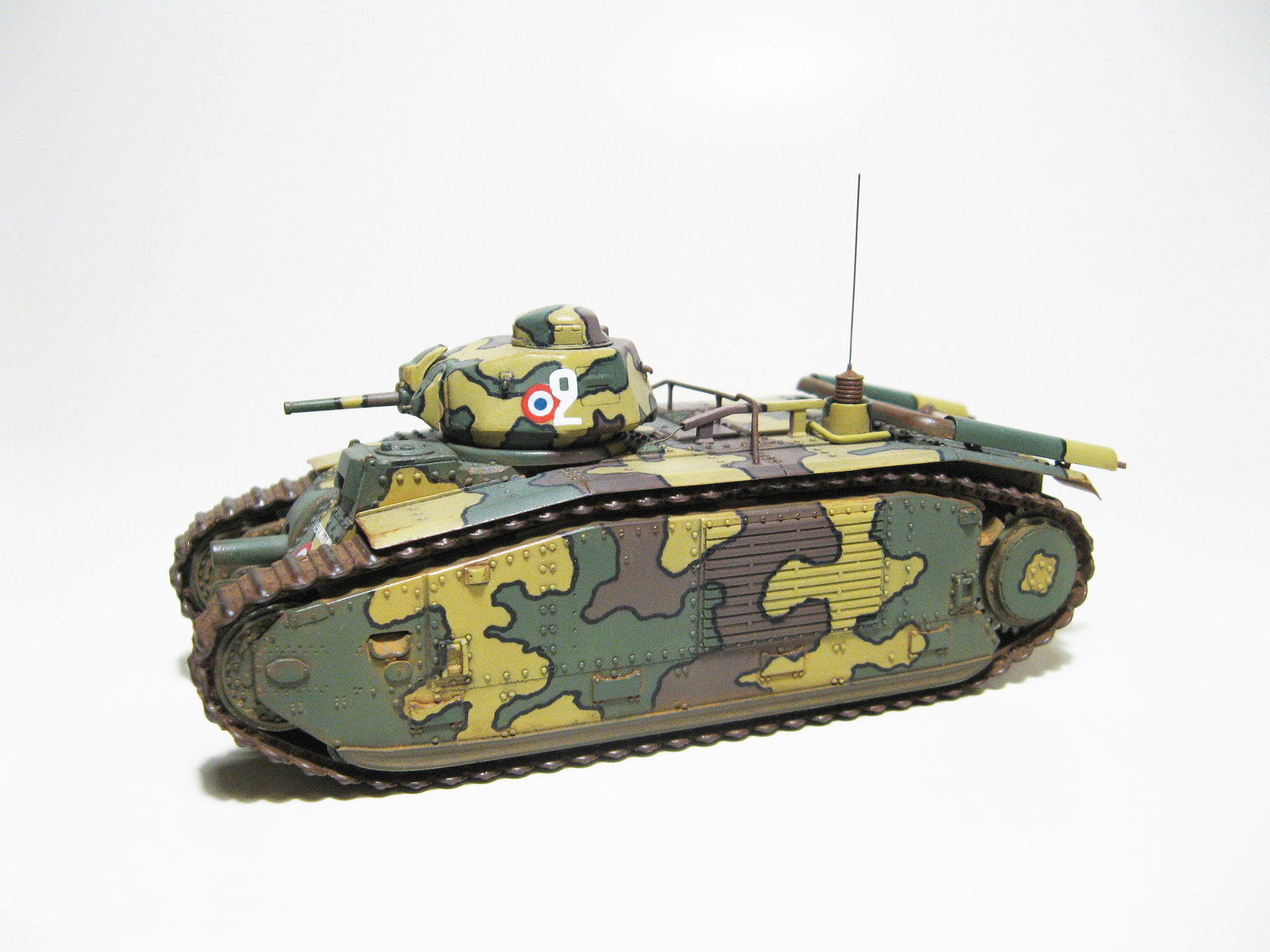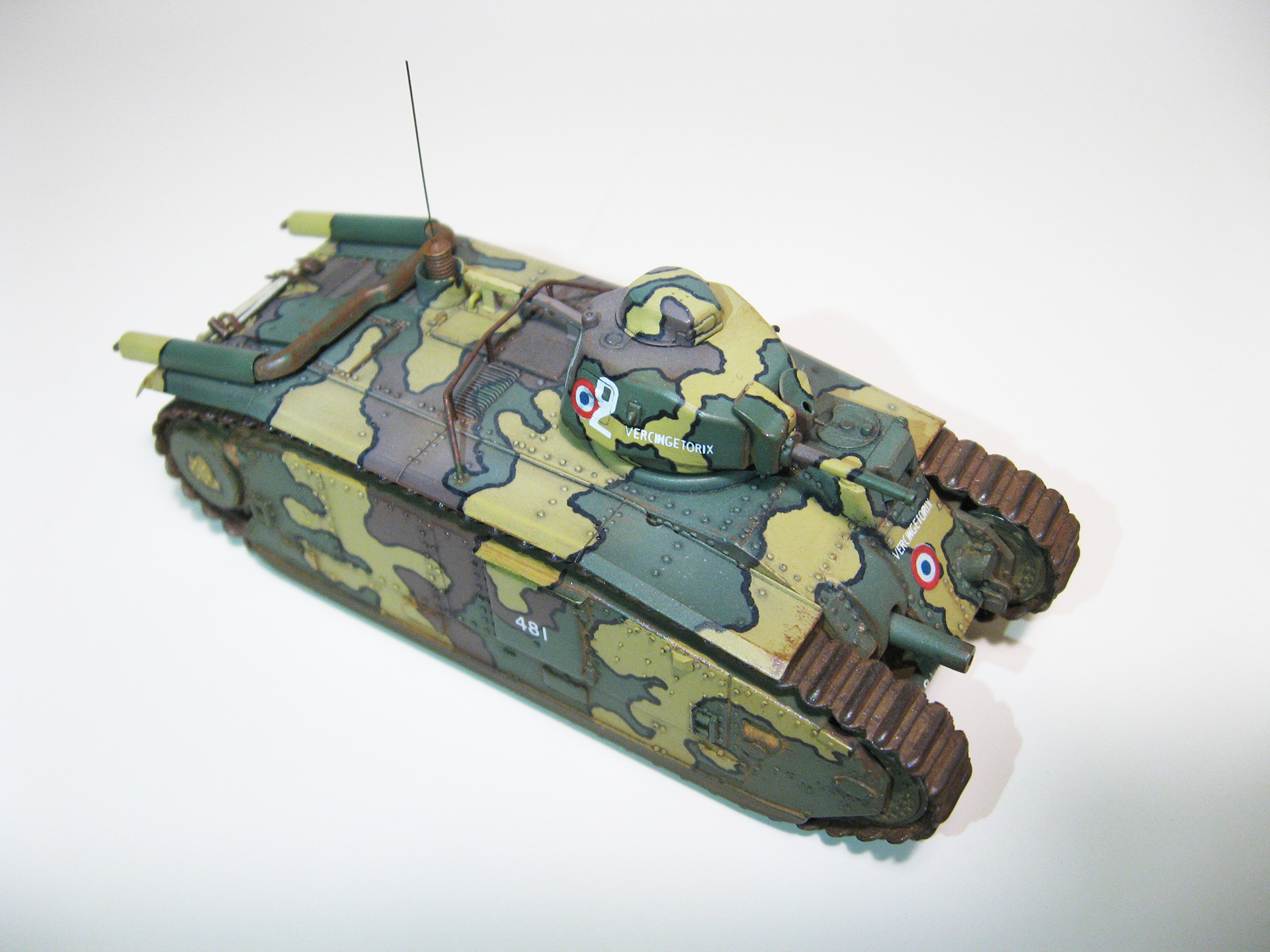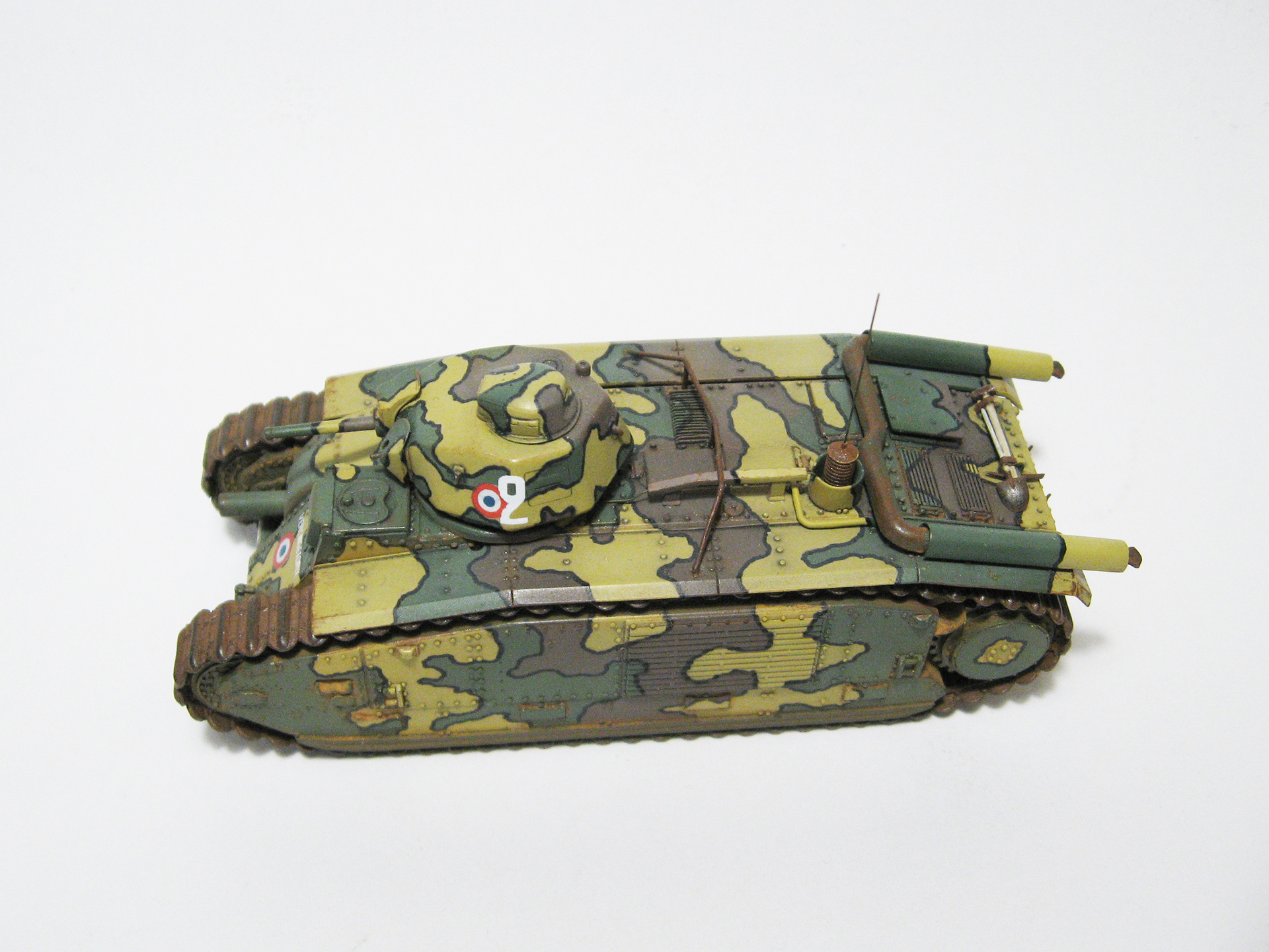 По варианту окраски сомнений не возникло: мне однозначно нравится трёхцветный камуфляж с чёрным кантом, и чтобы ещё кокарды французские были. Краска- Mr. Color, кант- нарисовал маркером. Новым для меня делом была окраска гусениц. После некоторых тренировок я нашёл для себя такую последовательность: окраска ржавчиной, смывка маслом (чёрный), припудривание пастелью цвета глины, натирание выступающих частей простым карандашом. Краску «ржавчина» выбирал из нескольких вариантов от разных производителей и, как ни странно, «Хома» мне понравилась больше, чем именитый «Хамброл». Ржавчина- акрил, он довольно неплохо держится на виниловых гусеницах даже без грунта. Закрепить гусли оказалось довольно непросто. Для этого даже пришлось удалить некоторые зубья ведущих колёс, мешавшие гусенице плавно его охватывать. Т.к. винил клеем не клеится (по кр. мере у меня такого клея нет), гусли закрепил скобами, вклееными в корпус (это дело спрятано под брызговиками). Смывка- масло на уайтспирите. Ржавчина, потёртости, запылённость- очень в меру, не хотел делать сильно поюзаный танк.