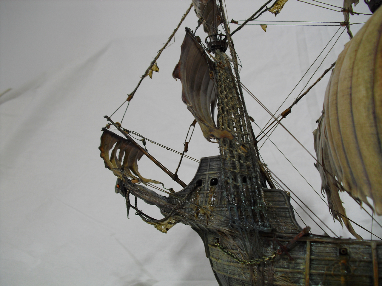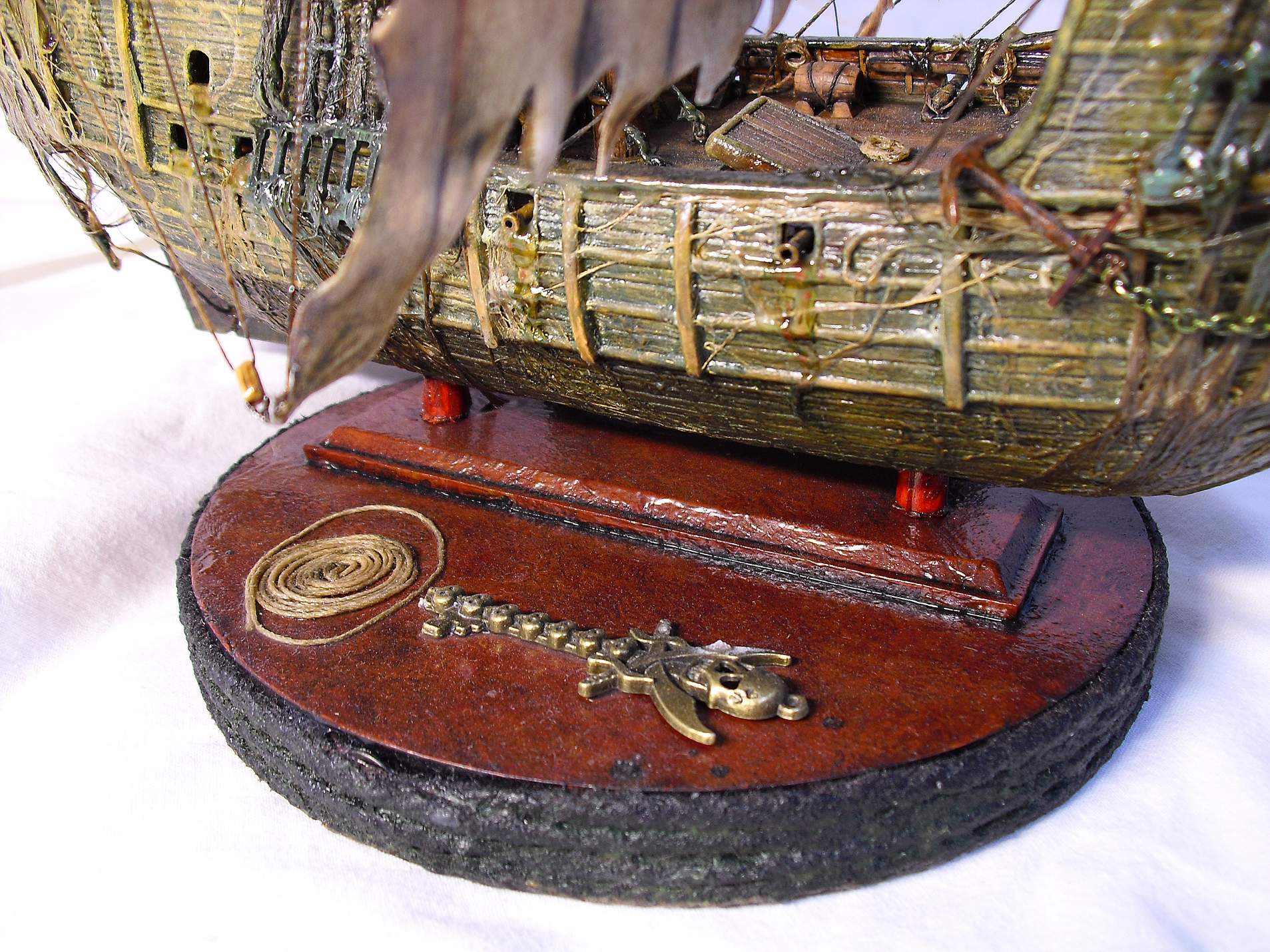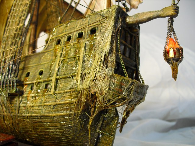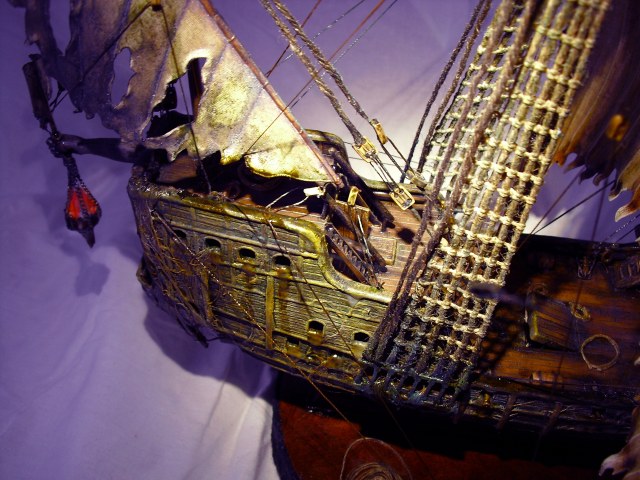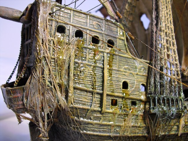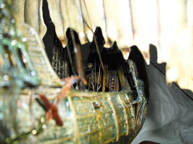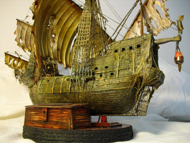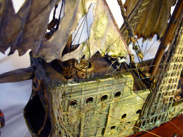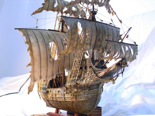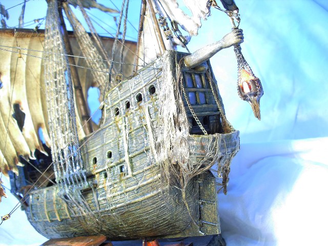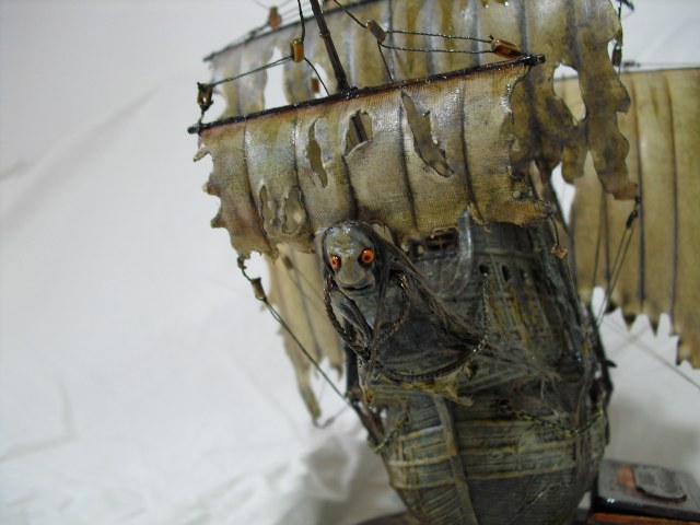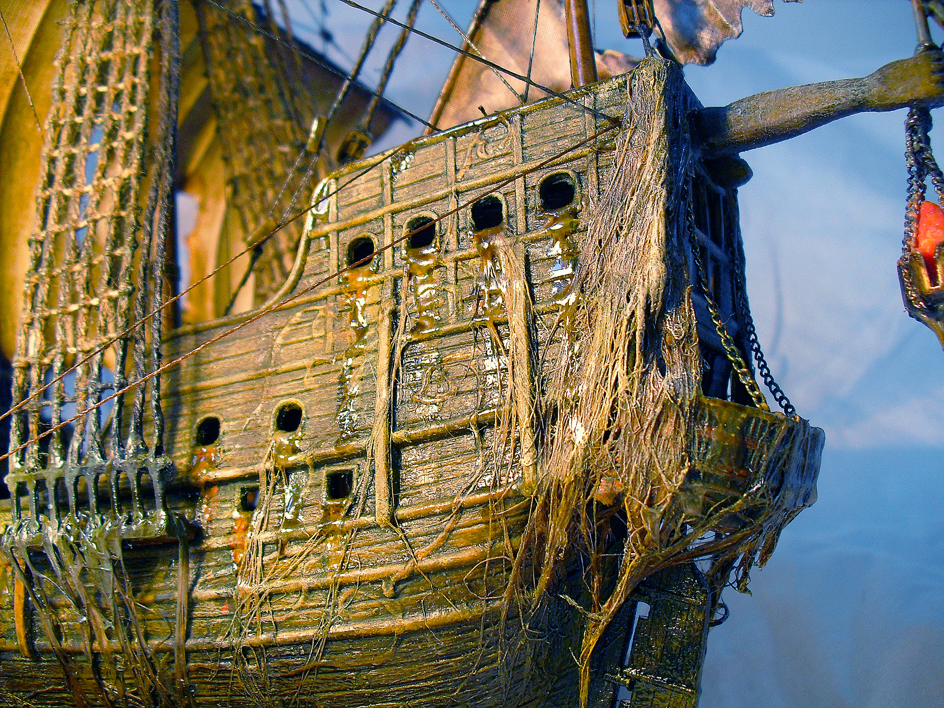 В качестве такелажа, использовал три вида нитей, веревку из льна, нить хб. и обычную нить что шла в комплекте (капроновая) для стоячего такелажа использовал нить из льна толстую, для эффекта что это типа веревка из водорослей . Пытался создать образ корабля более сказочный, нежели исторический разрушенный. Обклеивал корабль в некоторых местах чесаным льном. также немного изменил корму и носовую часть. добавил фигуру морского чудища. Скорее не фигуру а морское чудеще прикованное к судну колдовским проклятием. Так же пытался сделать на корме вид руки которая держит флаг с факелом или типа огненным светильником. Саму модель поставил на подставку неровно, завалил правый бок, так сказать этим самым добавил модели небрежности. Огонь конечно так себе получился. Провел свет, типа на корабле горит вечный огонь для обитающих там призраков и мифических существ. ------ --фото шоп использовал только на первой фотке. та что на заставке.---------