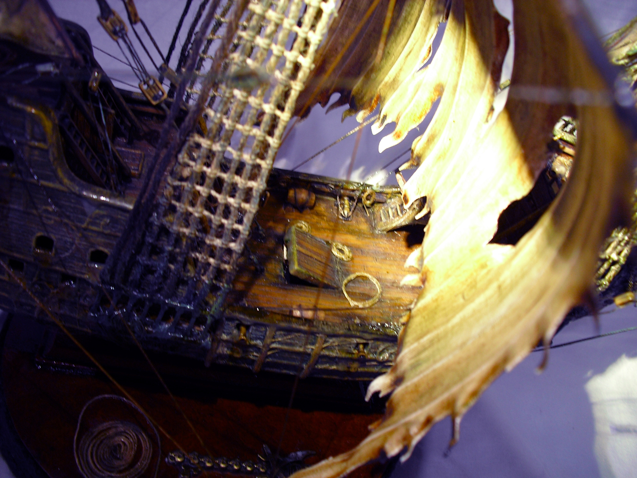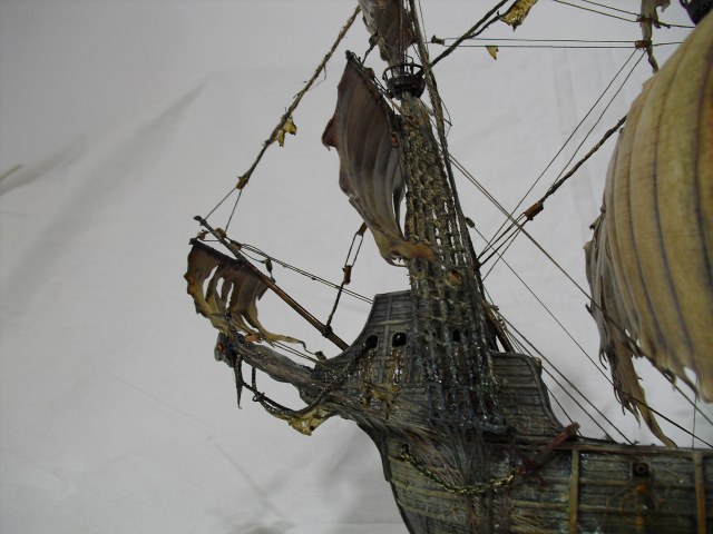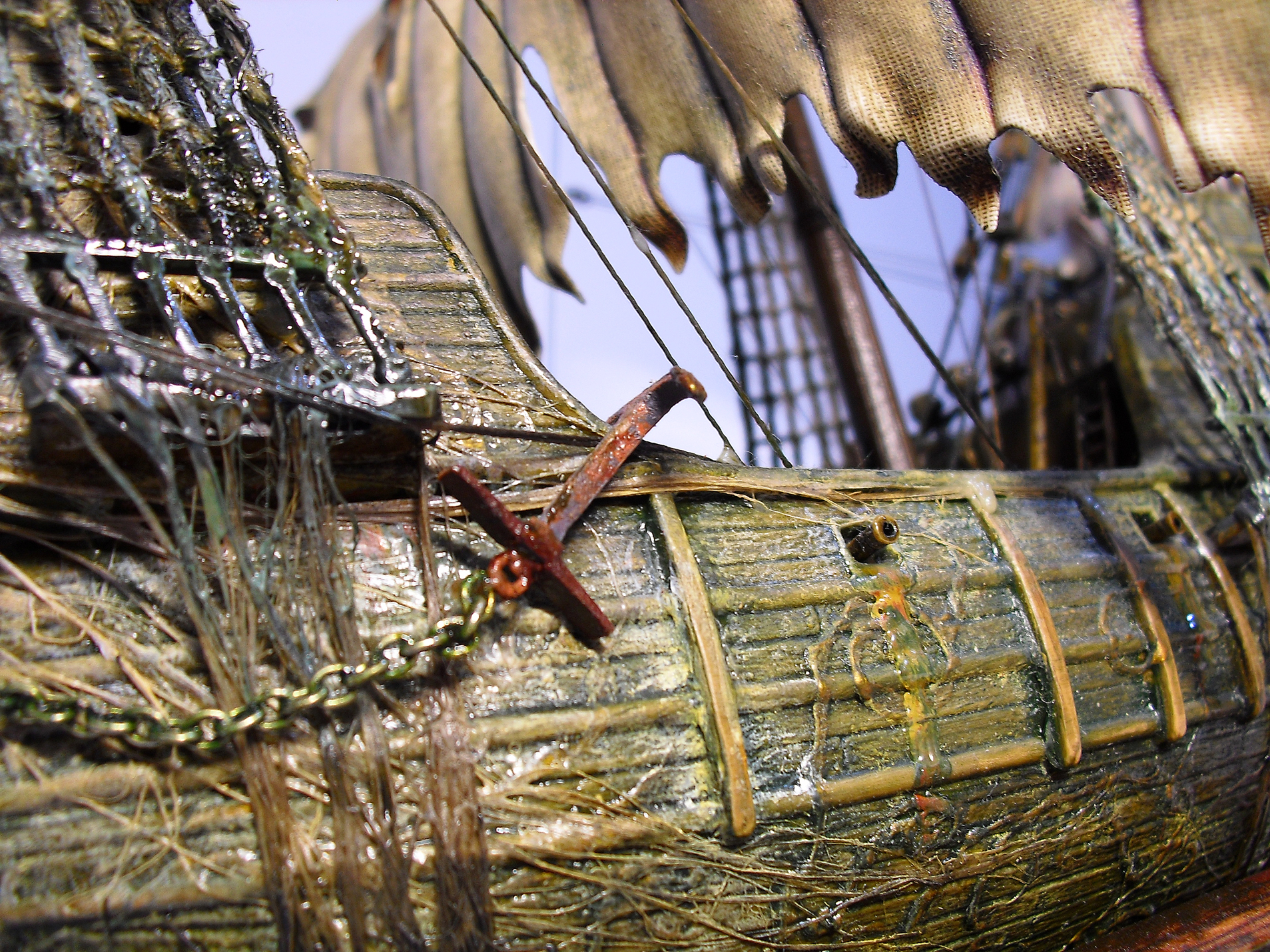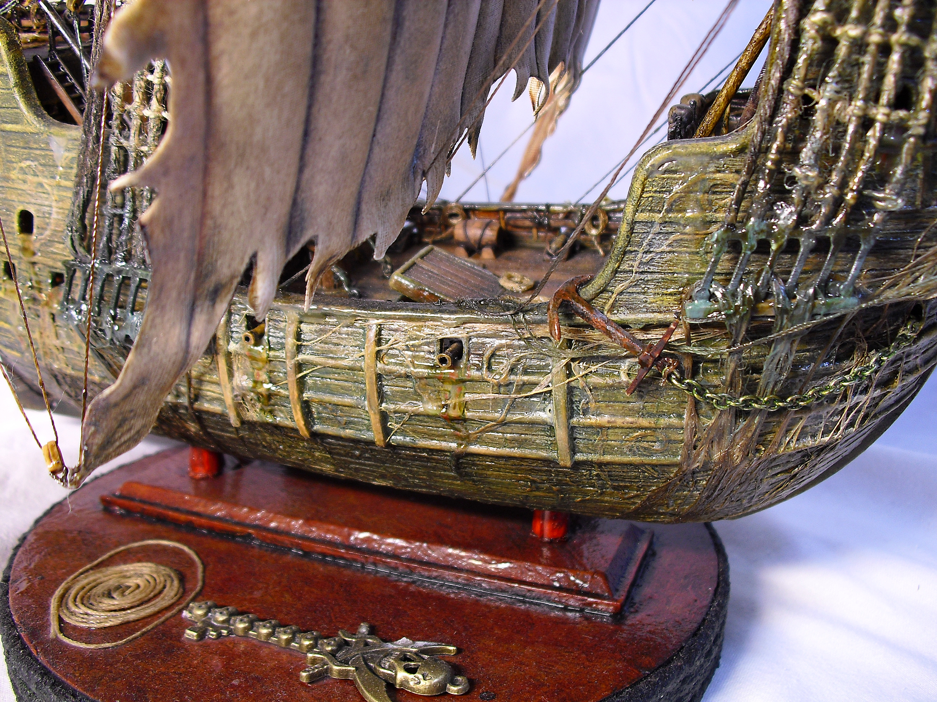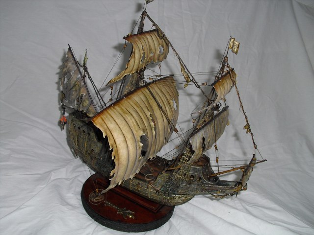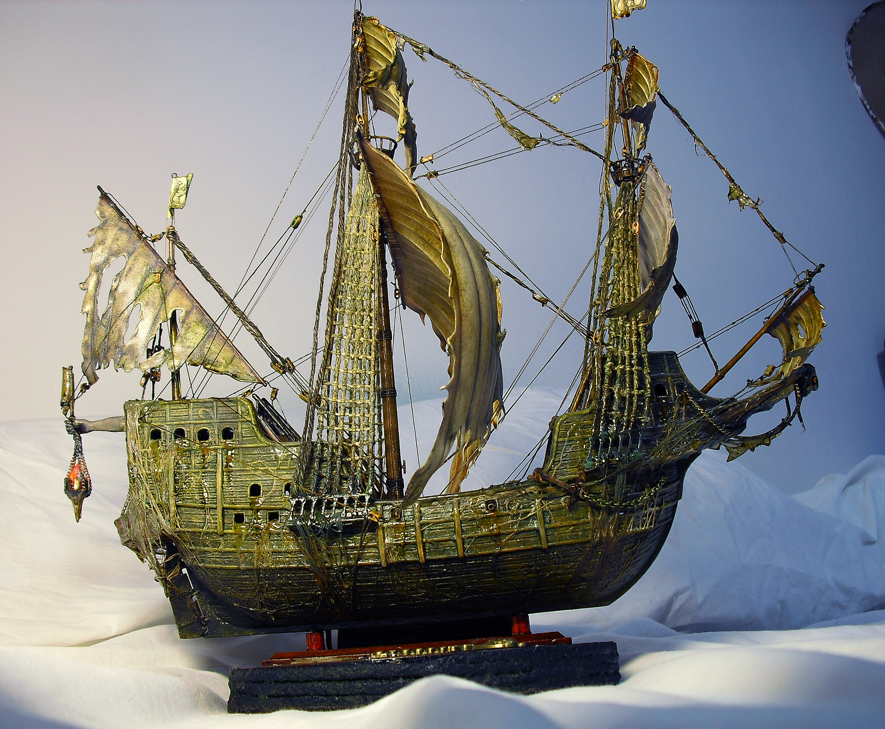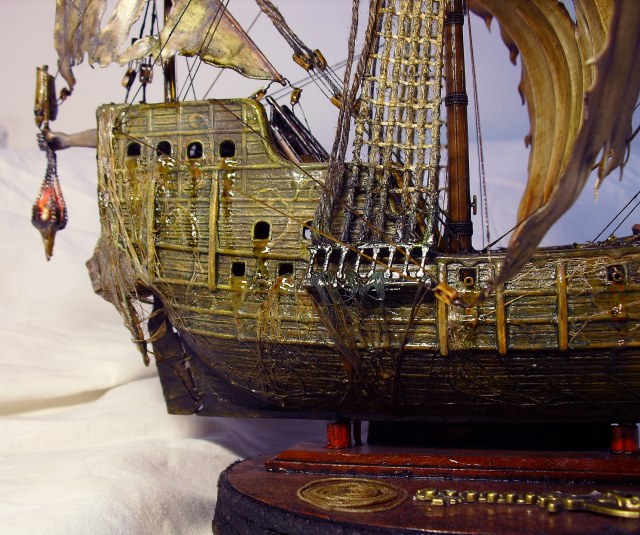В качестве такелажа, использовал три вида нитей, веревку из льна, нить хб. и обычную нить что шла в комплекте (капроновая) для стоячего такелажа использовал нить из льна толстую, для эффекта что это типа веревка из водорослей . Пытался создать образ корабля более сказочный, нежели исторический разрушенный. Обклеивал корабль в некоторых местах чесаным льном. также немного изменил корму и носовую часть. добавил фигуру морского чудища. Скорее не фигуру а морское чудеще прикованное к судну колдовским проклятием. Так же пытался сделать на корме вид руки которая держит флаг с факелом или типа огненным светильником. Саму модель поставил на подставку неровно, завалил правый бок, так сказать этим самым добавил модели небрежности. Огонь конечно так себе получился. Провел свет, типа на корабле горит вечный огонь для обитающих там призраков и мифических существ. ------ --фото шоп использовал только на первой фотке. та что на заставке.---------
