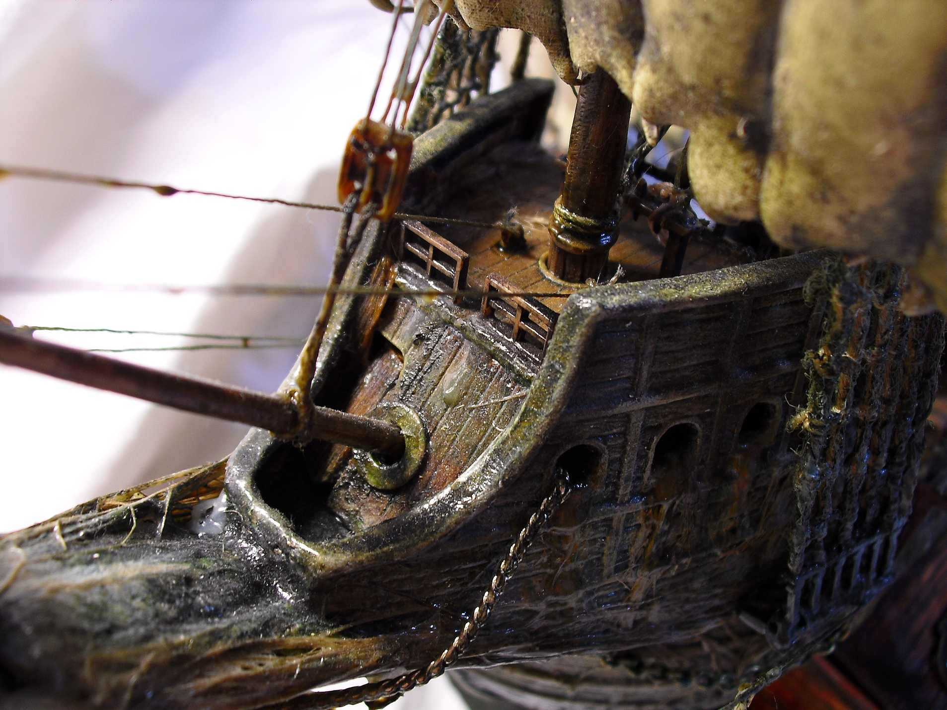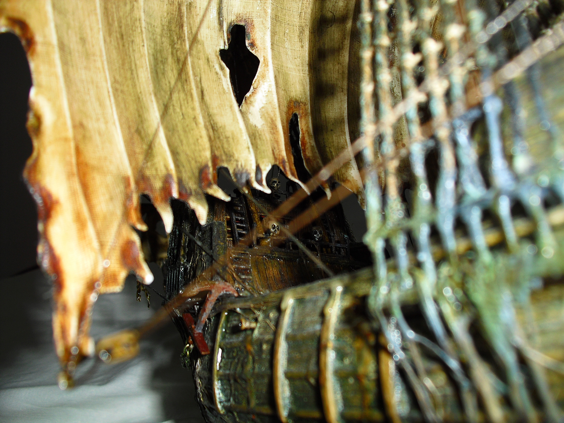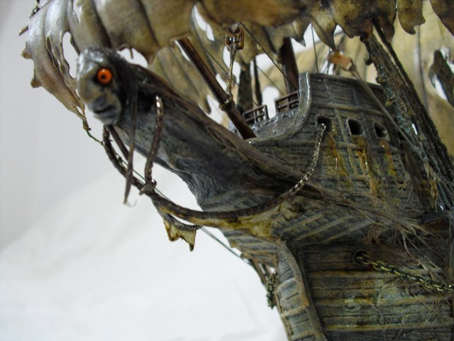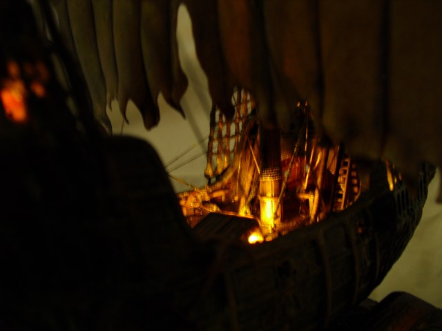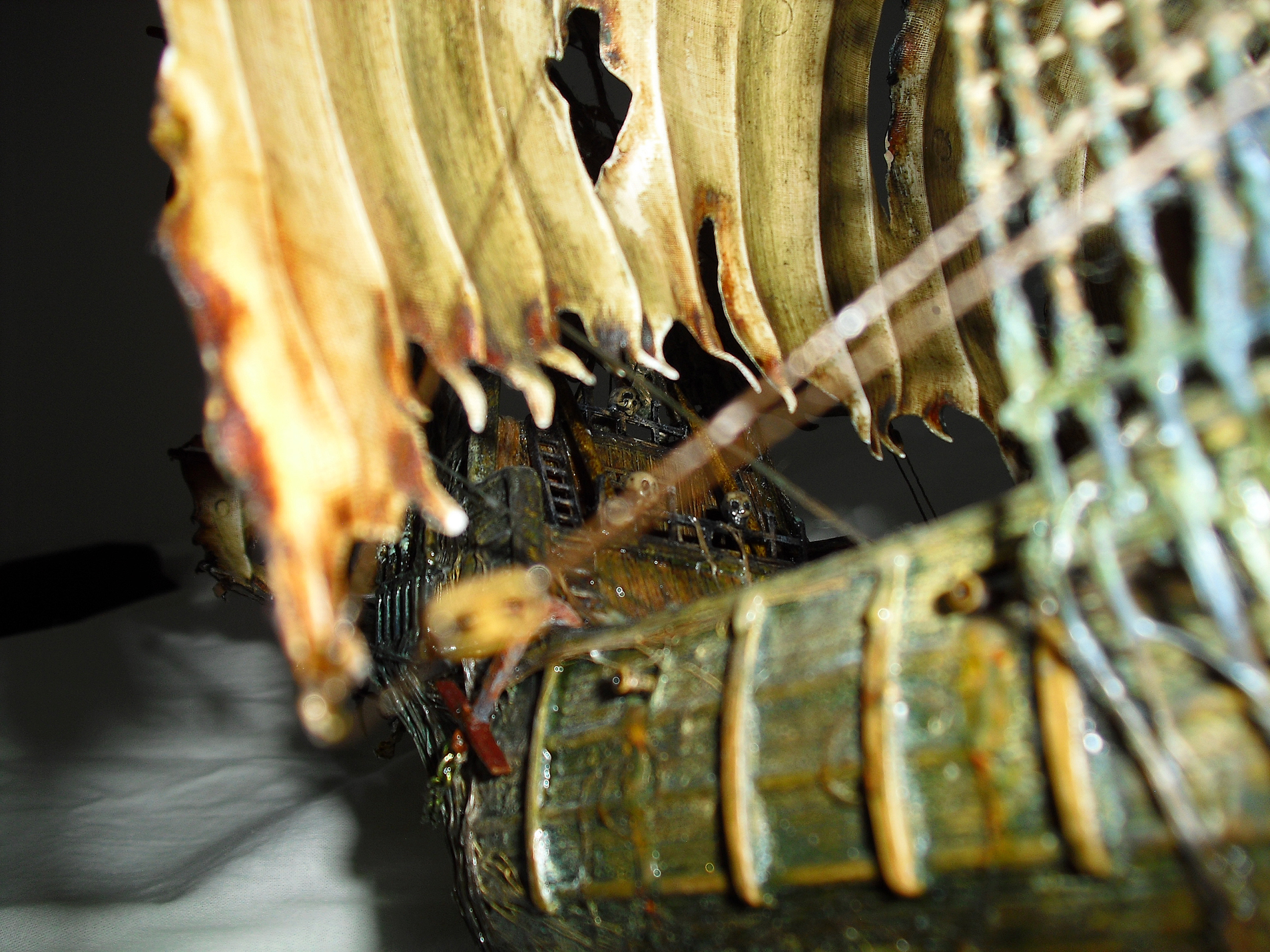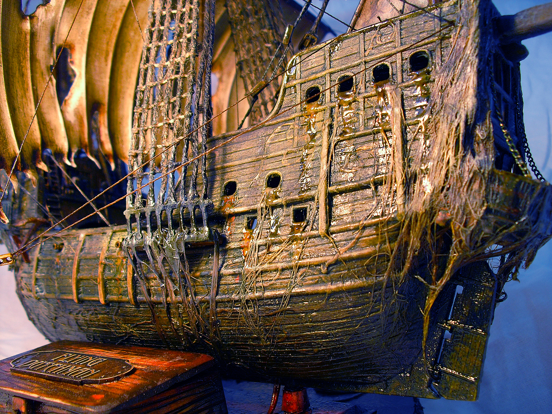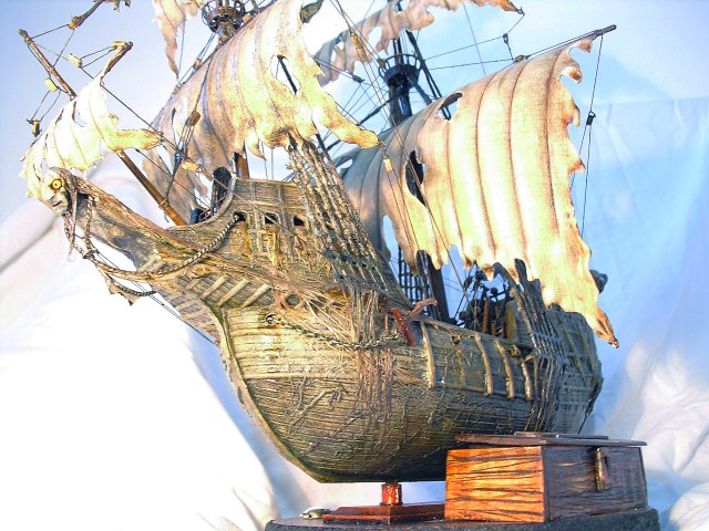 В качестве такелажа, использовал три вида нитей, веревку из льна, нить хб. и обычную нить что шла в комплекте (капроновая) для стоячего такелажа использовал нить из льна толстую, для эффекта что это типа веревка из водорослей . Пытался создать образ корабля более сказочный, нежели исторический разрушенный. Обклеивал корабль в некоторых местах чесаным льном. также немного изменил корму и носовую часть. добавил фигуру морского чудища. Скорее не фигуру а морское чудеще прикованное к судну колдовским проклятием. Так же пытался сделать на корме вид руки которая держит флаг с факелом или типа огненным светильником. Саму модель поставил на подставку неровно, завалил правый бок, так сказать этим самым добавил модели небрежности. Огонь конечно так себе получился. Провел свет, типа на корабле горит вечный огонь для обитающих там призраков и мифических существ. ------ --фото шоп использовал только на первой фотке. та что на заставке.---------