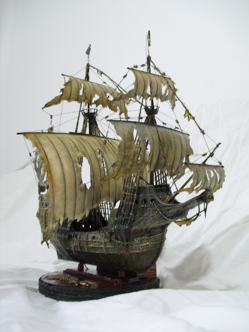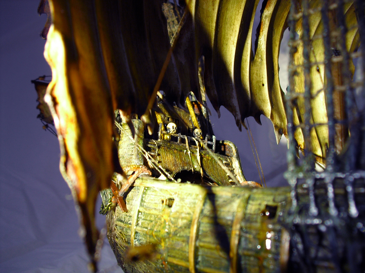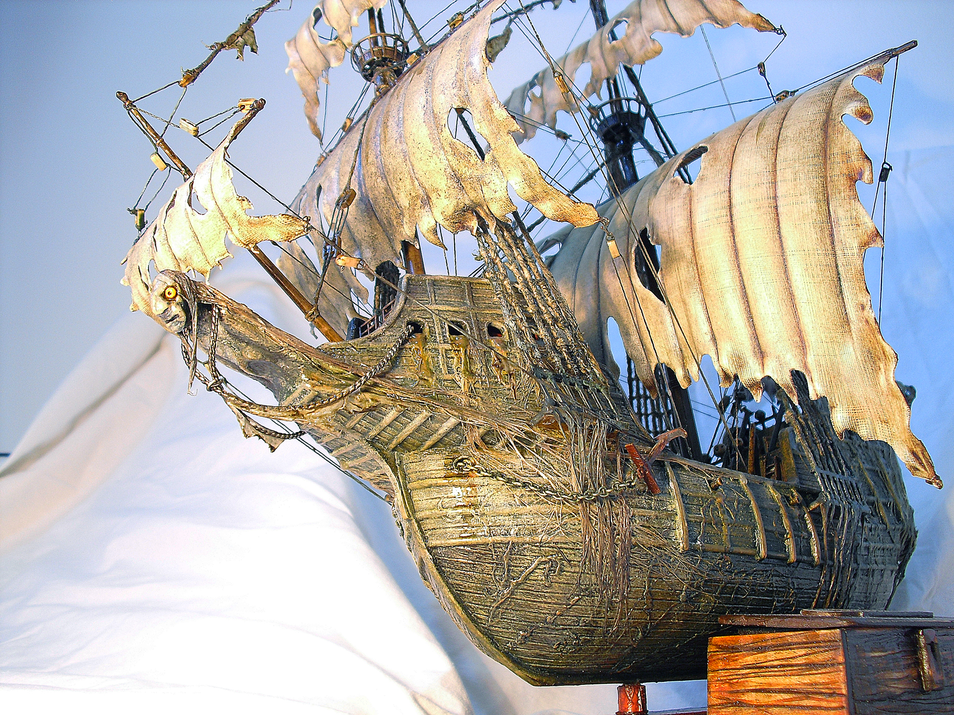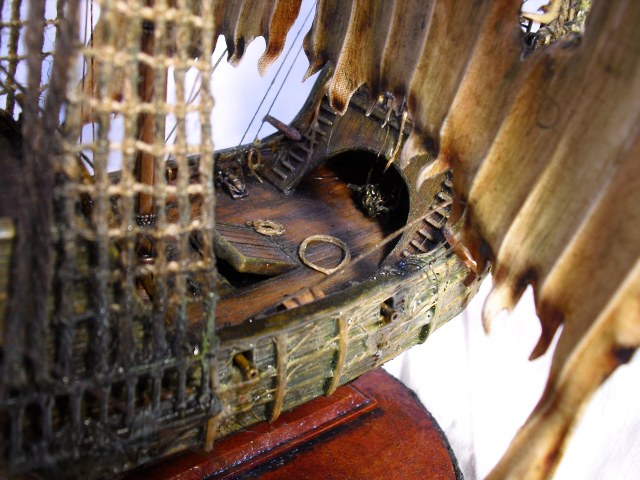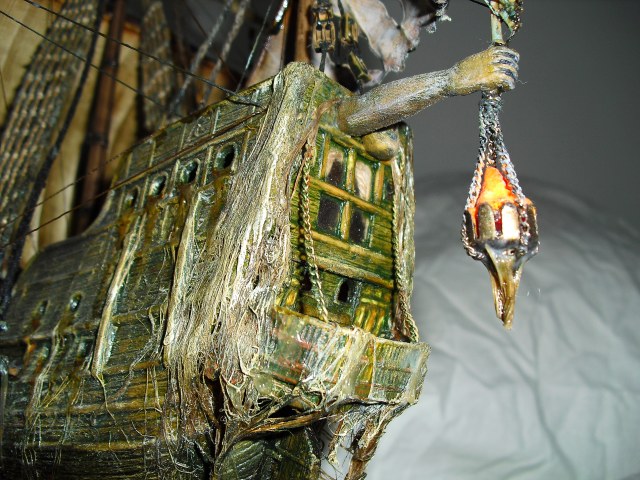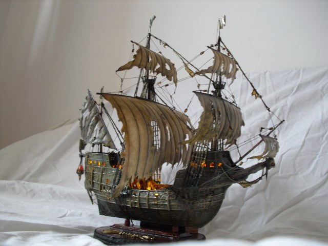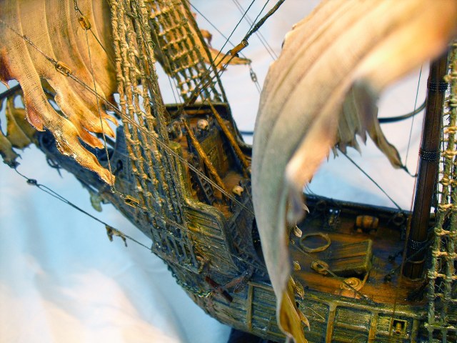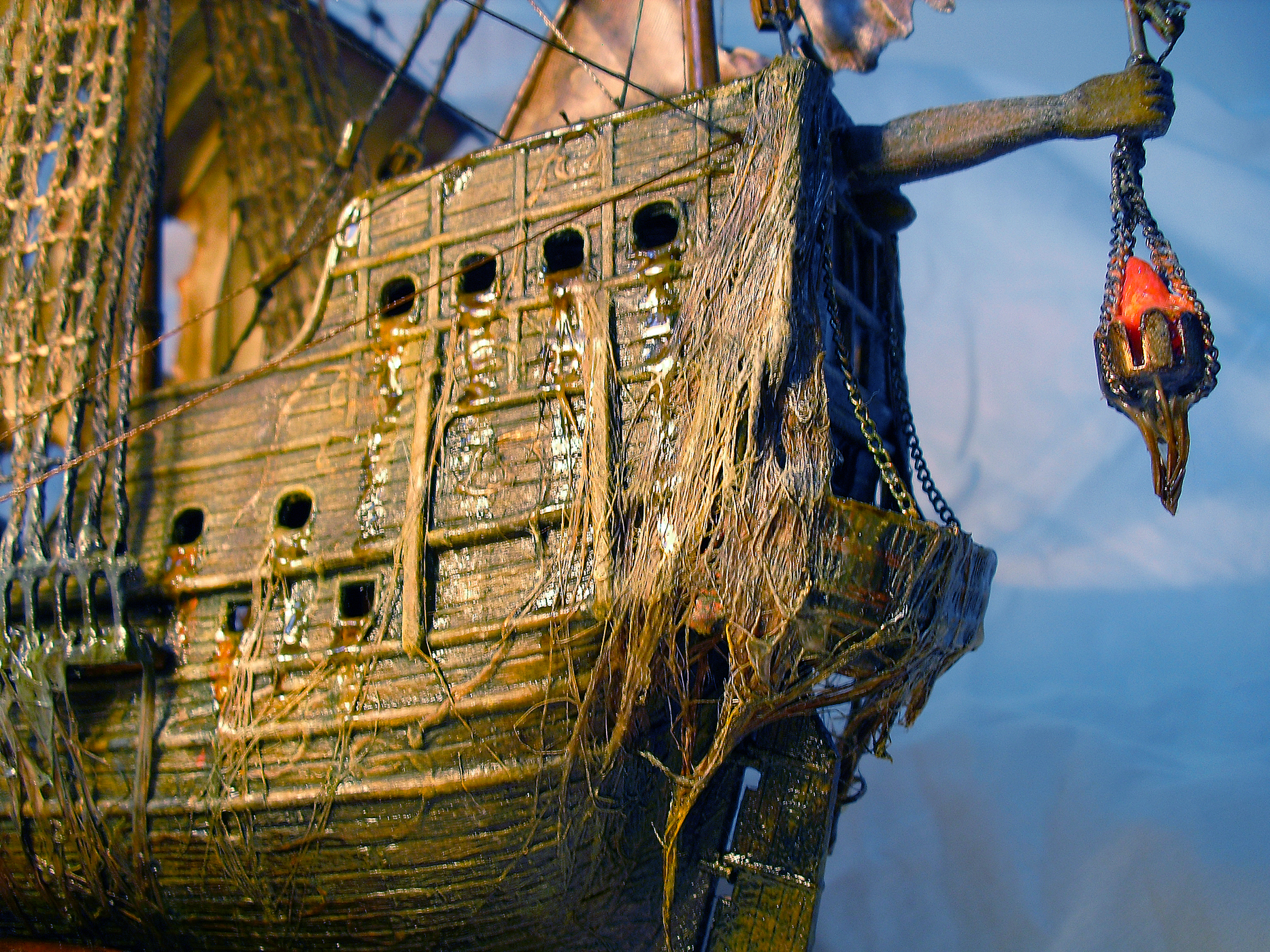 В качестве такелажа, использовал три вида нитей, веревку из льна, нить хб. и обычную нить что шла в комплекте (капроновая) для стоячего такелажа использовал нить из льна толстую, для эффекта что это типа веревка из водорослей . Пытался создать образ корабля более сказочный, нежели исторический разрушенный. Обклеивал корабль в некоторых местах чесаным льном. также немного изменил корму и носовую часть. добавил фигуру морского чудища. Скорее не фигуру а морское чудеще прикованное к судну колдовским проклятием. Так же пытался сделать на корме вид руки которая держит флаг с факелом или типа огненным светильником. Саму модель поставил на подставку неровно, завалил правый бок, так сказать этим самым добавил модели небрежности. Огонь конечно так себе получился. Провел свет, типа на корабле горит вечный огонь для обитающих там призраков и мифических существ. ------ --фото шоп использовал только на первой фотке. та что на заставке.---------