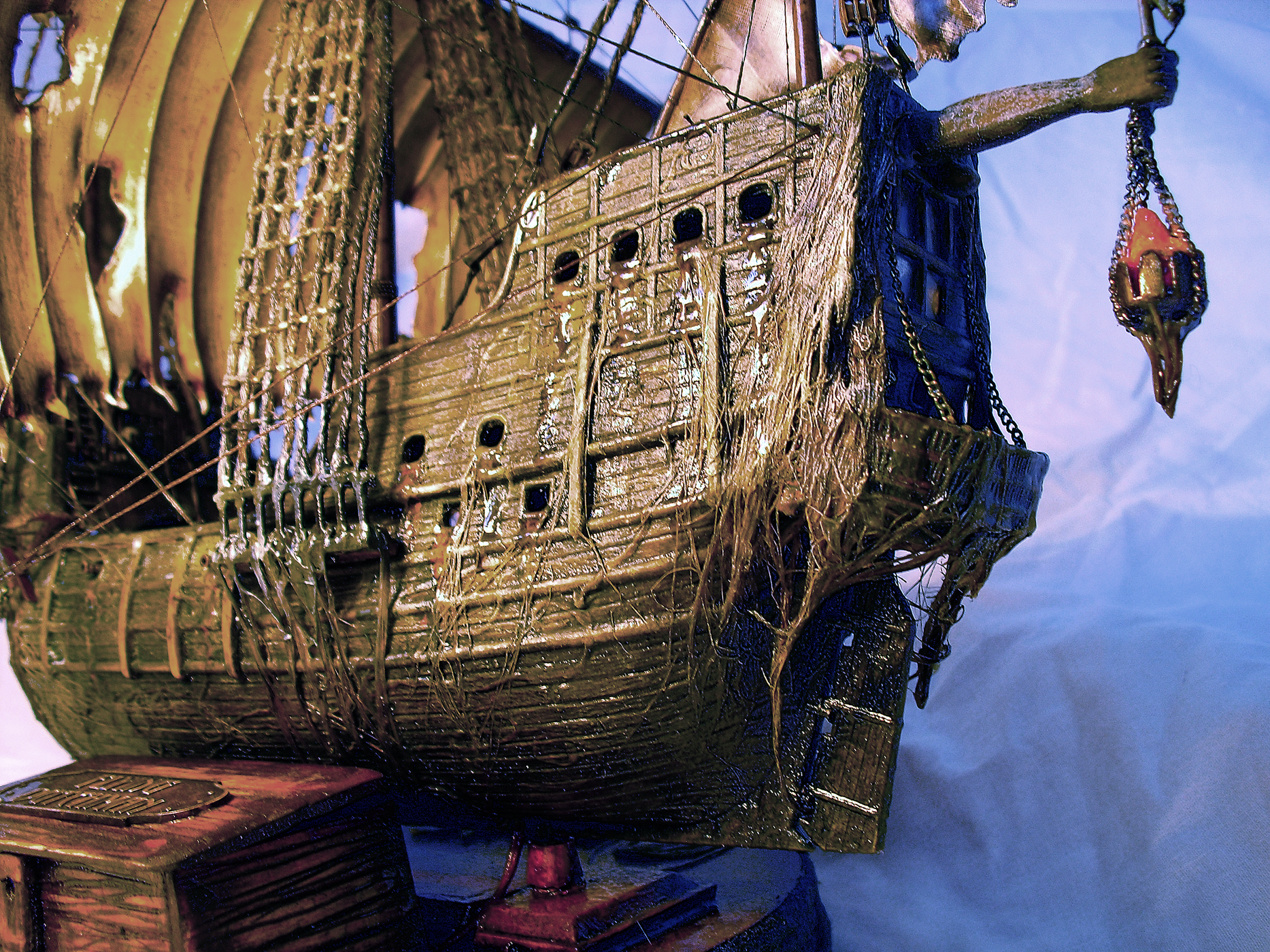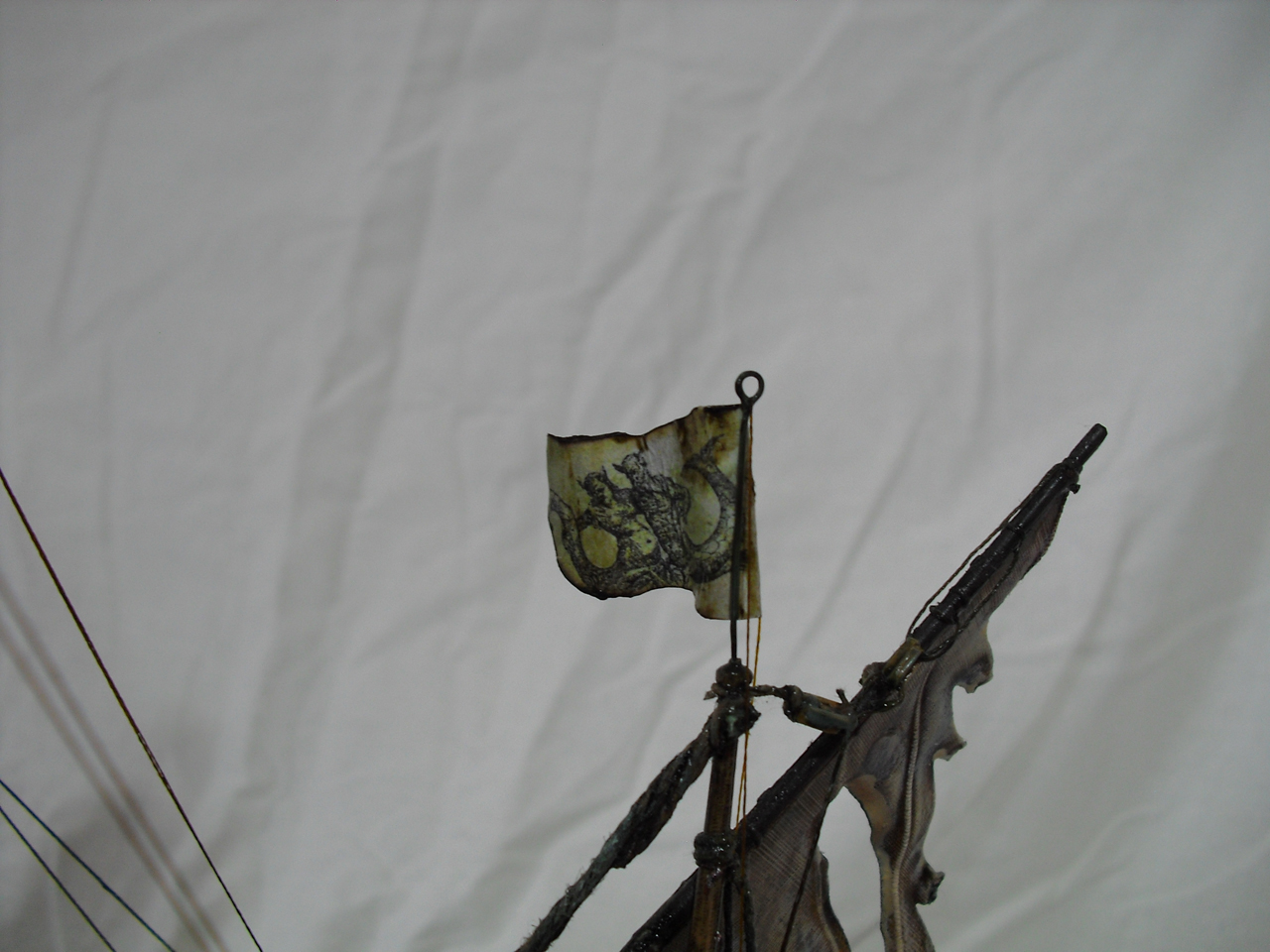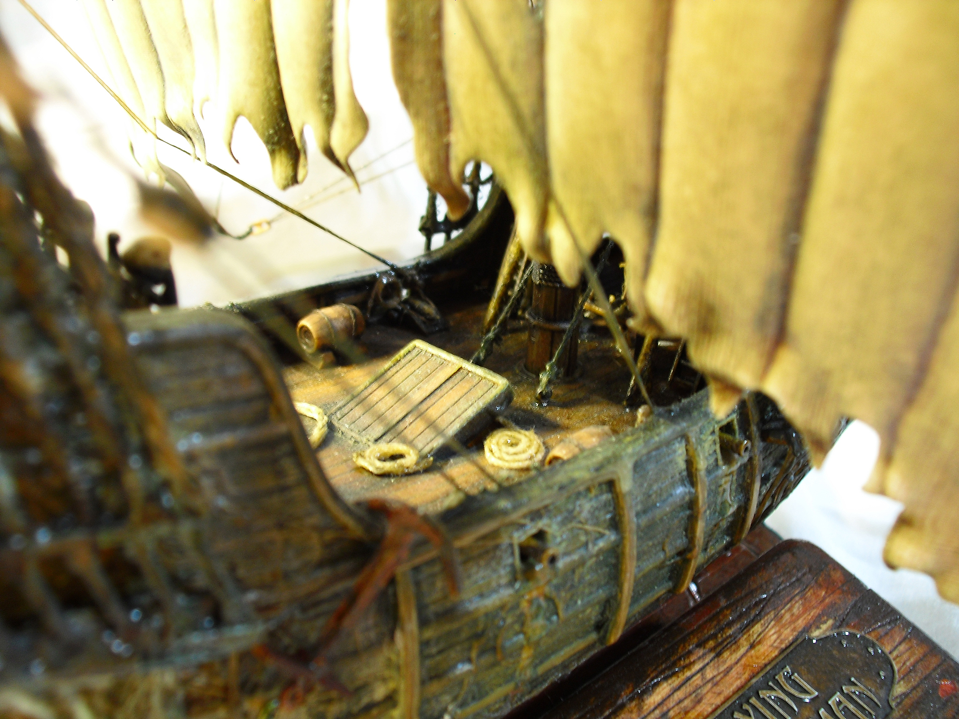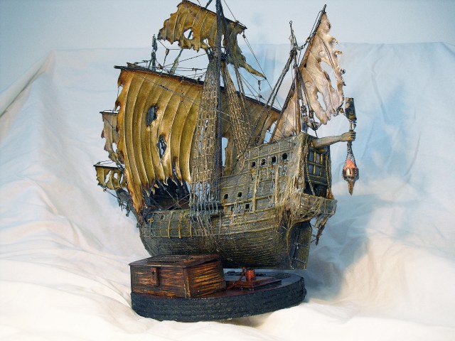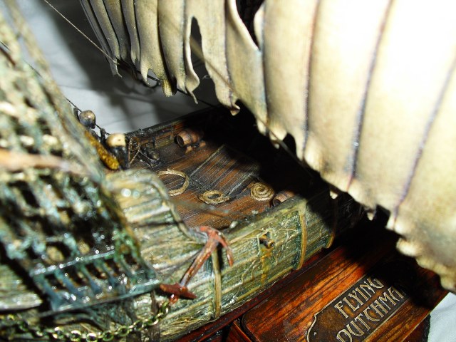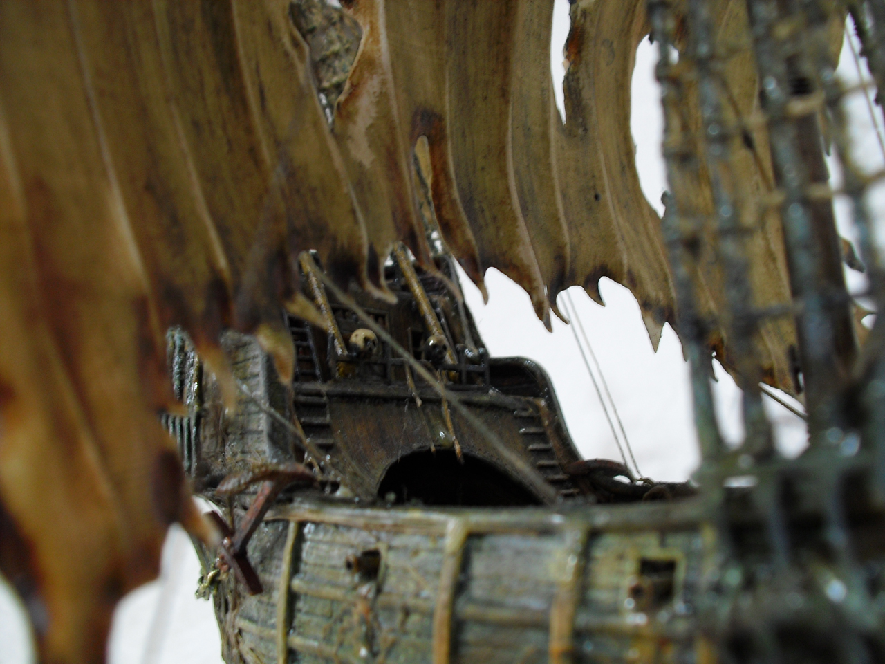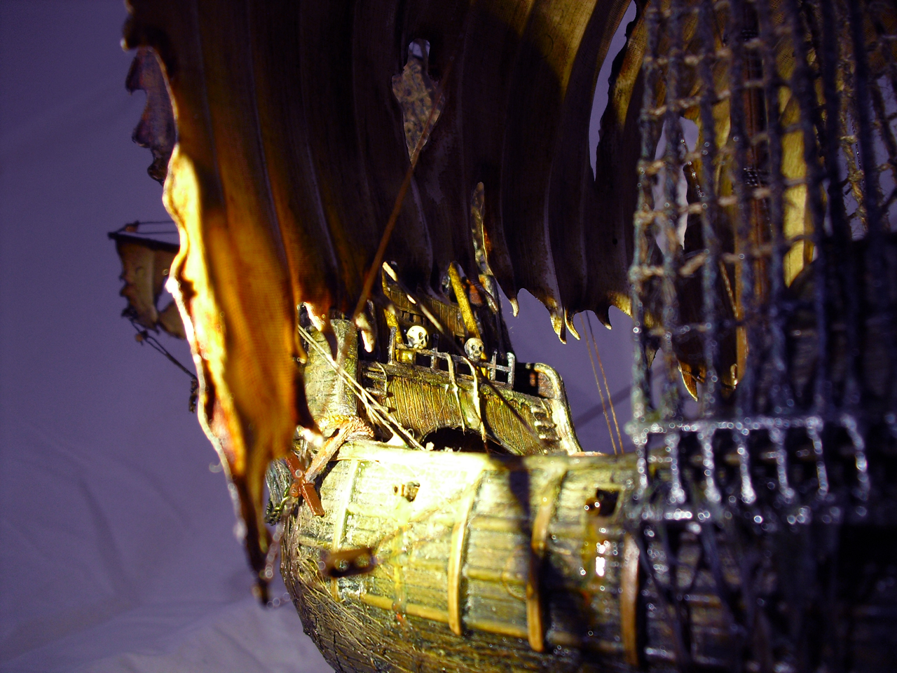 В качестве такелажа, использовал три вида нитей, веревку из льна, нить хб. и обычную нить что шла в комплекте (капроновая) для стоячего такелажа использовал нить из льна толстую, для эффекта что это типа веревка из водорослей . Пытался создать образ корабля более сказочный, нежели исторический разрушенный. Обклеивал корабль в некоторых местах чесаным льном. также немного изменил корму и носовую часть. добавил фигуру морского чудища. Скорее не фигуру а морское чудеще прикованное к судну колдовским проклятием. Так же пытался сделать на корме вид руки которая держит флаг с факелом или типа огненным светильником. Саму модель поставил на подставку неровно, завалил правый бок, так сказать этим самым добавил модели небрежности. Огонь конечно так себе получился. Провел свет, типа на корабле горит вечный огонь для обитающих там призраков и мифических существ. ------ --фото шоп использовал только на первой фотке. та что на заставке.---------