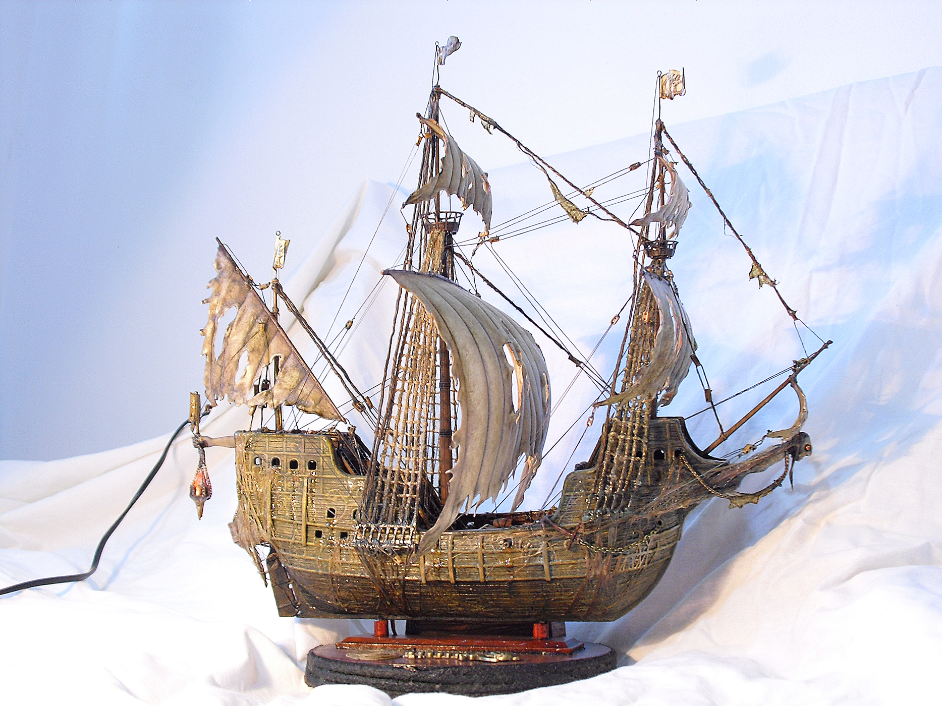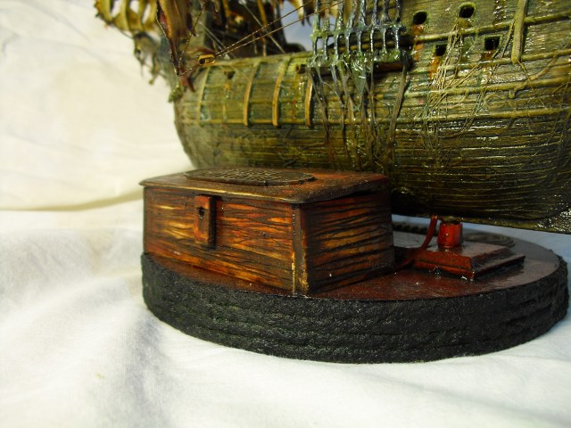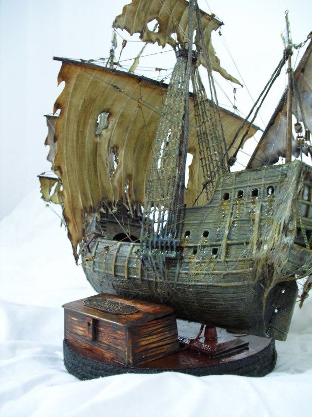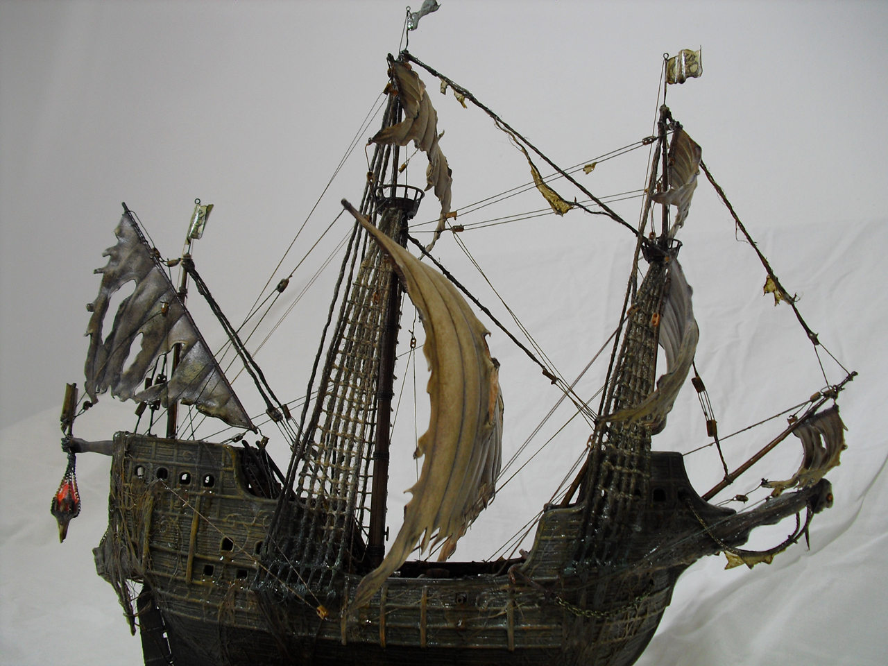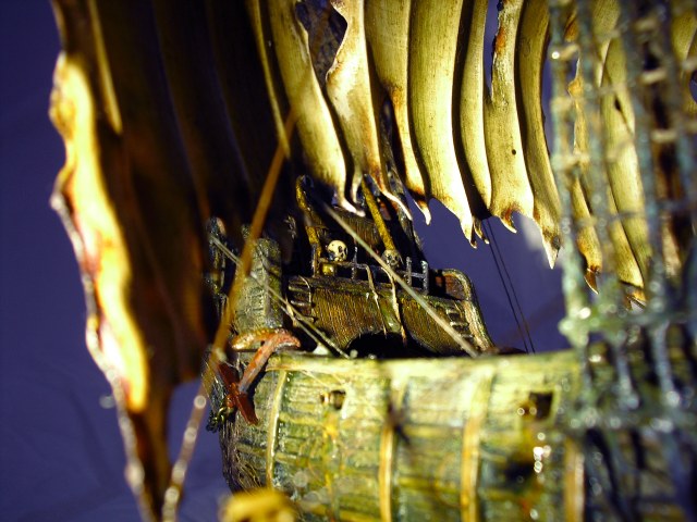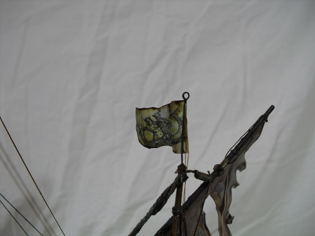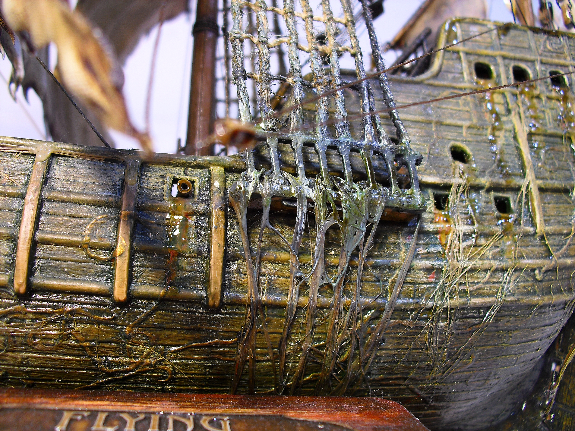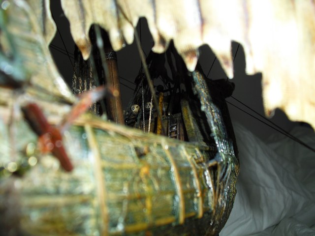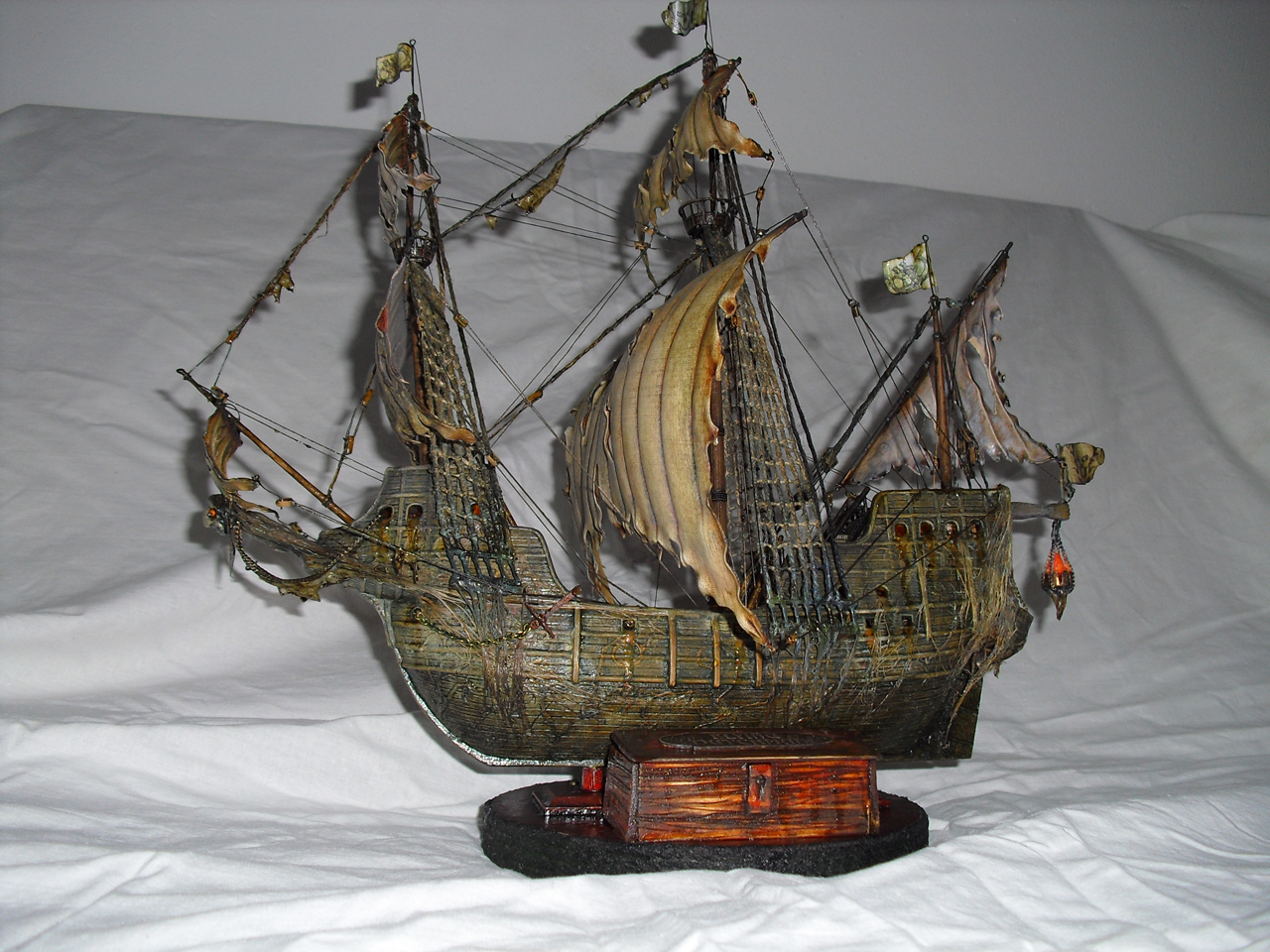 В качестве такелажа, использовал три вида нитей, веревку из льна, нить хб. и обычную нить что шла в комплекте (капроновая) для стоячего такелажа использовал нить из льна толстую, для эффекта что это типа веревка из водорослей . Пытался создать образ корабля более сказочный, нежели исторический разрушенный. Обклеивал корабль в некоторых местах чесаным льном. также немного изменил корму и носовую часть. добавил фигуру морского чудища. Скорее не фигуру а морское чудеще прикованное к судну колдовским проклятием. Так же пытался сделать на корме вид руки которая держит флаг с факелом или типа огненным светильником. Саму модель поставил на подставку неровно, завалил правый бок, так сказать этим самым добавил модели небрежности. Огонь конечно так себе получился. Провел свет, типа на корабле горит вечный огонь для обитающих там призраков и мифических существ. ------ --фото шоп использовал только на первой фотке. та что на заставке.---------
