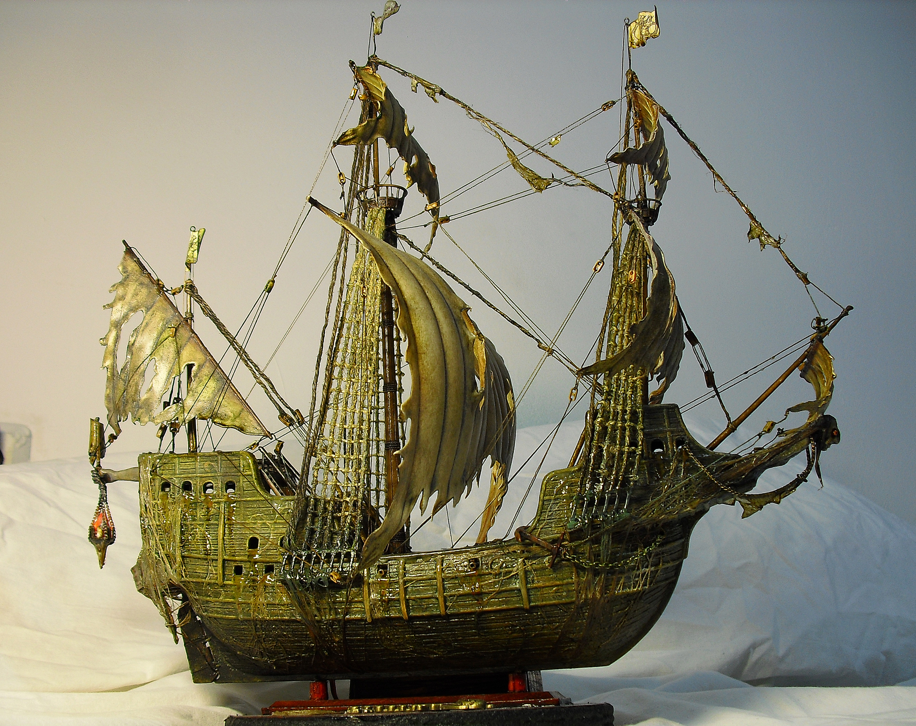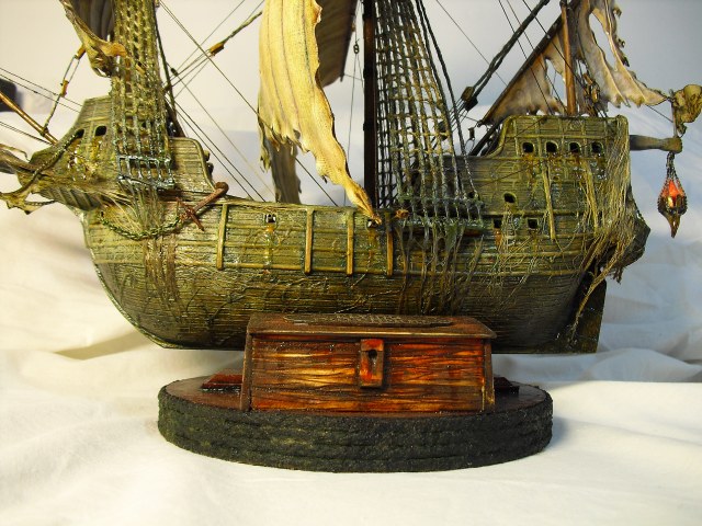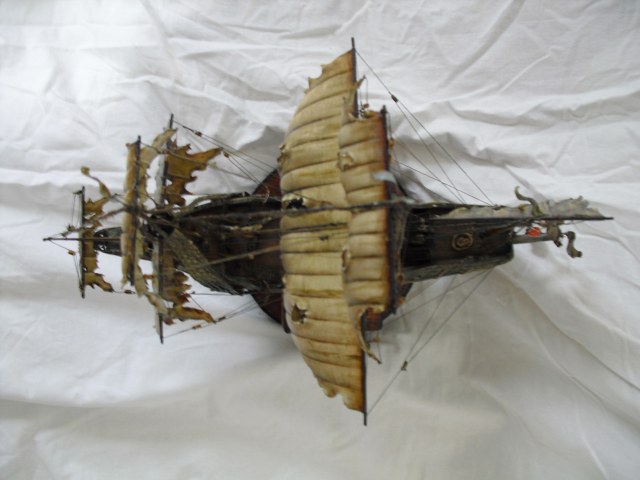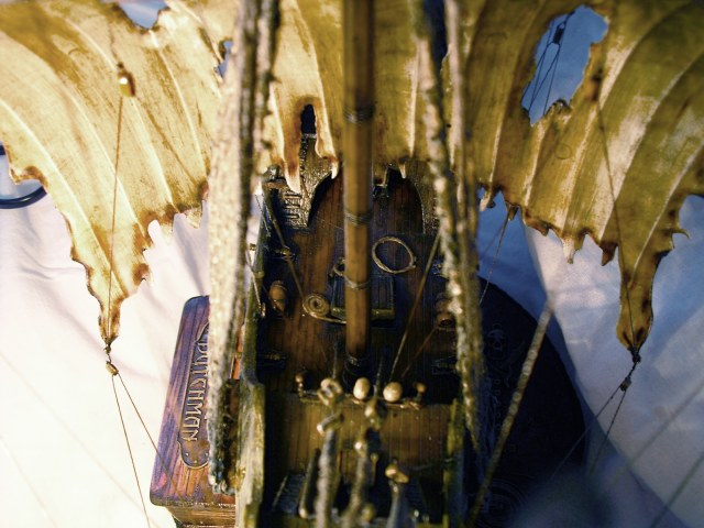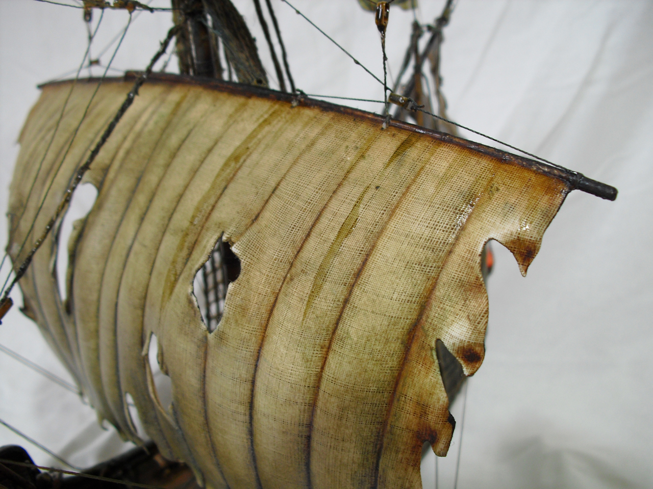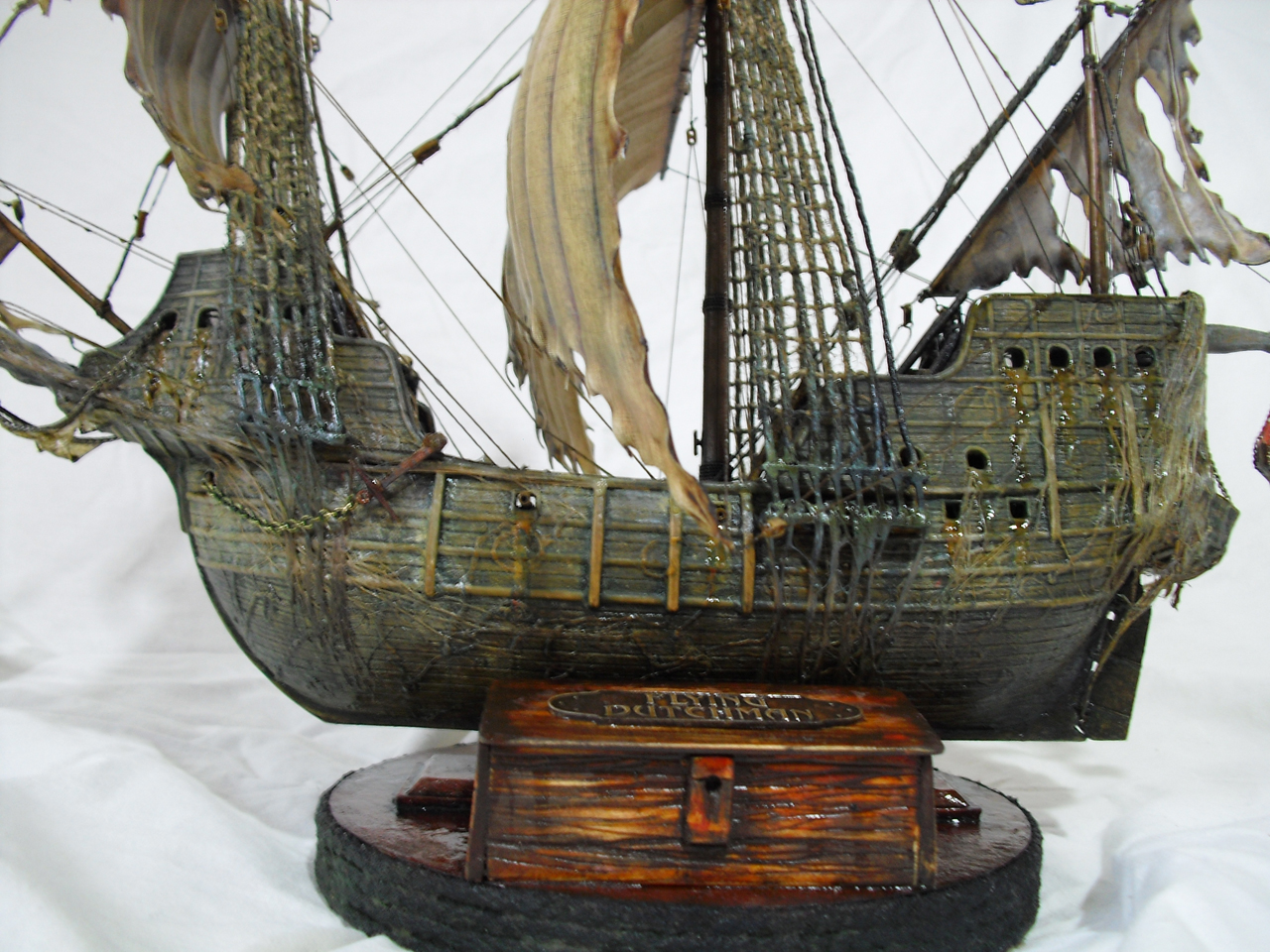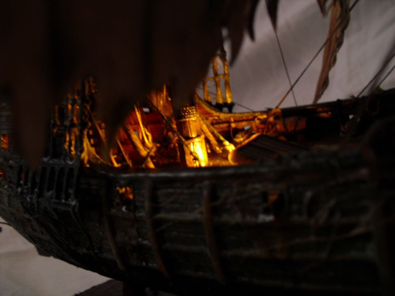 В качестве такелажа, использовал три вида нитей, веревку из льна, нить хб. и обычную нить что шла в комплекте (капроновая) для стоячего такелажа использовал нить из льна толстую, для эффекта что это типа веревка из водорослей . Пытался создать образ корабля более сказочный, нежели исторический разрушенный. Обклеивал корабль в некоторых местах чесаным льном. также немного изменил корму и носовую часть. добавил фигуру морского чудища. Скорее не фигуру а морское чудеще прикованное к судну колдовским проклятием. Так же пытался сделать на корме вид руки которая держит флаг с факелом или типа огненным светильником. Саму модель поставил на подставку неровно, завалил правый бок, так сказать этим самым добавил модели небрежности. Огонь конечно так себе получился. Провел свет, типа на корабле горит вечный огонь для обитающих там призраков и мифических существ. ------ --фото шоп использовал только на первой фотке. та что на заставке.---------