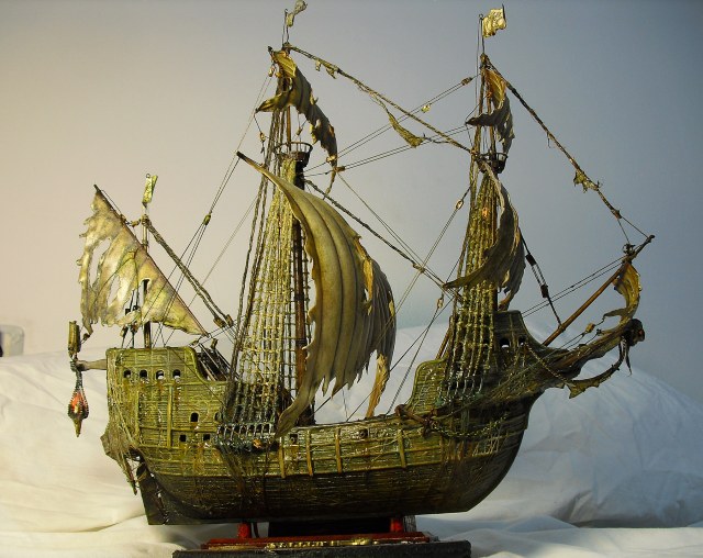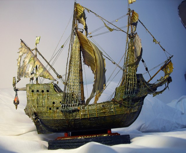 Очень добрая для корабля-призрака вышла гальюнная фигура. В целом корабль вызывает положительные эмоции. Интересный окрас корабля. Минус- стоит кривовато. Белый шар.