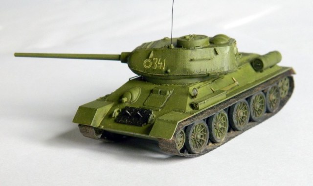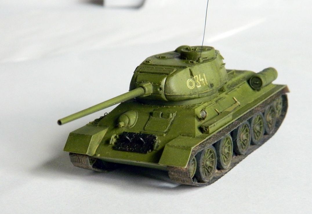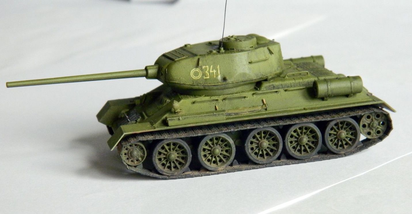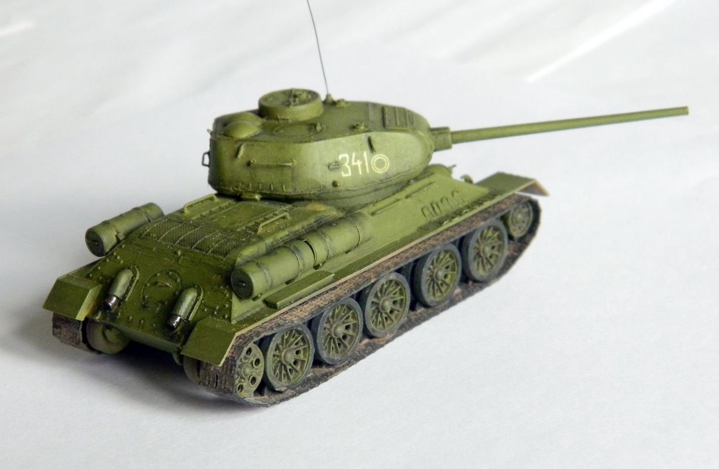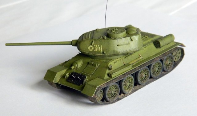 Вашему вниманию всем известная модель т34-85 от звезды,пришлось некоторые неточности исправить ,но не все конечно же. по башне добавлены рымы,крышки бойниц,смотровой прибор по правому борту, проволочные петли для скатки,поручни,антенка из кисти,литьевой шов,приливы от литья башни