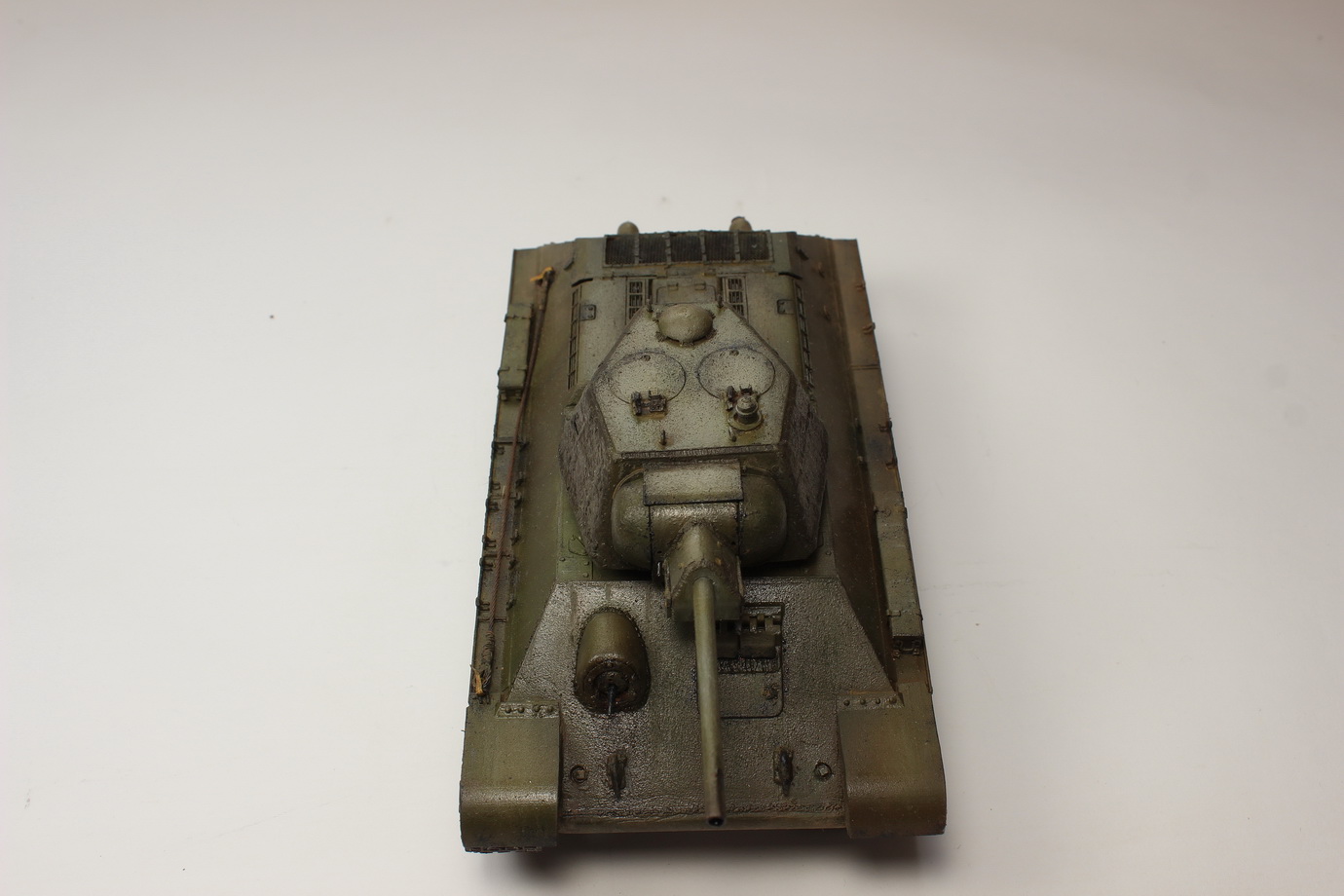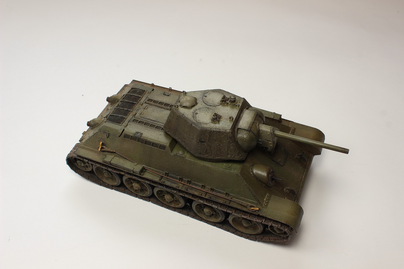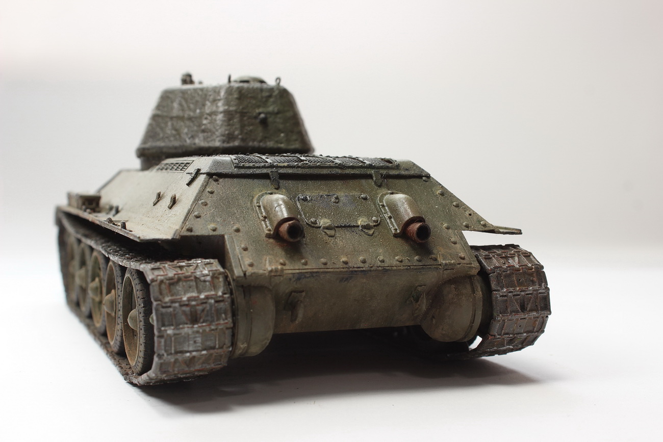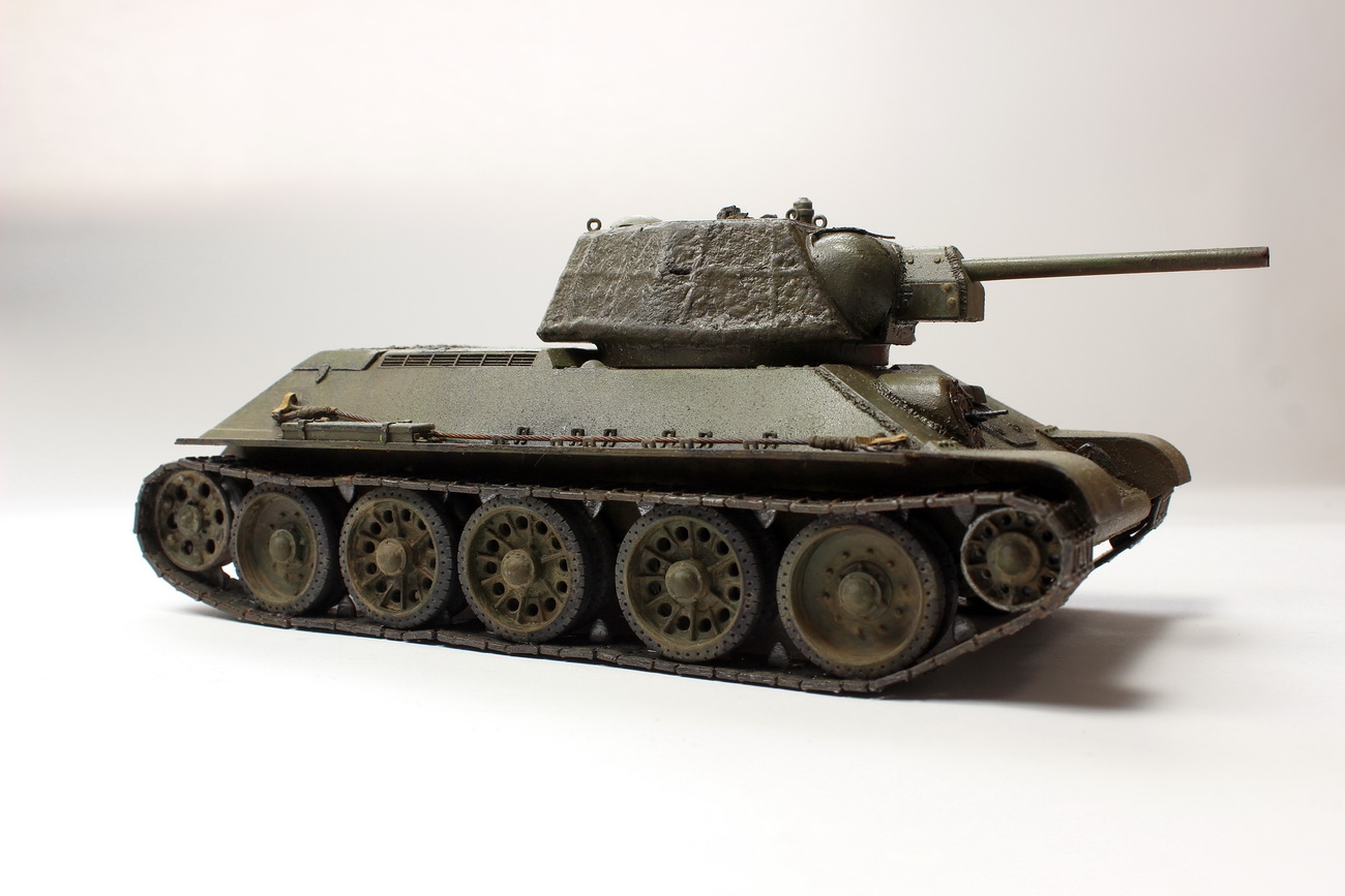 Всем доброго времени суток. Хочу представить Вам Т-34-76 1942г. производства Нижне Тагильского завода № 183. Использовал корпус и башню от "ЗВЕЗДЫ", а от "МСД" траки, катки и "колокол". На башне, с помощью тянутого литника и шпаклёвки, сымитировал литую поверхность. Ствол выточил из металла. Пулемёты из мед. иголок. При покраске исползовал краску "ХОМА", масляные краски, пастель.