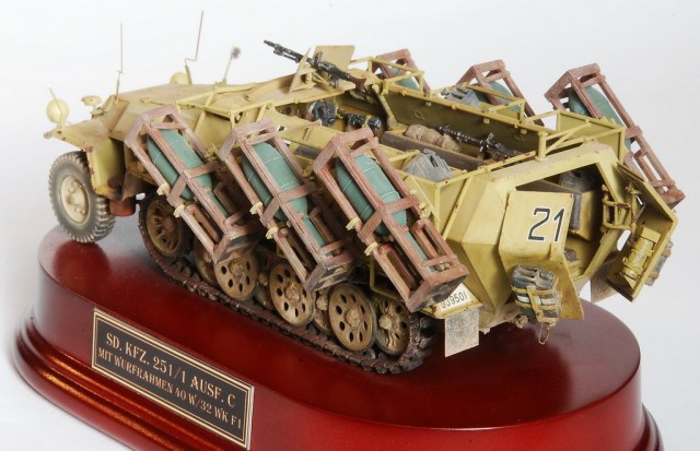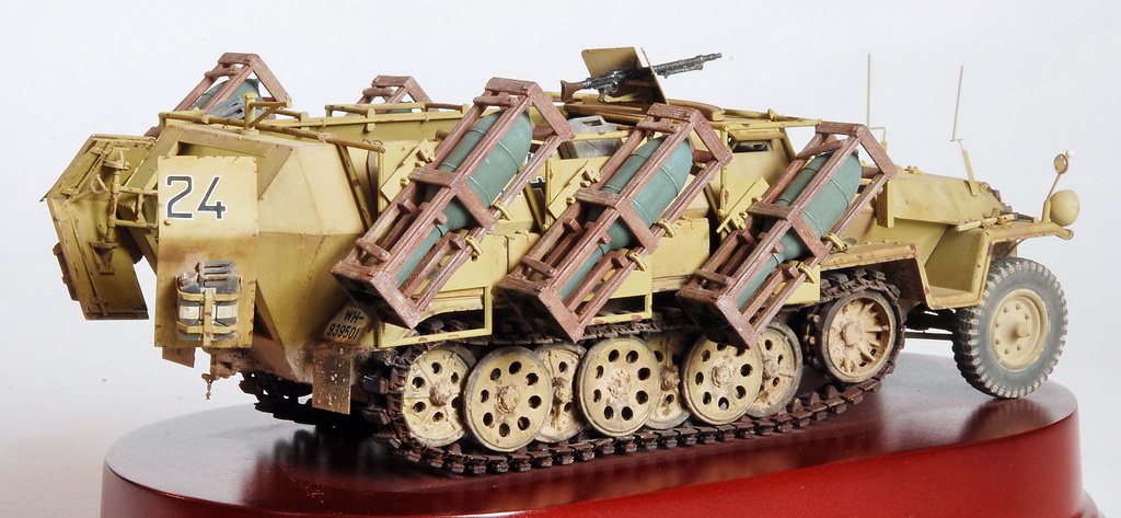 Сначала небольшая историческая справка по данной машине. Для механизированных частей Вермахта была разработана версия schweres Wurfgeraet 40 (Holz) — конструкция тип «40», которая могла крепиться на полугусеничные бронетранспортеры. Наиболее распространенная модификация — полугусеничный бронетранспортер Sd.Kfz.251/1, на бортах которого монтировалось шесть метательных аппаратов для стрельбы 280-мм и 320-мм реактивными минами. Полное название подобной артсистемы «звучало» следующим образом — Mittlerer Schutzen-panzerwagen mit Wuhrfrahmen или более коротко — Wurfrahmen 40. Как уже упоминалось, контейнеры с реактивными снарядами располагались по обоим бортам корпуса БТР по три с каждой стороны. В вертикальной плоскости они наводились (то есть задавался угол возвышения) в секторе от +5° до +40° с помощью специального механизма наведения. Наводка в горизонтальной плоскости обеспечивалась поворотом машины. Для более точного горизонтального наведения на броне силового отделения (двигателя) имелись два штыря длиной 400 мм, которые облегчали установку машины в заданном положении оси стрельбы. Сами ПУ производились берлинской фирмой «Й. Гаст АГ» (J. Gast).