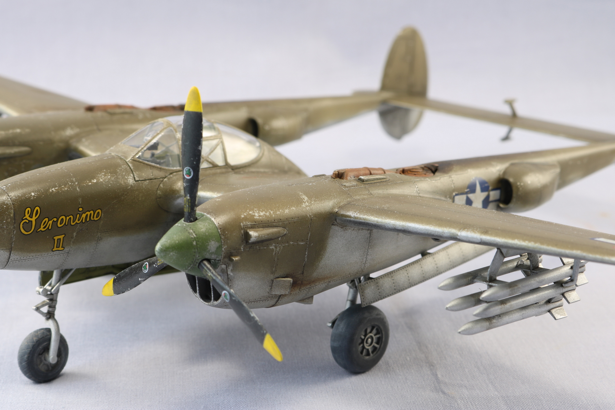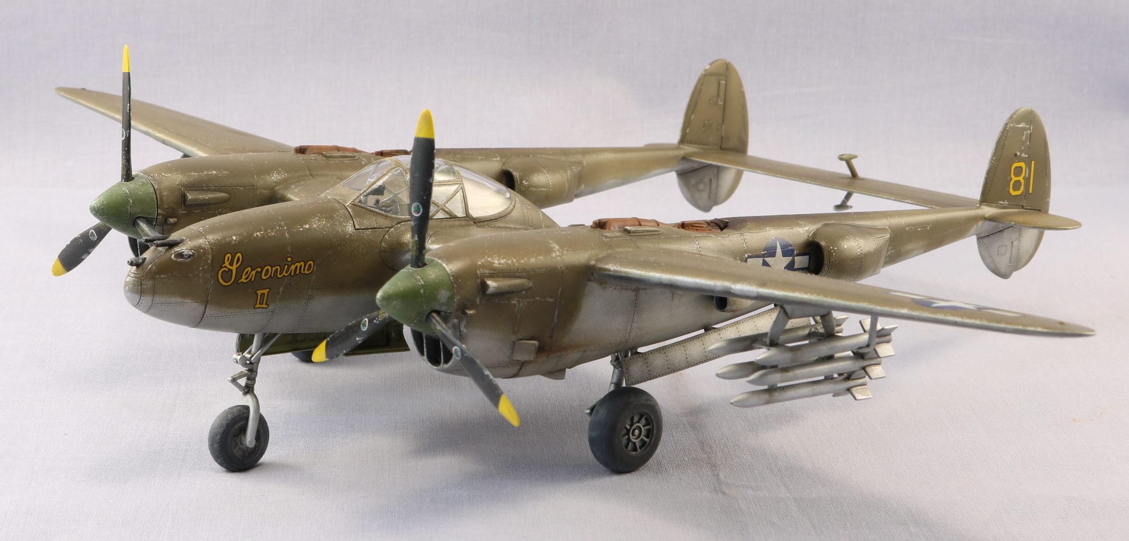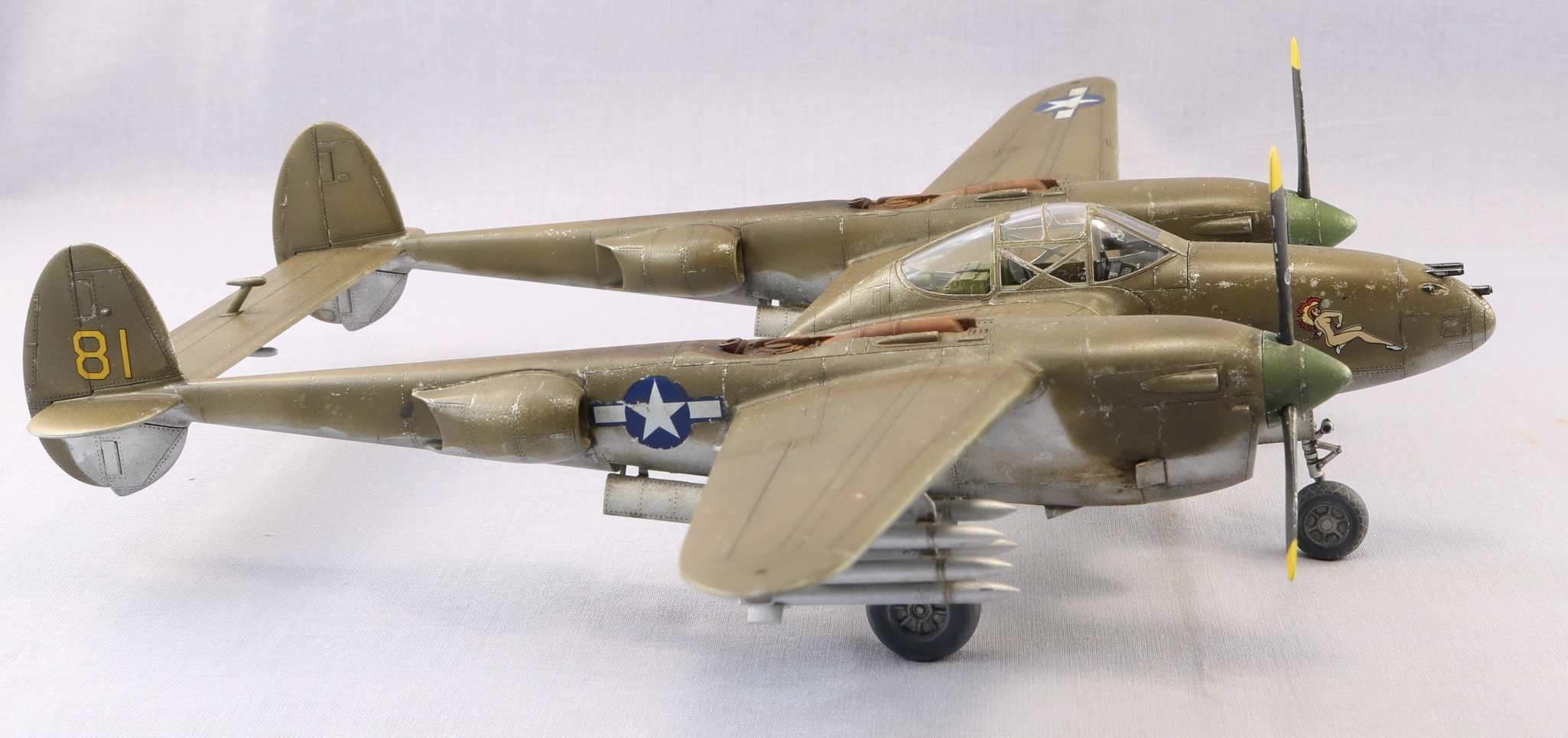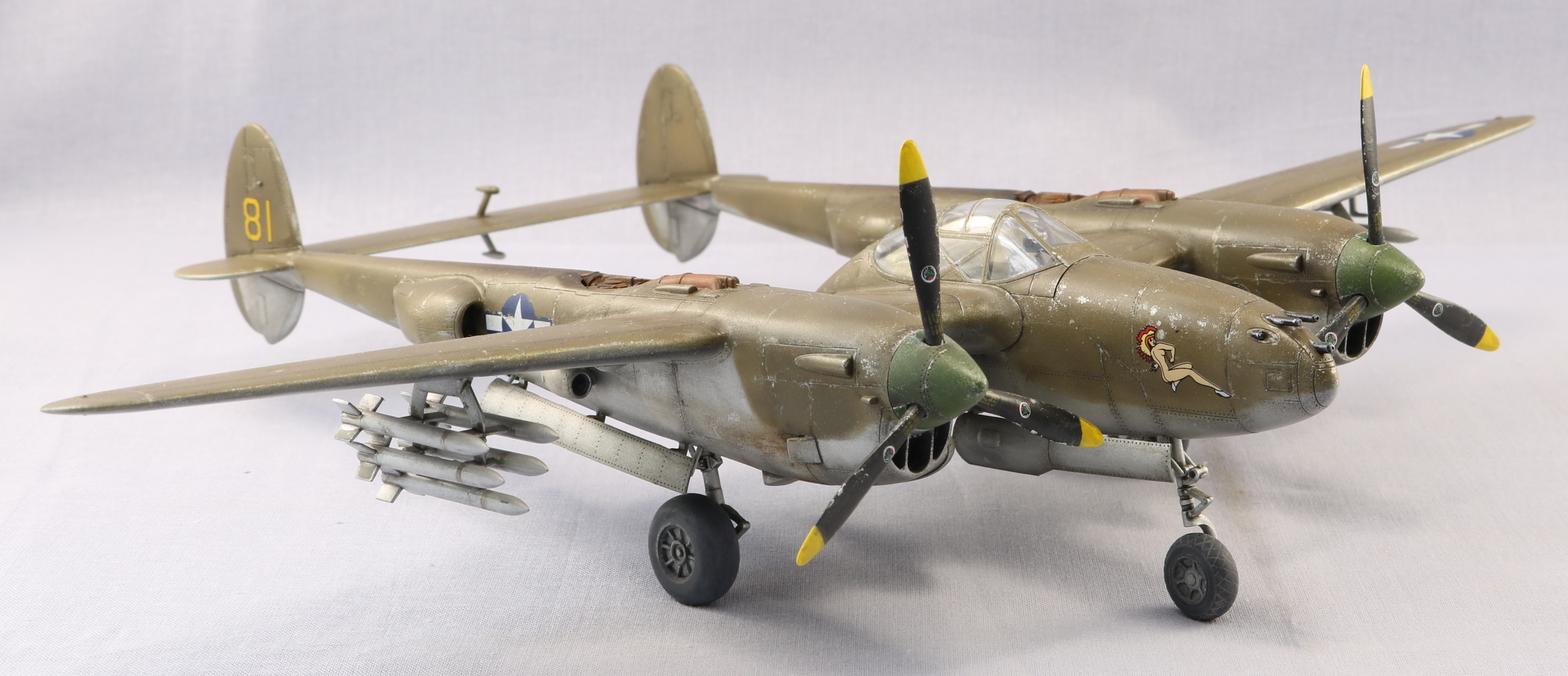 Доброго времени уважаемые коллеги. Снова захотелось полетать. P-38 один из моих любимых самолетов. Но так как это мой второй самолет кит я выбрал от HobbyBoss. Исключительно по ценовому выбору. Очень удивился когда открыл коробку тому что самолет практически весь состоит из двух половин. Поэтому сборка очень быстрая. Красил красками Gunze Sangyo, тонировал масляными красками. Тут уже ушатывал сознательно. Топлевные баки не клеел, т.к. есть еще авиабомбы. Но с баками смотрится солидней. На этом вроде бы все. Спасибо за внимание. Жду ваших советов и критику. С уважением.