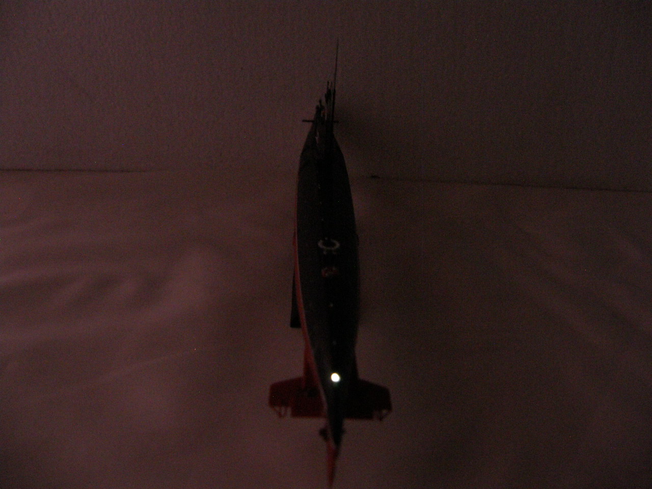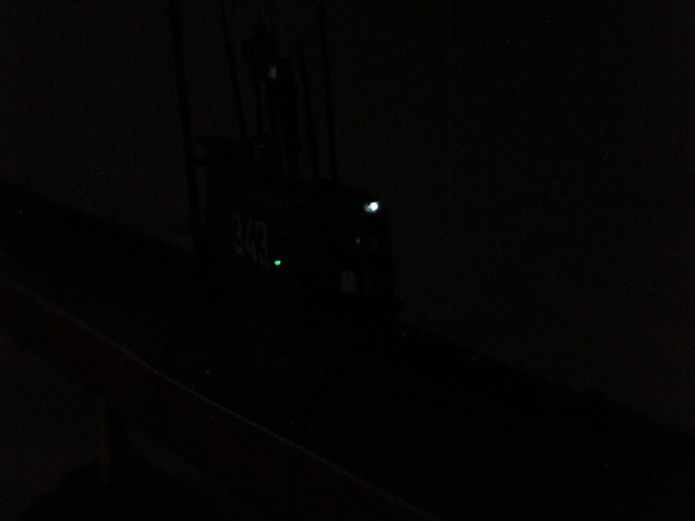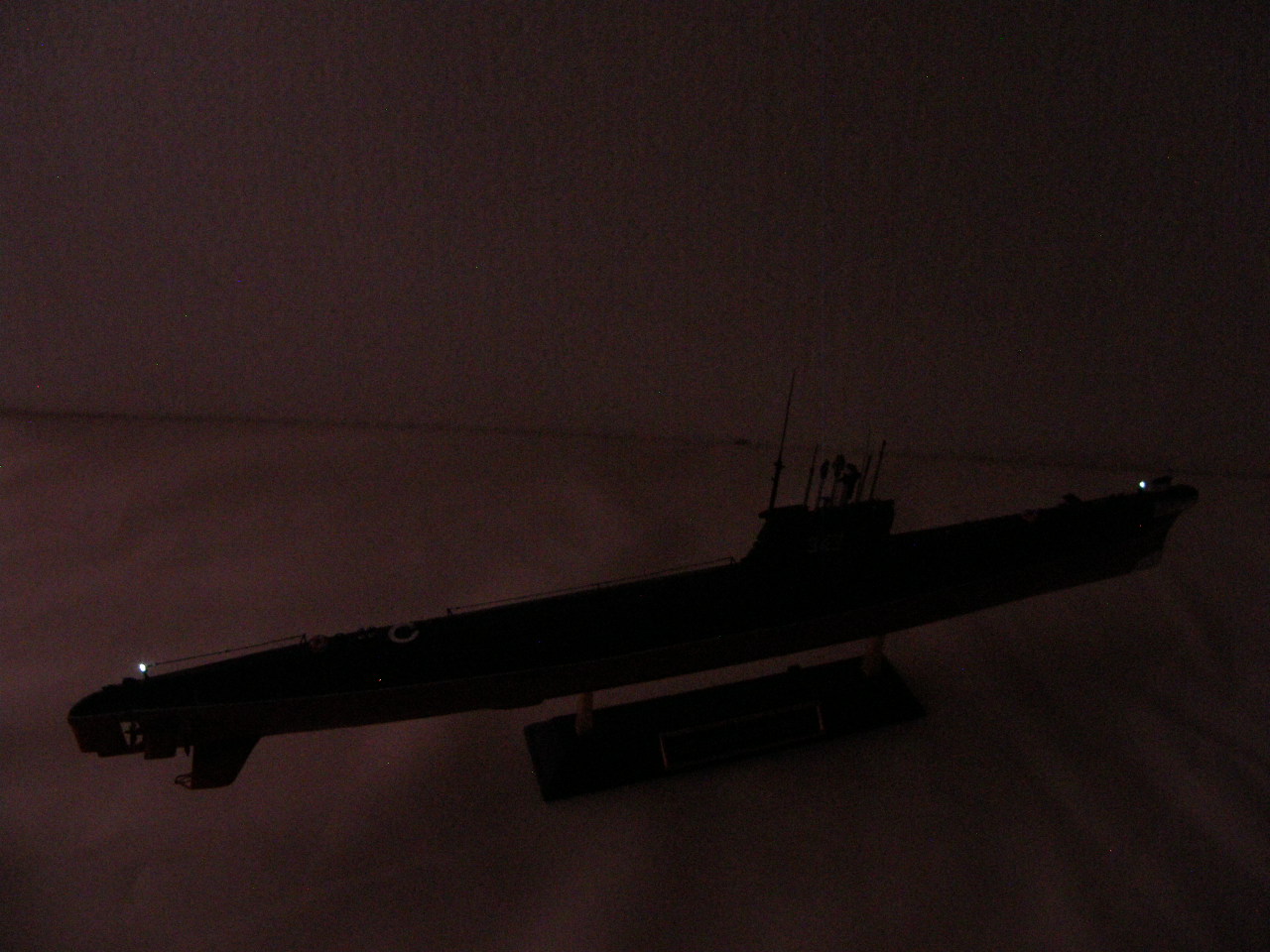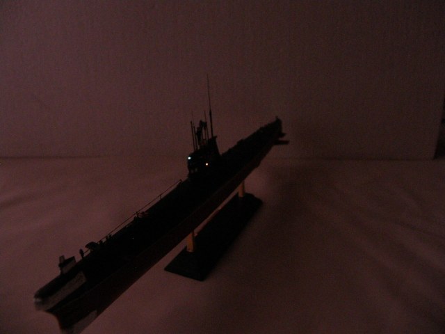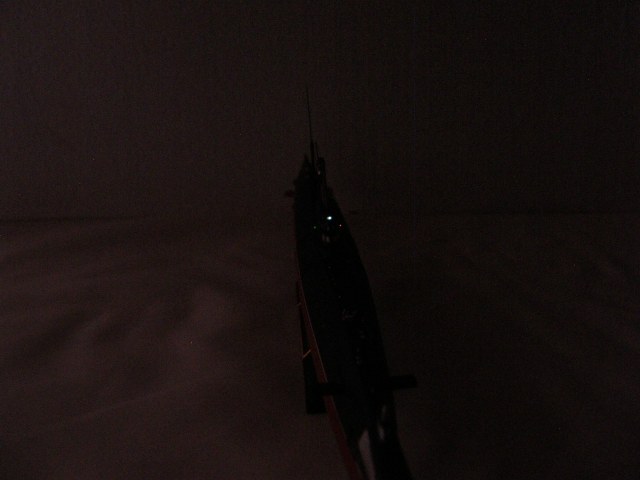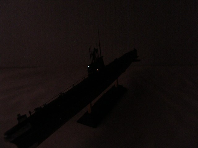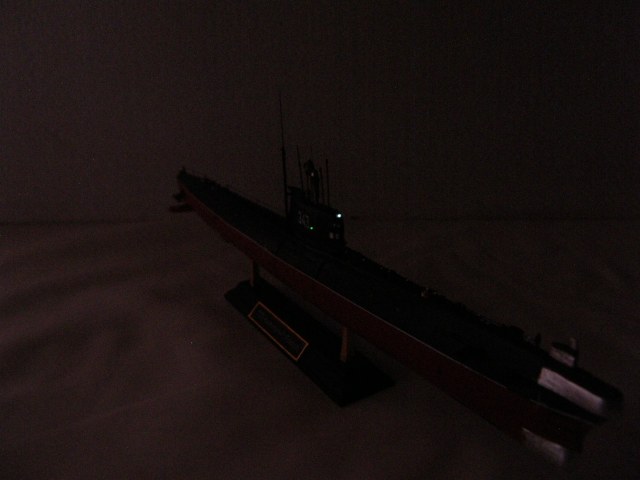 Кроме того, с помощью светодиода сделаны действующие ходовые и якорные огни. Поскольку модель лодки сделана на момент 1967 года, то действующие огни выполнены в соответствии с ППСС-60 (правила предупреждения столкновения судов в море): топовый, бортовые, гакабортный кормовой и якорные огони, добавлено внутреннее освещение мостика. Идея огней закладывалась одновременно с закладкой модели и выполнена в ходе строительства.
