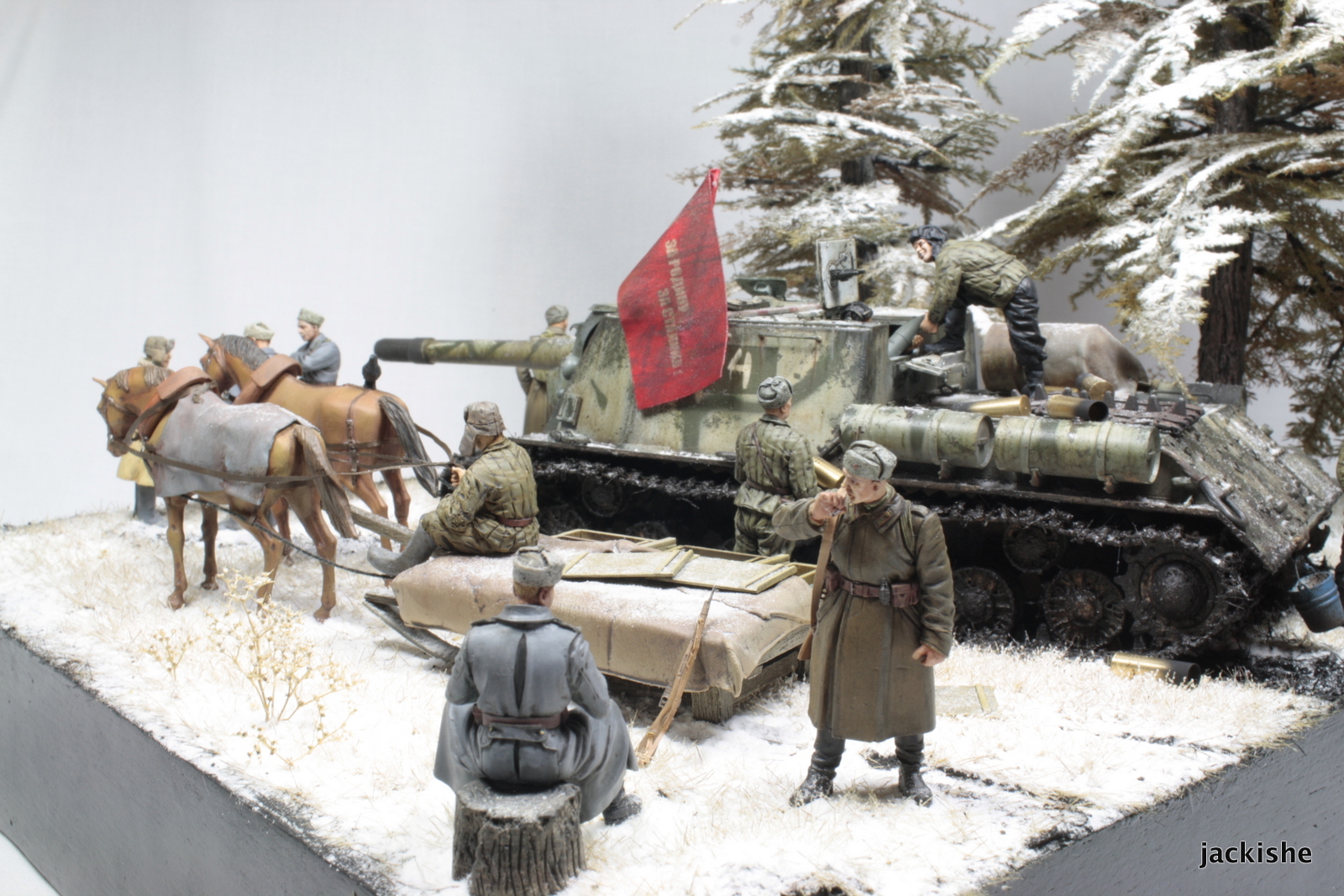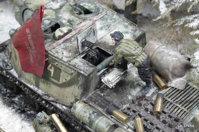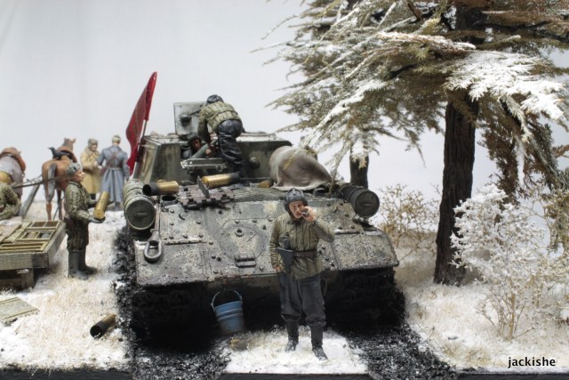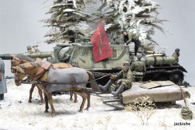 По задумке хотелось показать привал экипажа саудля пополнения боеприпасов, и парралельно отдых бойцов пехоты сопровождающей ее.
