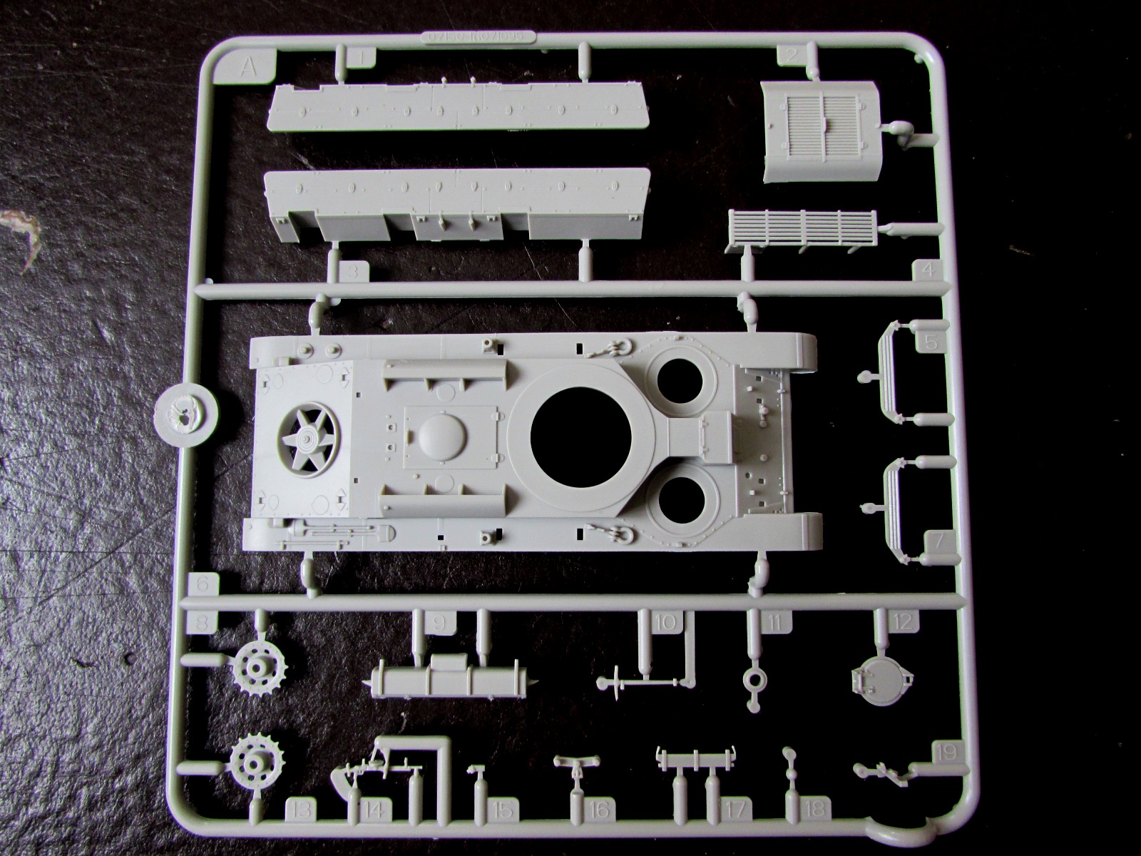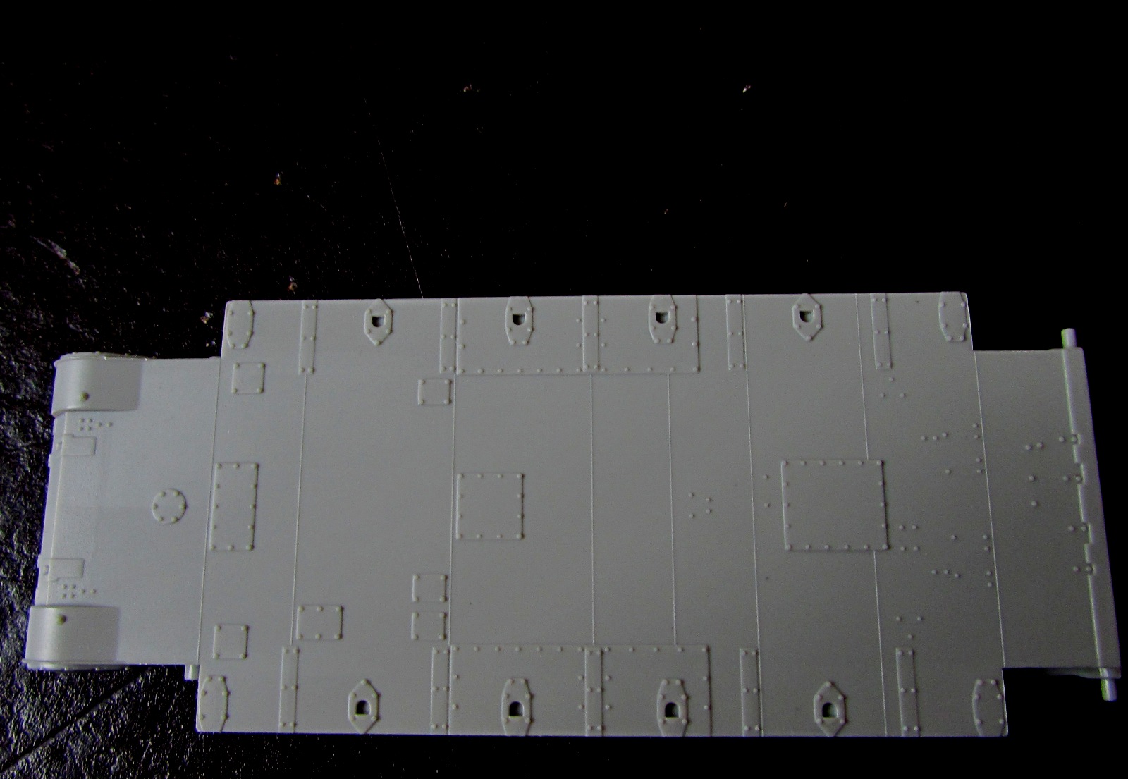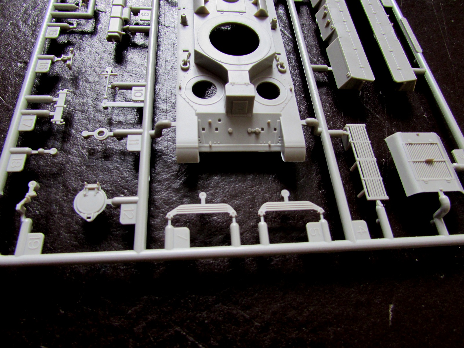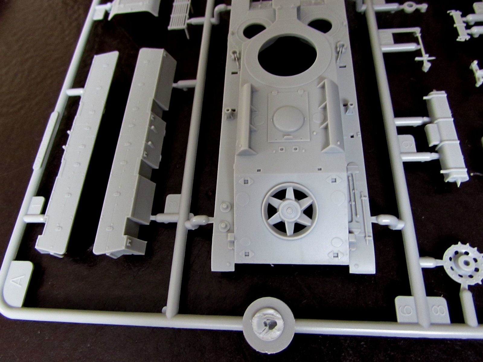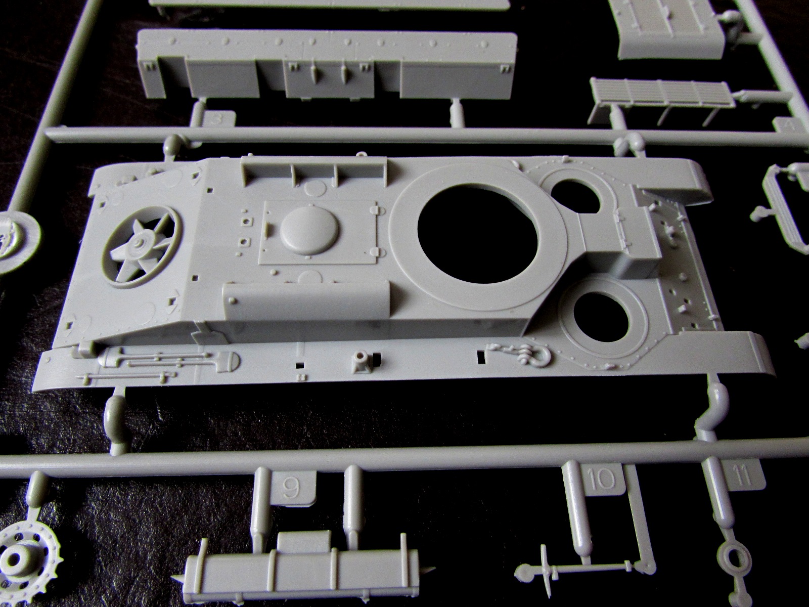 1. Корпус отлит очень неплохо неплохо. Единственный минус - если не ошибаюсь, то по бортам не хватает клепки. Во всяком случае, Моделкряковский Т-28 имет клепку даже на надгусеничных полках - чего все-таки здесь нет.