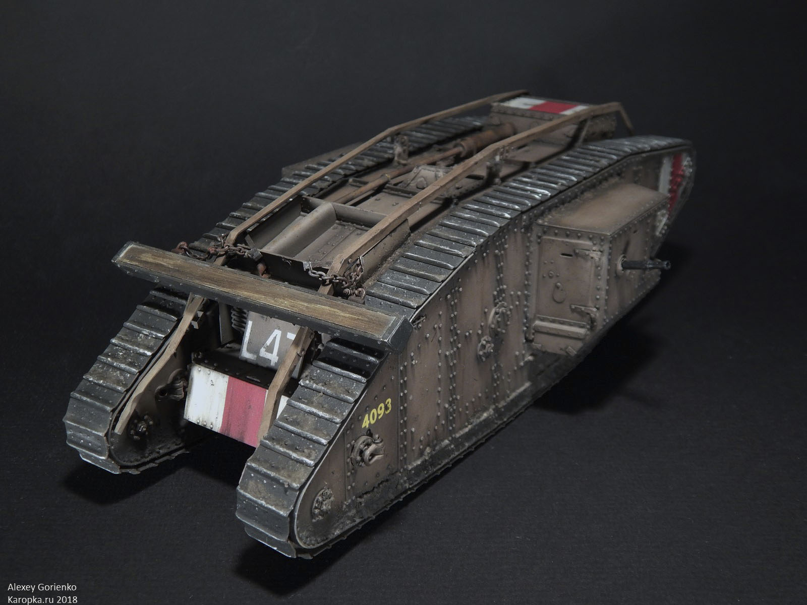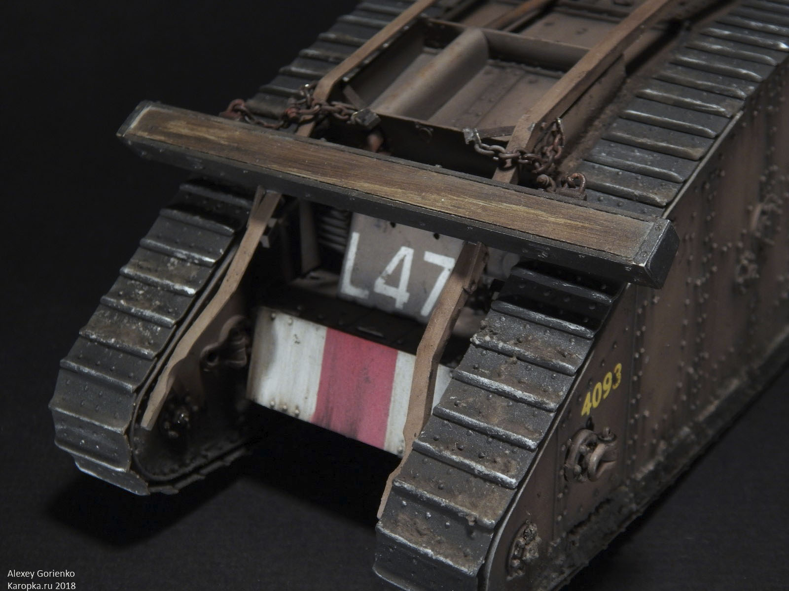 Далее, все стандартно - окрашено Тамиевским акрилом, везеринг масляными красками и художественными пигментами. А еще, это первая модель, которую я полностью испортил на этапе смывки. Пришлось смыть все в Кроте, заново покрасить, и делать смывку постепенно, небольшими участками. Благодаря обилию заклепок - крайне нудный и утомительный процесс. Так же, тяжело далась грязь. Я не люблю обильно грязные модели, но танки Первой Мировой буквально ползали целиком в грязи(гусеницы то шли вокруг корпуса, никаких вам грязевых щитков). В общем, я загрязнил модель настолько, насколько смог, и чтобы она при этом не потеряла смотрибельный вид.