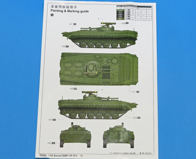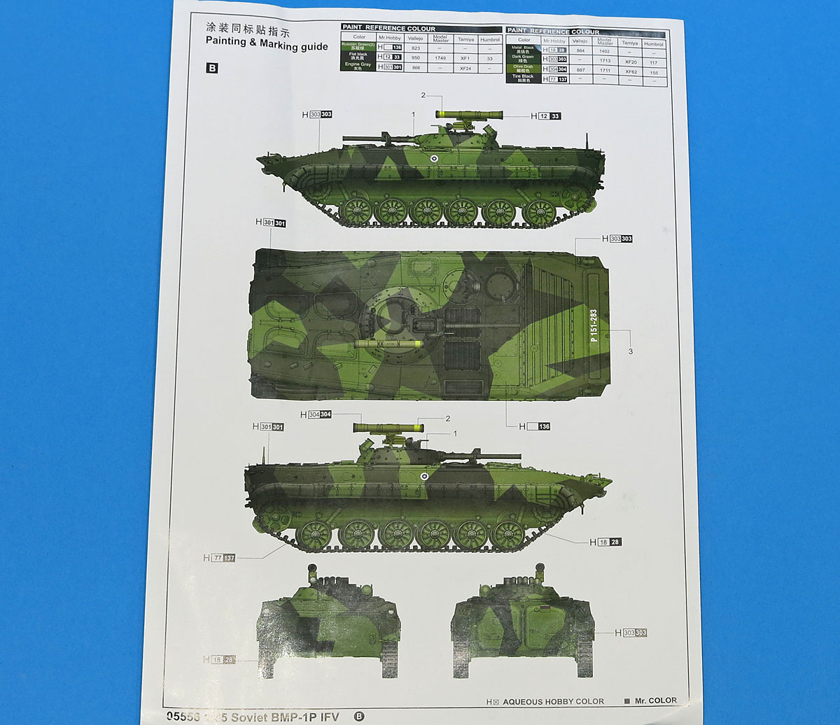 Можно добавить, что в модели воспроизведена БМП-1П раннего выпуска: с башней по типу БМП-1 (с люком перезарядки ПТУР), без дымовых гранатометов "Туча" и надбоя на башне и люках.