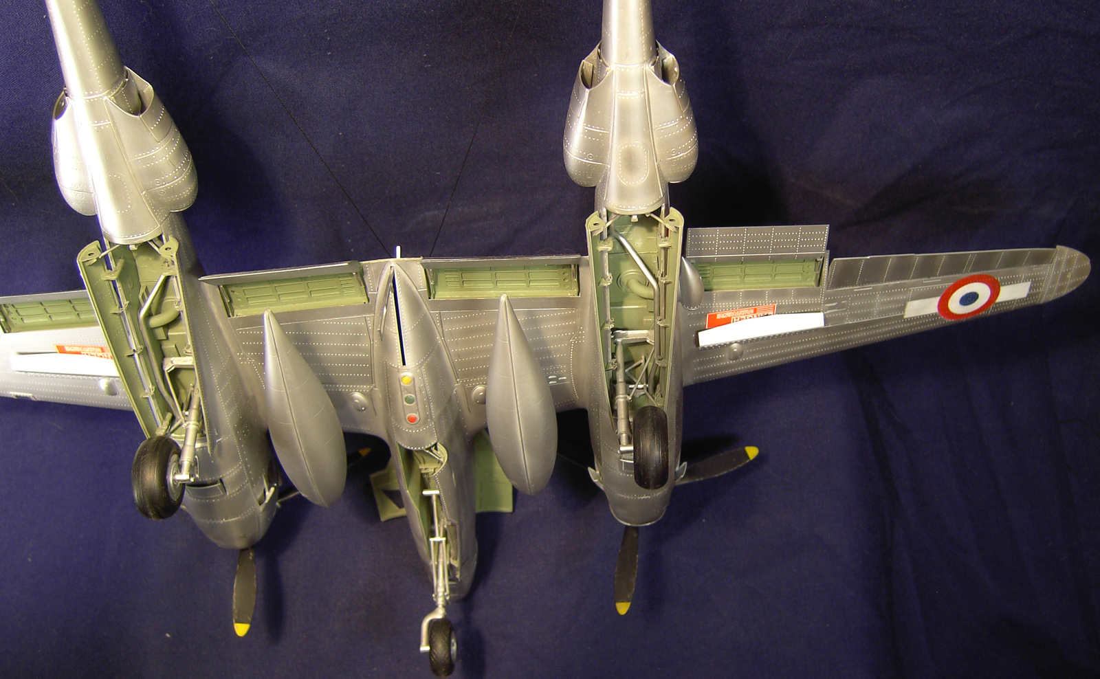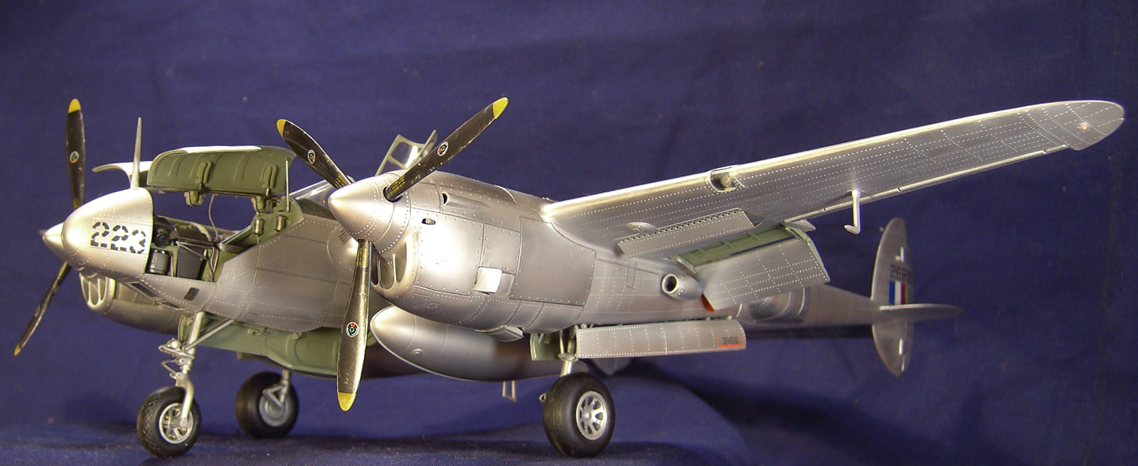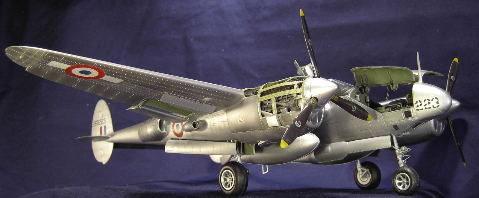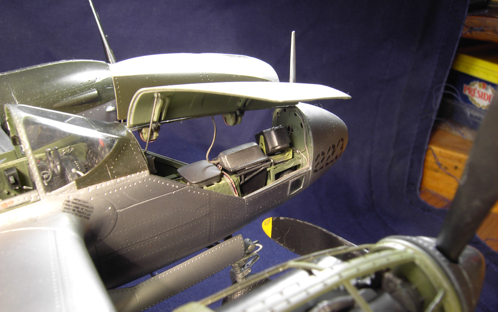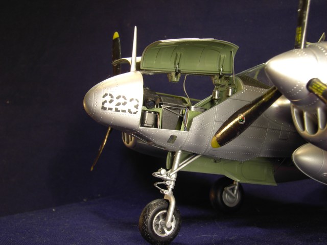 Мною был переделал нос, по найденным в сети снимкам изготовлена фотоаппаратура. Так же решил сделать открытым один двигатель. Каркас обшивки на нём выполнен из пластика. В кокпите, нишах шасси и закрылков использована травлёнка от Эдуарда.