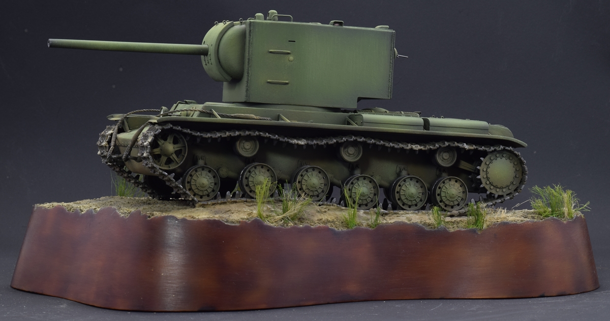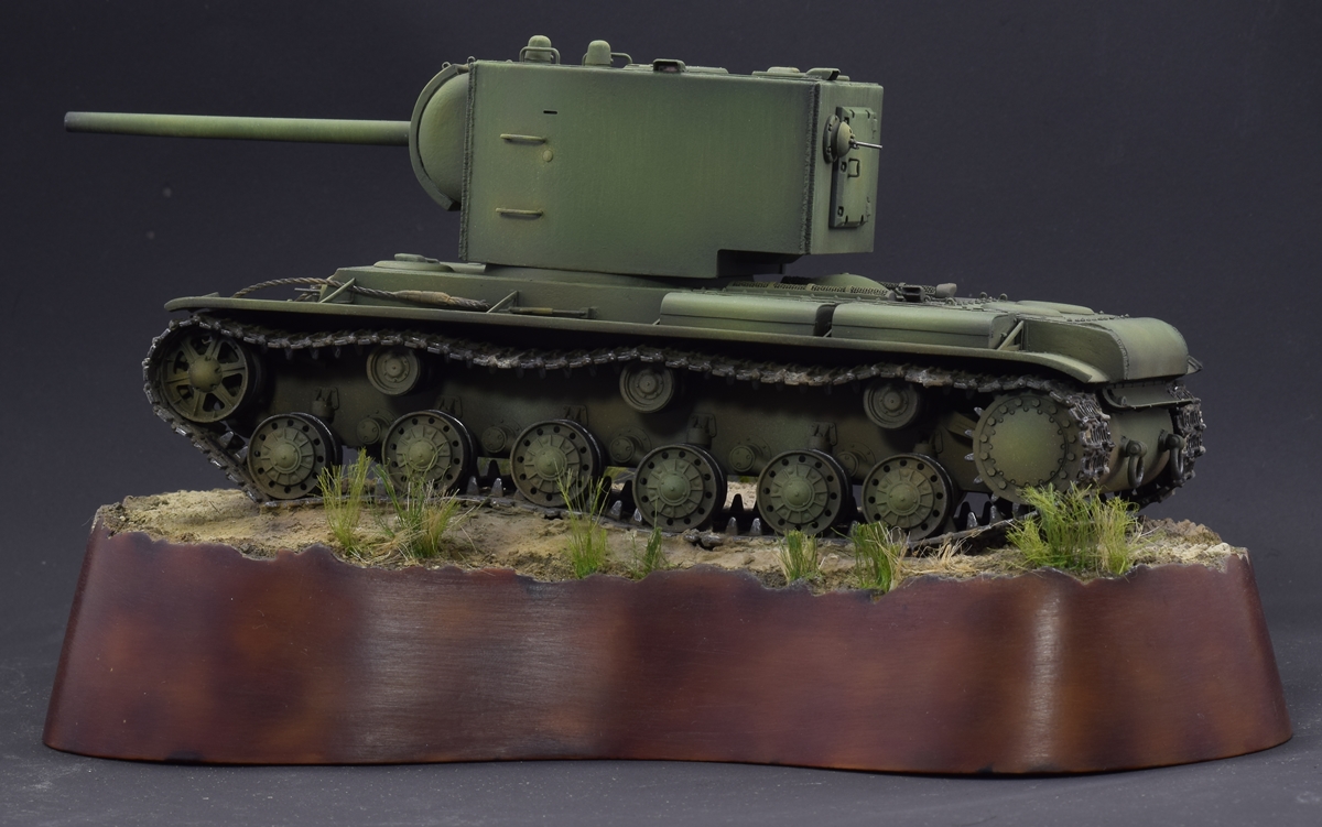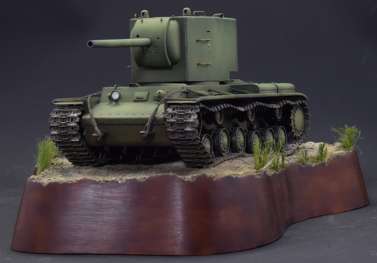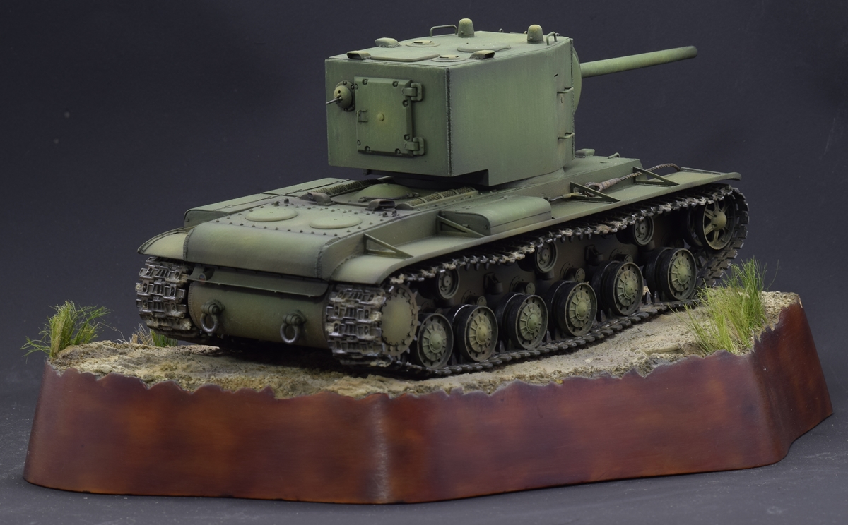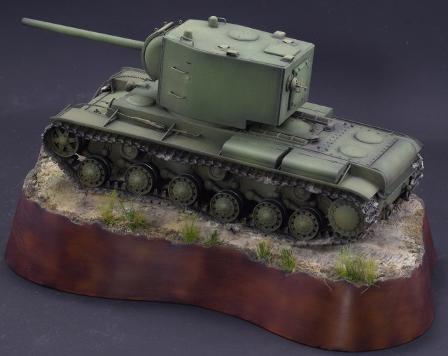 Всем привет. Очередная модель, КВ с пушкой ЗИС 6. Машина существовала в единственном экземпляре, как шасси для испытания нового орудия. Модель строилась на базе набора от Звезды КВ-2. При строительстве,постарался исправить водящиеся за набором недостатки и довести внешний вид, до соответствия с ранней версией КВ-2, с заниженной башней.Начал с удлинения ванны корпуса, ну и так далее. Из покупных допов, использованы, болты Мастер клуб и наборные гусеницы Восточный экспресс. Окрашено художественным акрилом.